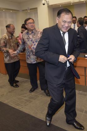 Menkeu Bambang Brodjonegoro (tengah) dan Gubernur Bank Indonesia Agus Martowardojo (kanan) meninggalkan ruangan usai mengikuti rapat kerja dengan Badan Anggaran (Banggar) DPR di Kompleks Parlemen, Senayan, Jakarta, Senin (6/7). Dalam rapat tersebut Banggar DPR menyepakati laporan dan memberikan pengesahan hasil panitia kerja (panja) dalam rangka pembahasan pembicaraan pendahuluan penyusunan RAPBN 2016. ANTARA FOTO/Sigid Kurniawan/nz/15.