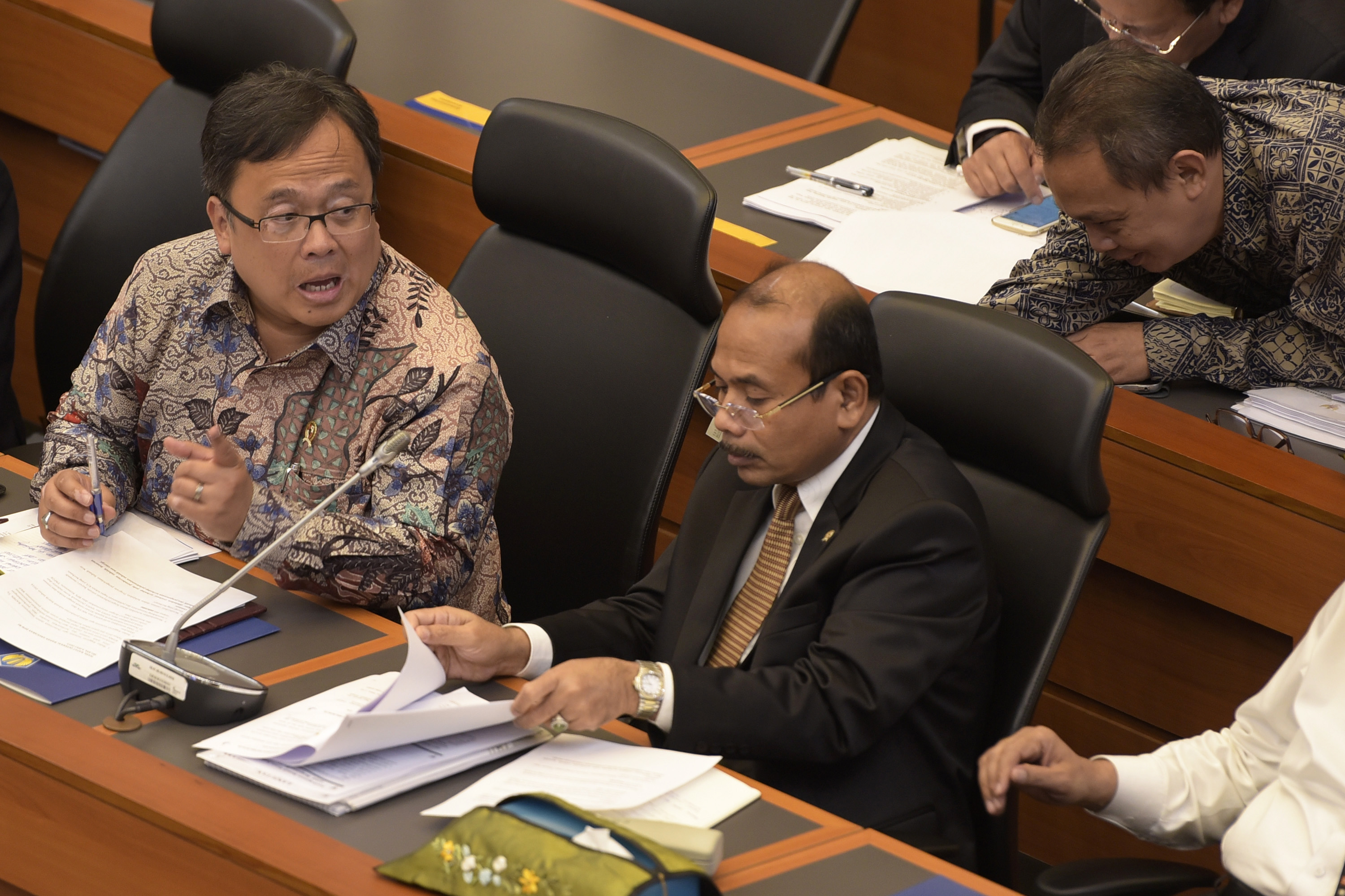 Menkeu Bambang Brodjonegoro (kiri) berbincang dengan Menteri PPN/Bappenas Andrinof Chaniago (kanan) saat mengikuti rapat kerja dengan Badan Anggaran (Banggar) DPR di Kompleks Parlemen, Senayan, Jakarta, Senin (6/7). Dalam rapat tersebut Banggar DPR menyepakati laporan dan memberikan pengesahan hasil panitia kerja (panja) dalam rangka pembahasan pembicaraan pendahuluan penyusunan RAPBN 2016. ANTARA FOTO/Sigid Kurniawan/nz/15.