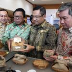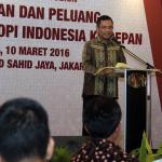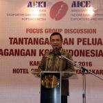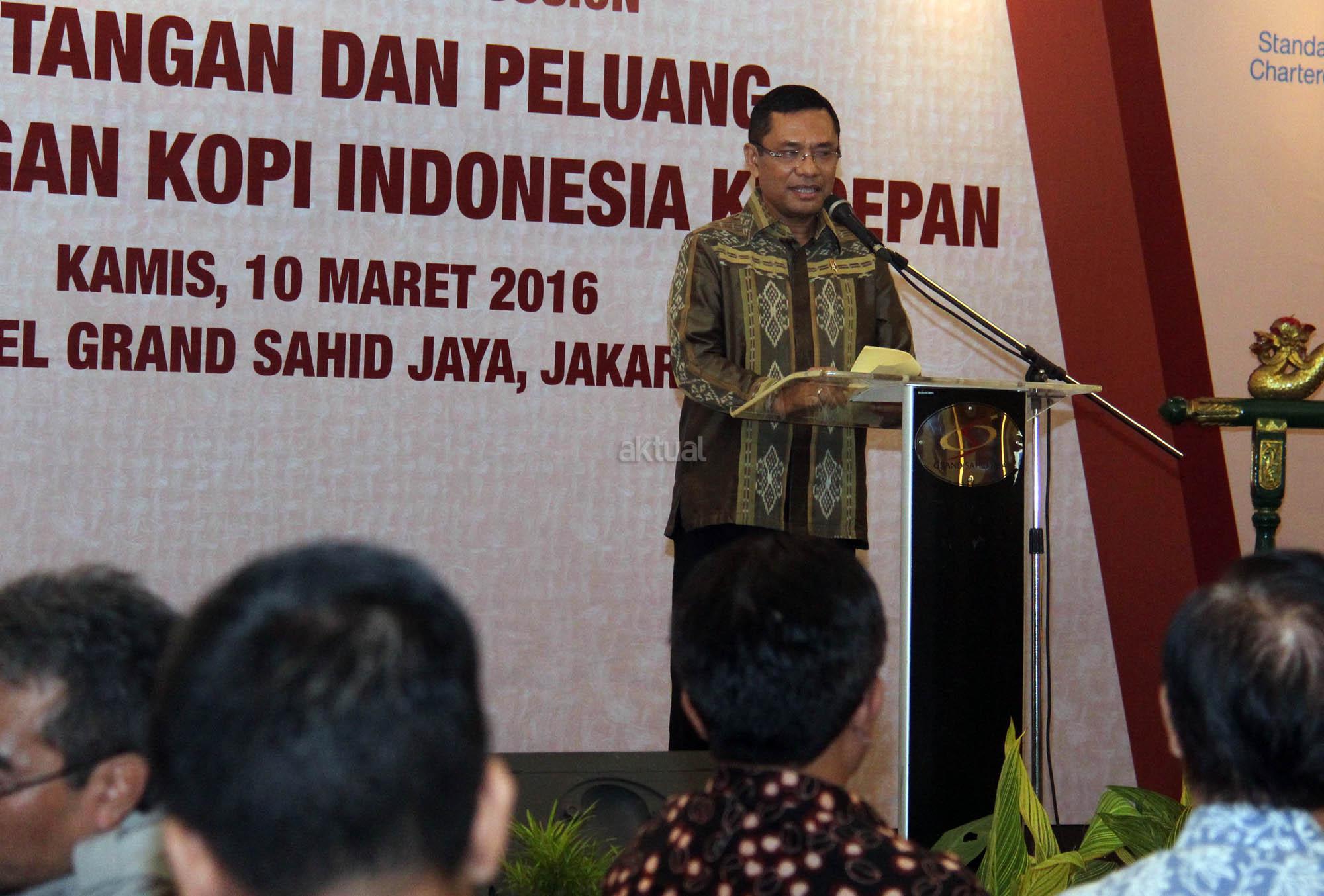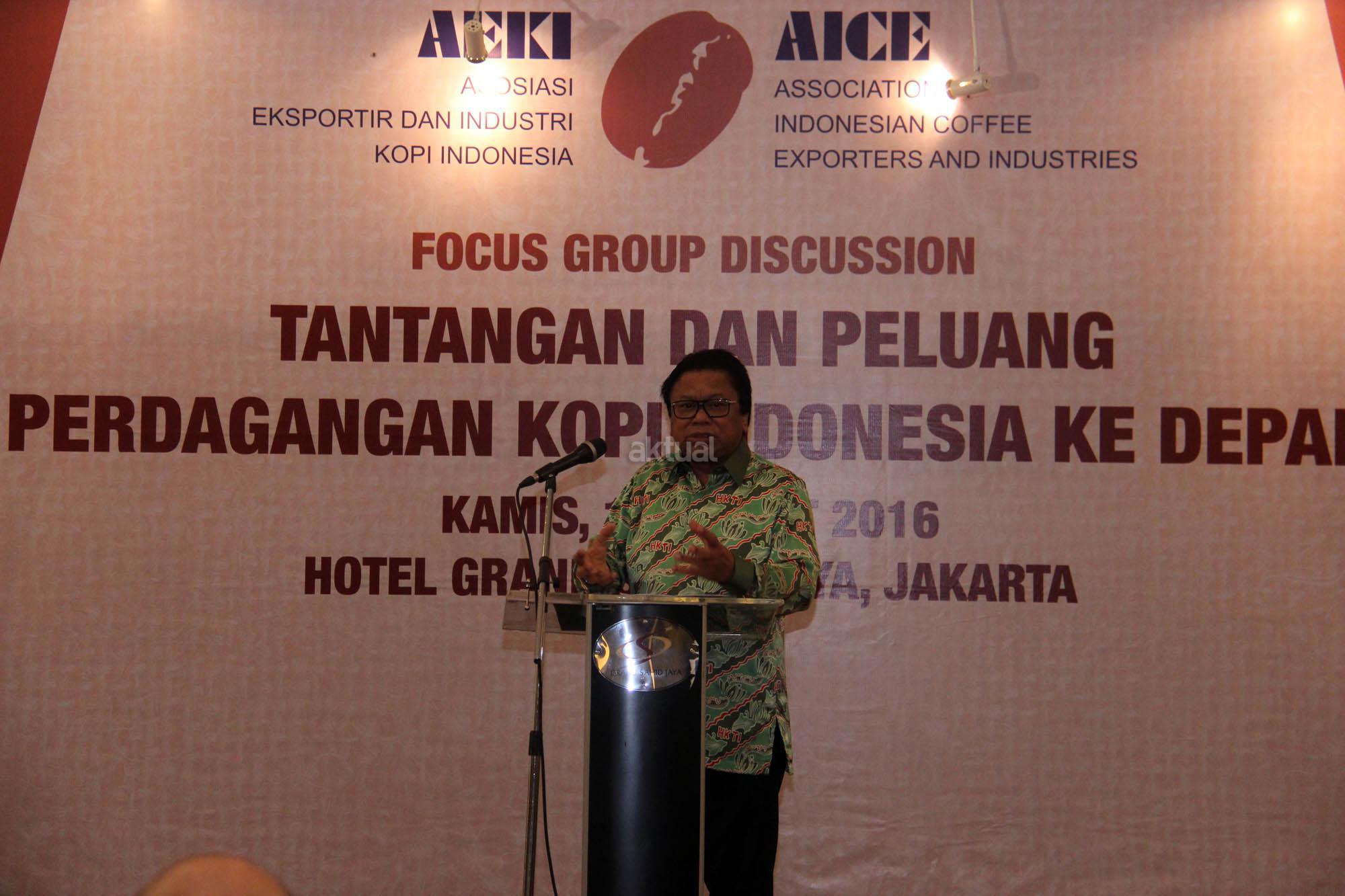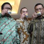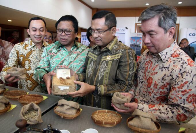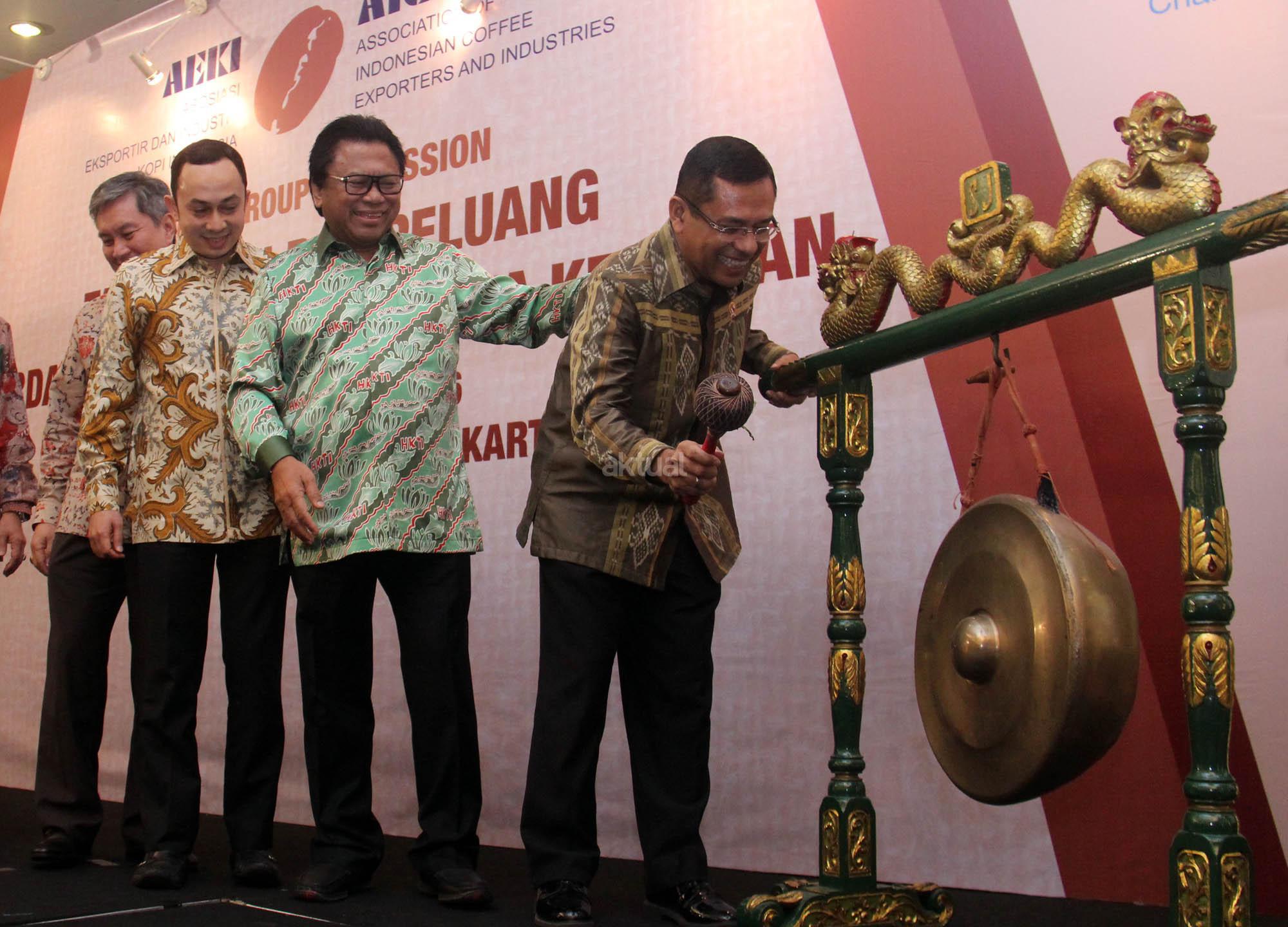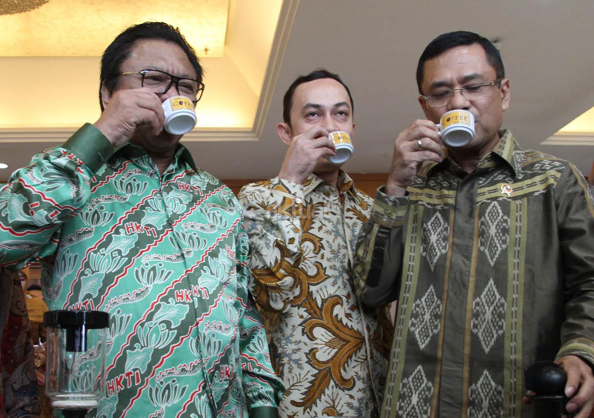 Wakil Ketua MPR-RI Oesman Sapta Odang , Meteri Perindustrian Saleh Husin dan Ketua Umum AEKI (Asosiasi Eksportir dan Industri Kopi Indonesia) Irfan Anwar saat melihat contoh kopi unggulan asal Indonesia yang dipamerkan pada kegiatan Rapat Umum Anggota IX AEKI di Hotel Sahid-Jakarta,Kamis (10/3). FOTO : AKTUAL/JUNAIDI MAHBUB