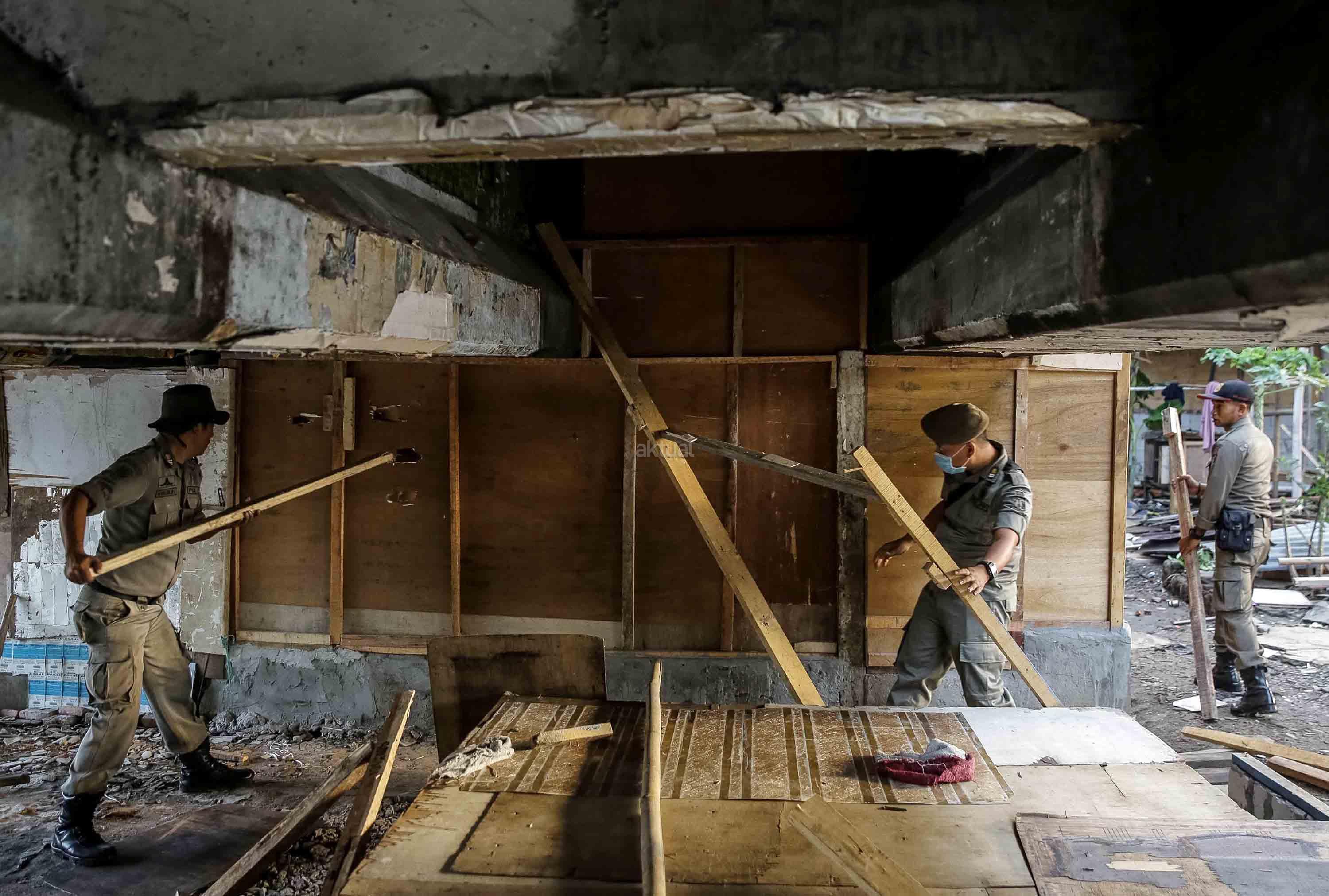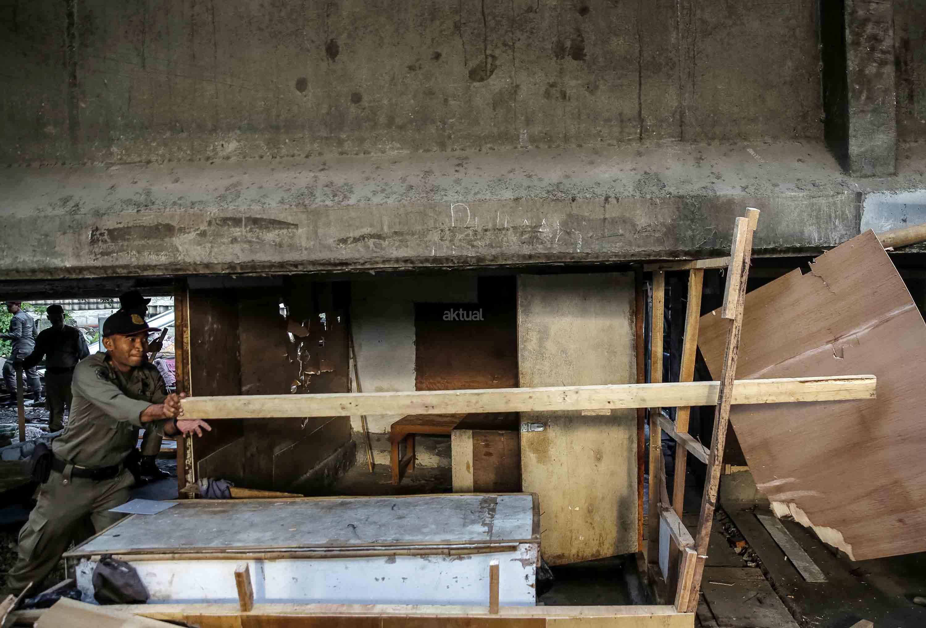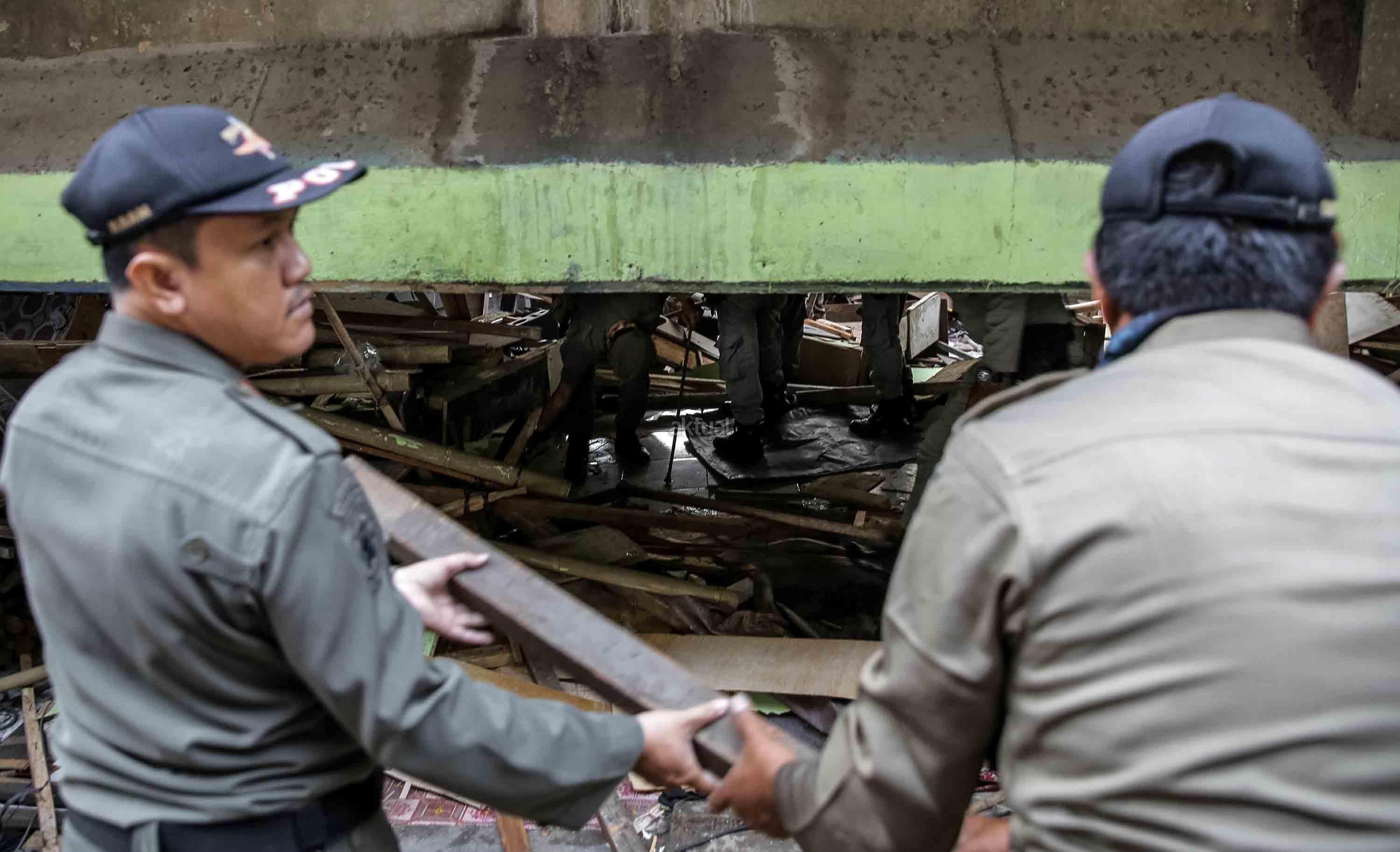 Petugas Satpol PP melakukan pembongkaran ratusan bangunan semi permanen di Kolong Tol Kalijodo, Jakarta, Rabu (14/6/2017). Rencananya, setelah ditertibkan area itu nanti akan dialihfungsikan sebagai lahan parkir tambahan Ruang Publik Terpadu Ramah Anak (RPTRA) Kalijodo yang kian membludak. AKTUAL/Tino Oktaviano