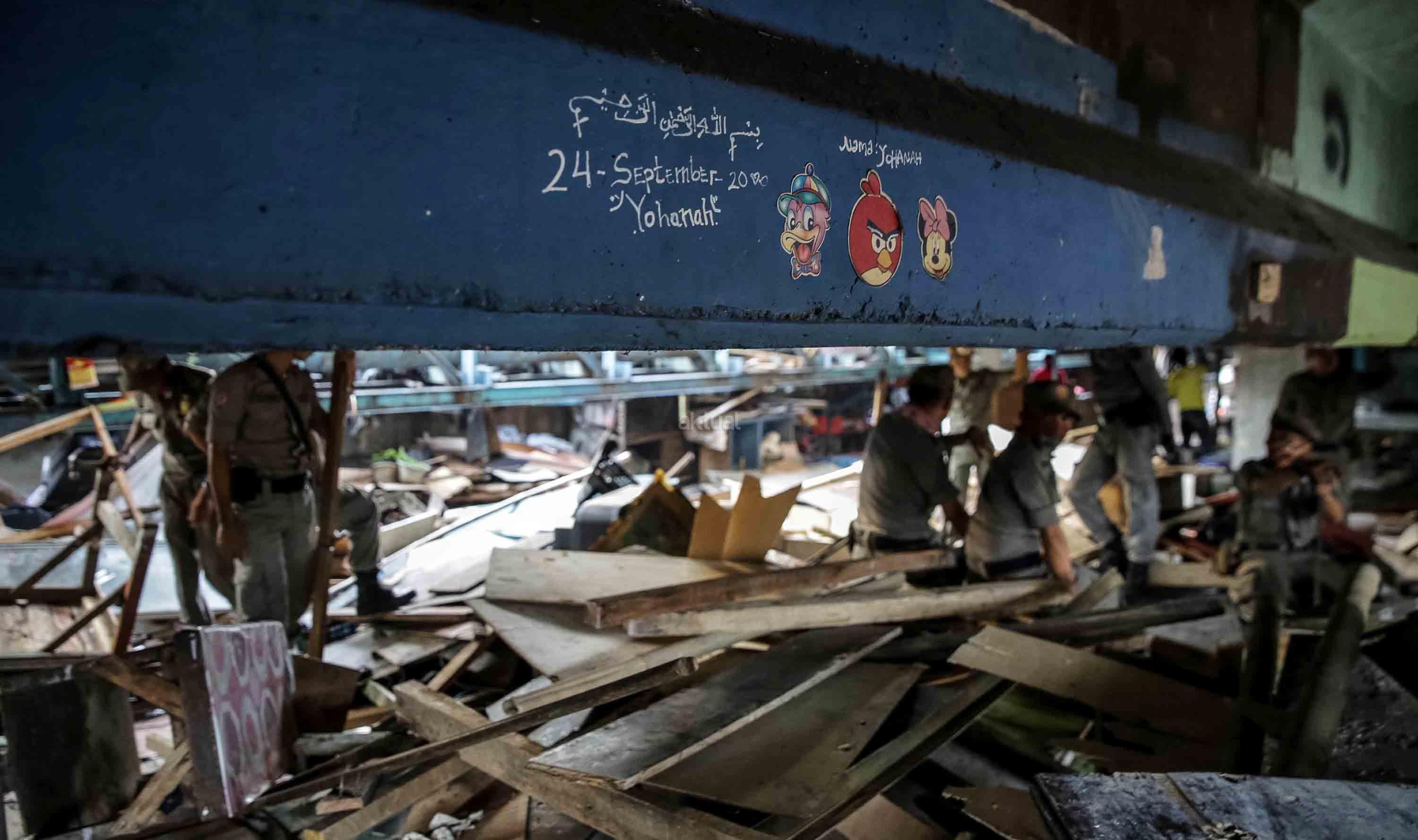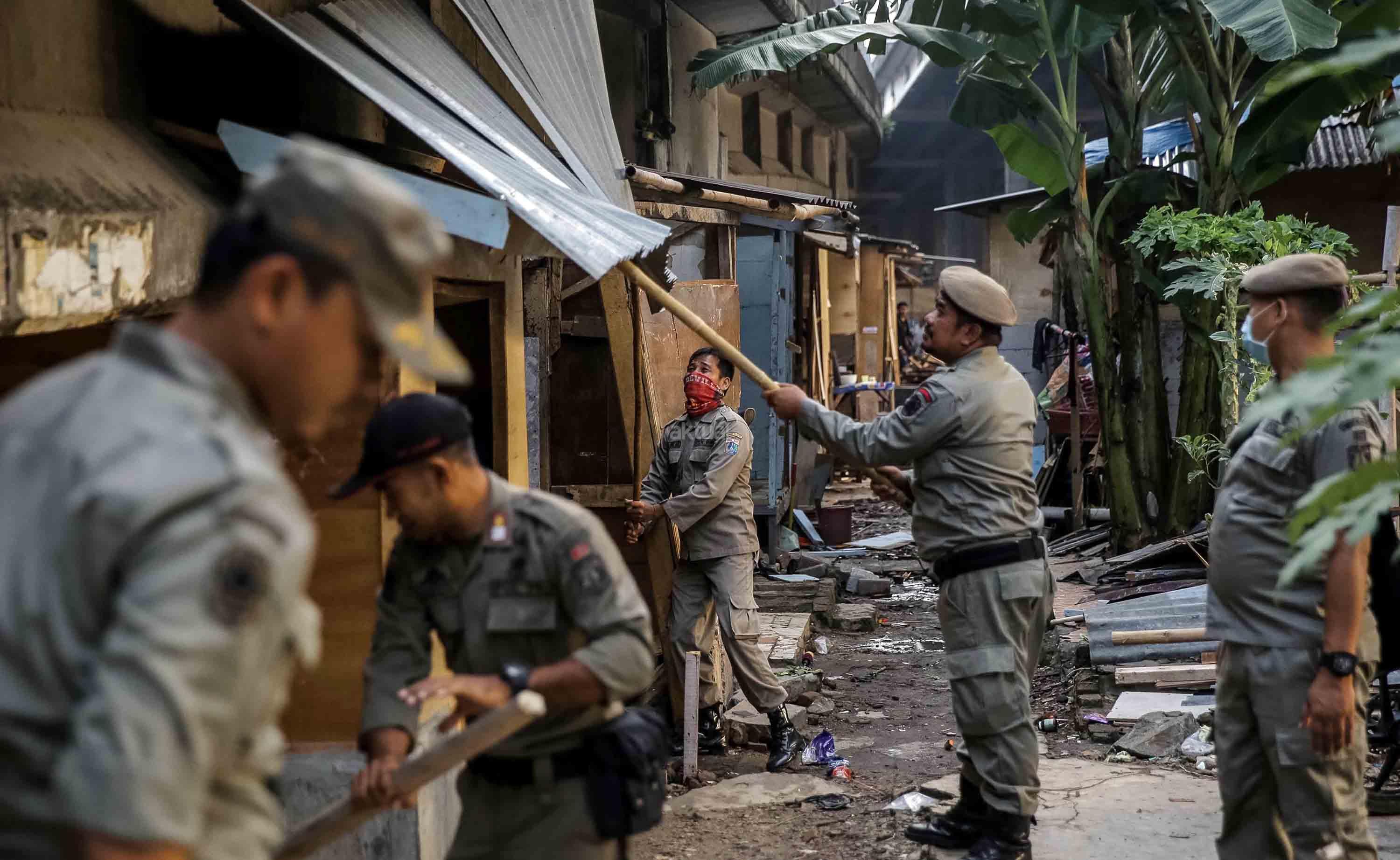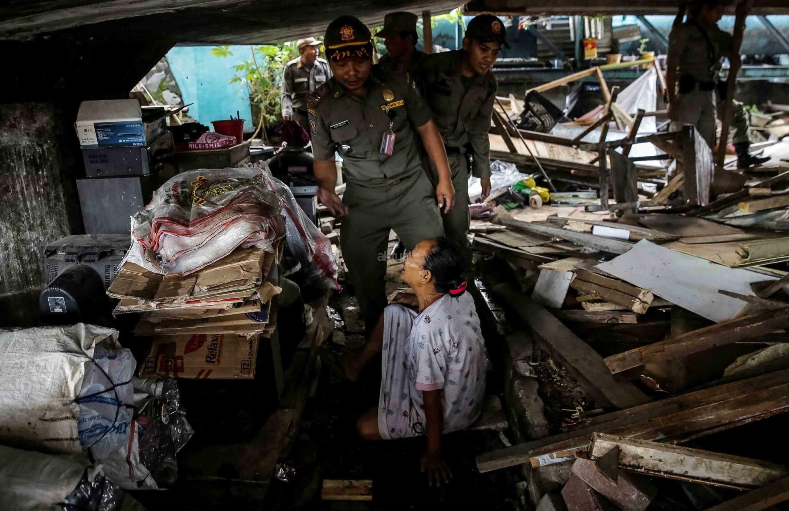 Petugas Satpol PP melakukan pembongkaran ratusan bangunan semi permanen di Kolong Tol Kalijodo, Jakarta, Rabu (14/6/2017). Rencananya, setelah ditertibkan area itu nanti akan dialihfungsikan sebagai lahan parkir tambahan Ruang Publik Terpadu Ramah Anak (RPTRA) Kalijodo yang kian membludak. AKTUAL/Tino Oktaviano