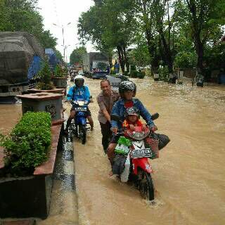 Petugas Satlantas yang diback up petugas BPBD terus mengatur arus lalu lintas jalan yang lumpuh. Kendaraan sepeda motor yang tertahan banjir harus didoron, lantaran kondisi mesin dalam keadaan mati.