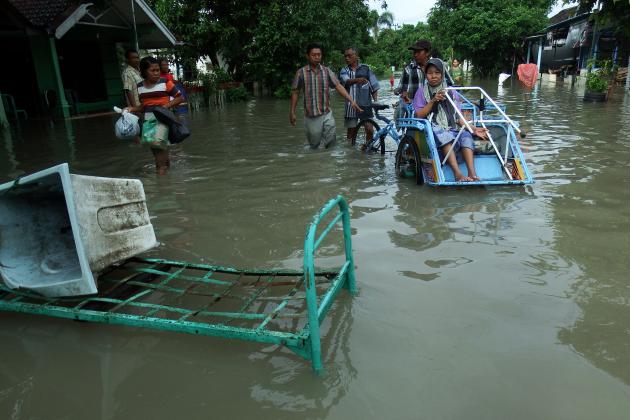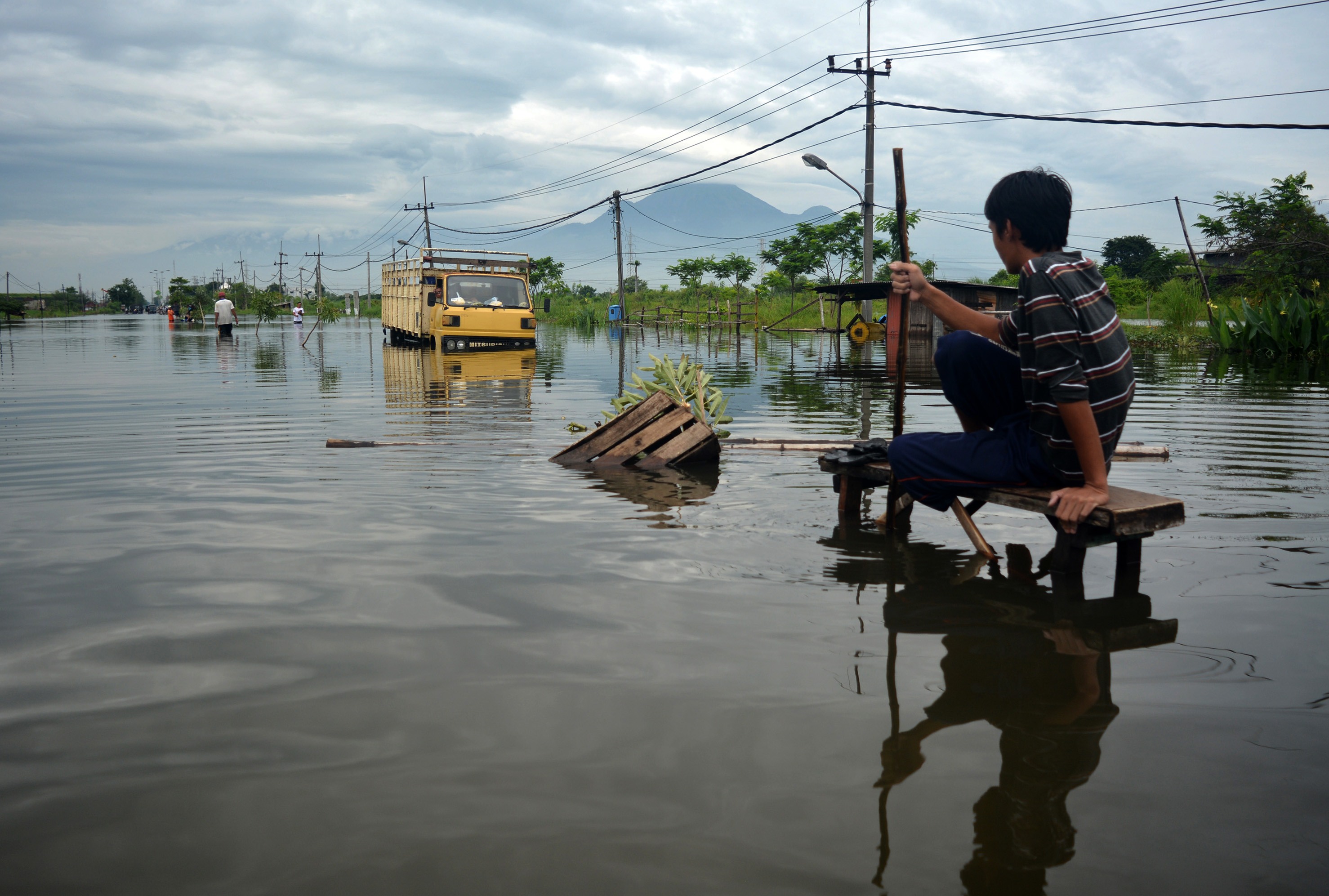 Seorang anak melintasi banjir di jalan raya Porong, Sidoarjo, Jawa Timur, Jumat (12/2). Banjir tersebut diakibatkan curah hujan tinggi sejak kamis (11/2) malam dan membuat Jalan Raya Porong serta Rel Kereta Api Jalur Timur ditutup karena terendam air hingga ketinggian 70 cm. ANTARA FOTO/Umarul Faruq/foc/16.