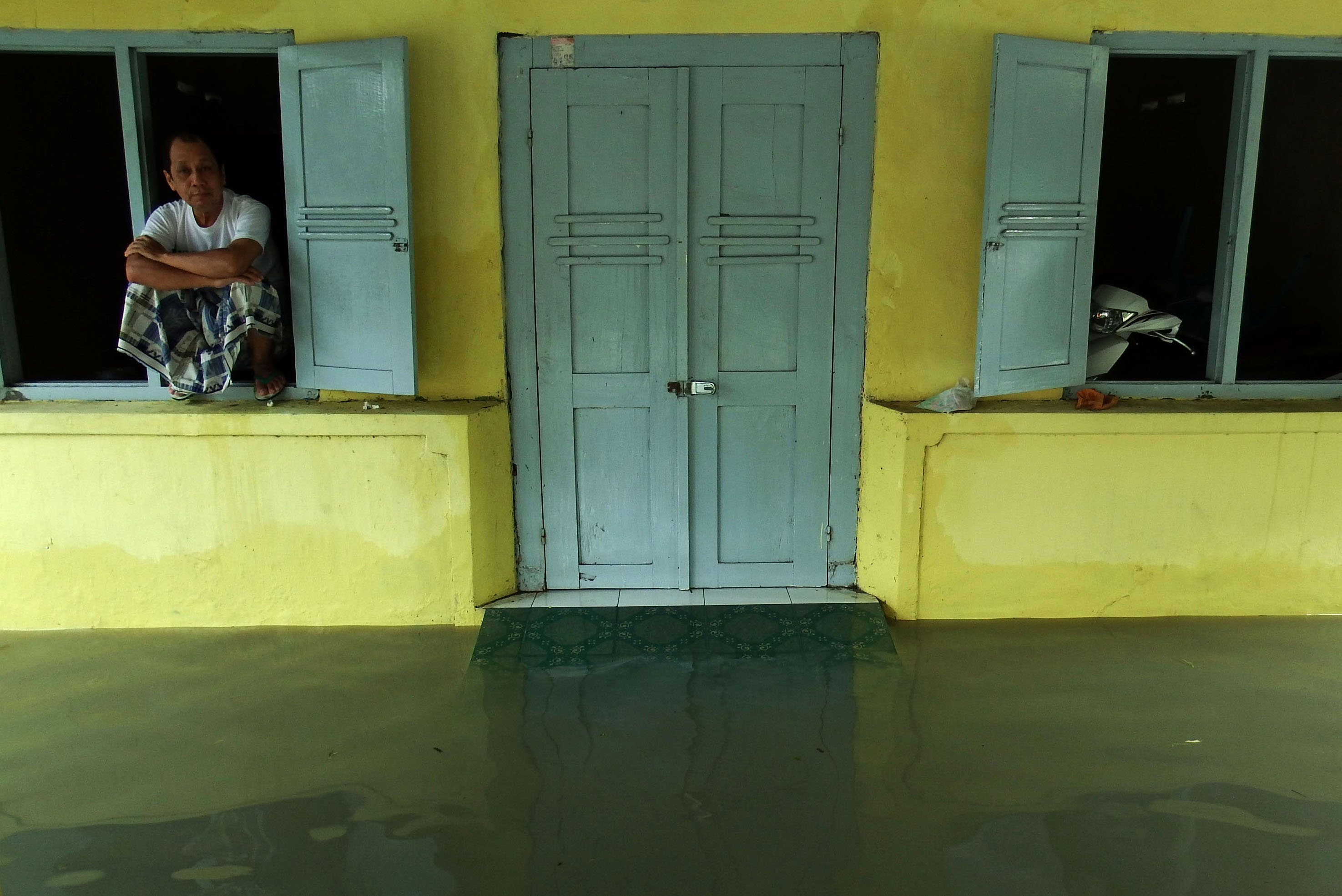 Warga duduk di jendela saat genangan air masuk rumah di Desa Jombok, Kesamben, Jombang, Jawa Timur, Jumat (12/2). Banjir akibat luapan air sungai itu mengenangi lima Kecamatan di wilayah Jombang dengan ketinggian bervariasi 20 cm-70 cm. ANTARA FOTO/Syaiful Arif/foc/16.