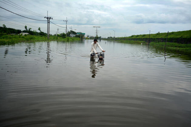 Seorang warga melihat truk yang terjebak banjir di jalan raya Porong, Sidoarjo, Jawa Timur, Jumat (12/2). Banjir tersebut diakibatkan curah hujan tinggi sejak kamis (11/2) malam dan membuat Jalan Raya Porong serta Rel Kereta Api Jalur Timur ditutup karena terendam air hingga ketinggian 70 cm. ANTARA FOTO/Umarul Faruq/foc/16.