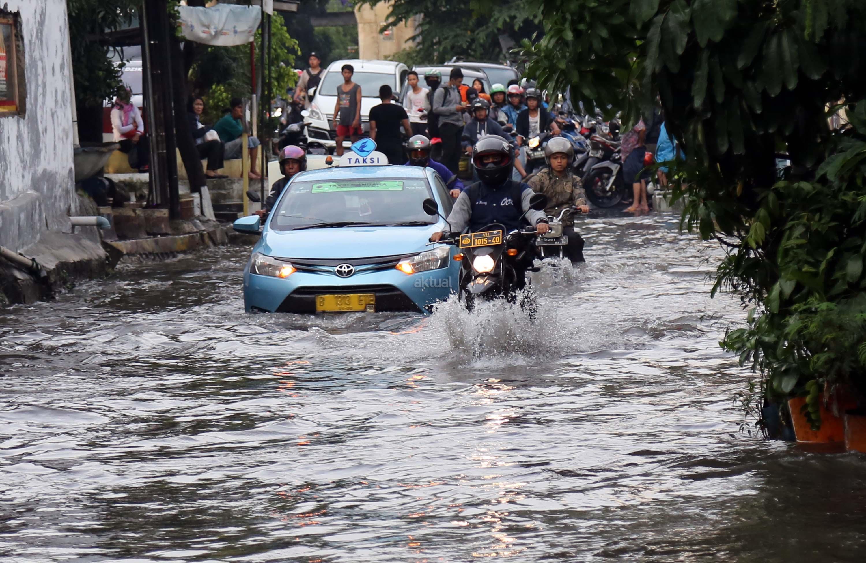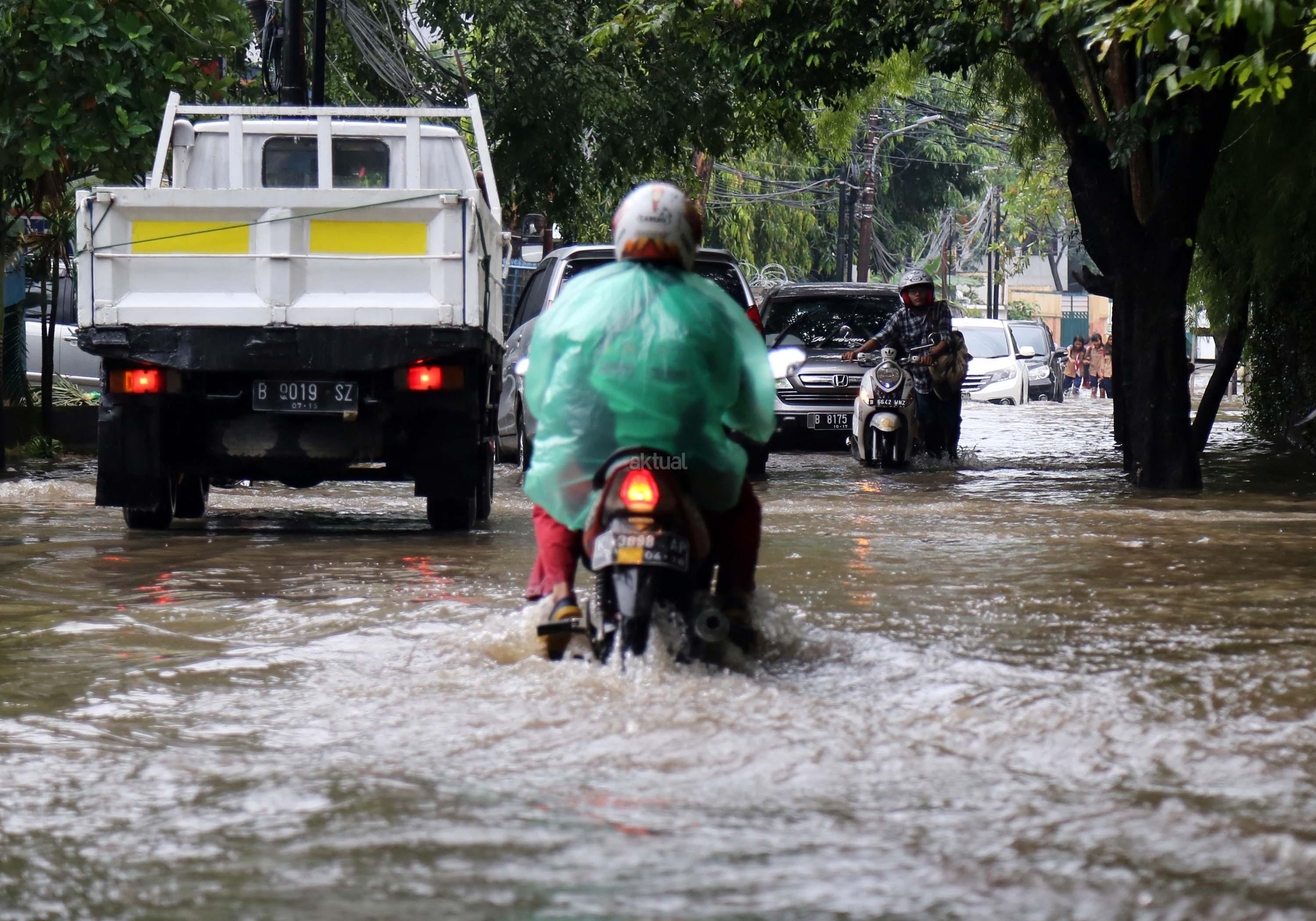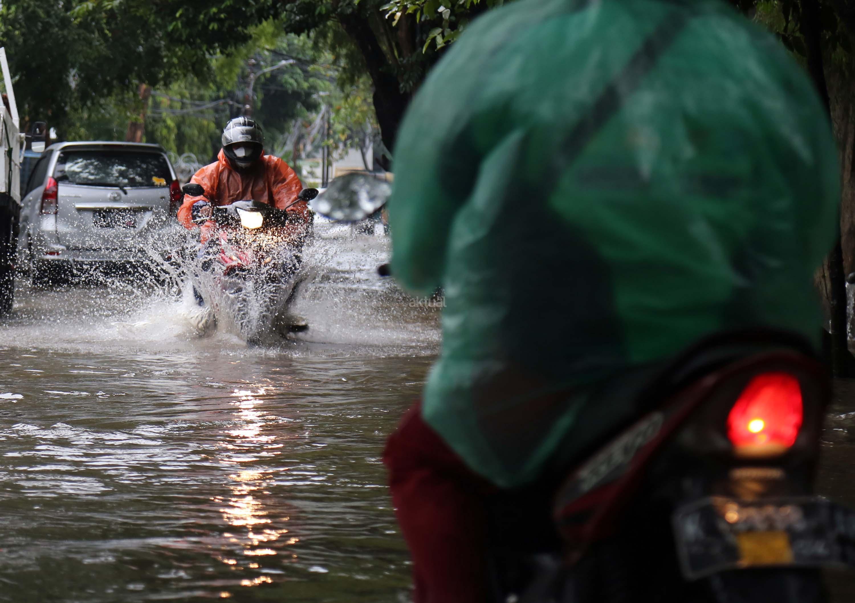 Pengendara sepeda motor melintasi banjir di jalan Bangka, Jakarta Selatan, Rabu (26/8). Hujan deras disertai angin kencang yang mengguyur Jakarta menyebabkan beberapa kawasan di Jakarta Selatan dilanda banjir akibat meluapnya kali Mampang. AKTUAL/Tino Oktaviano