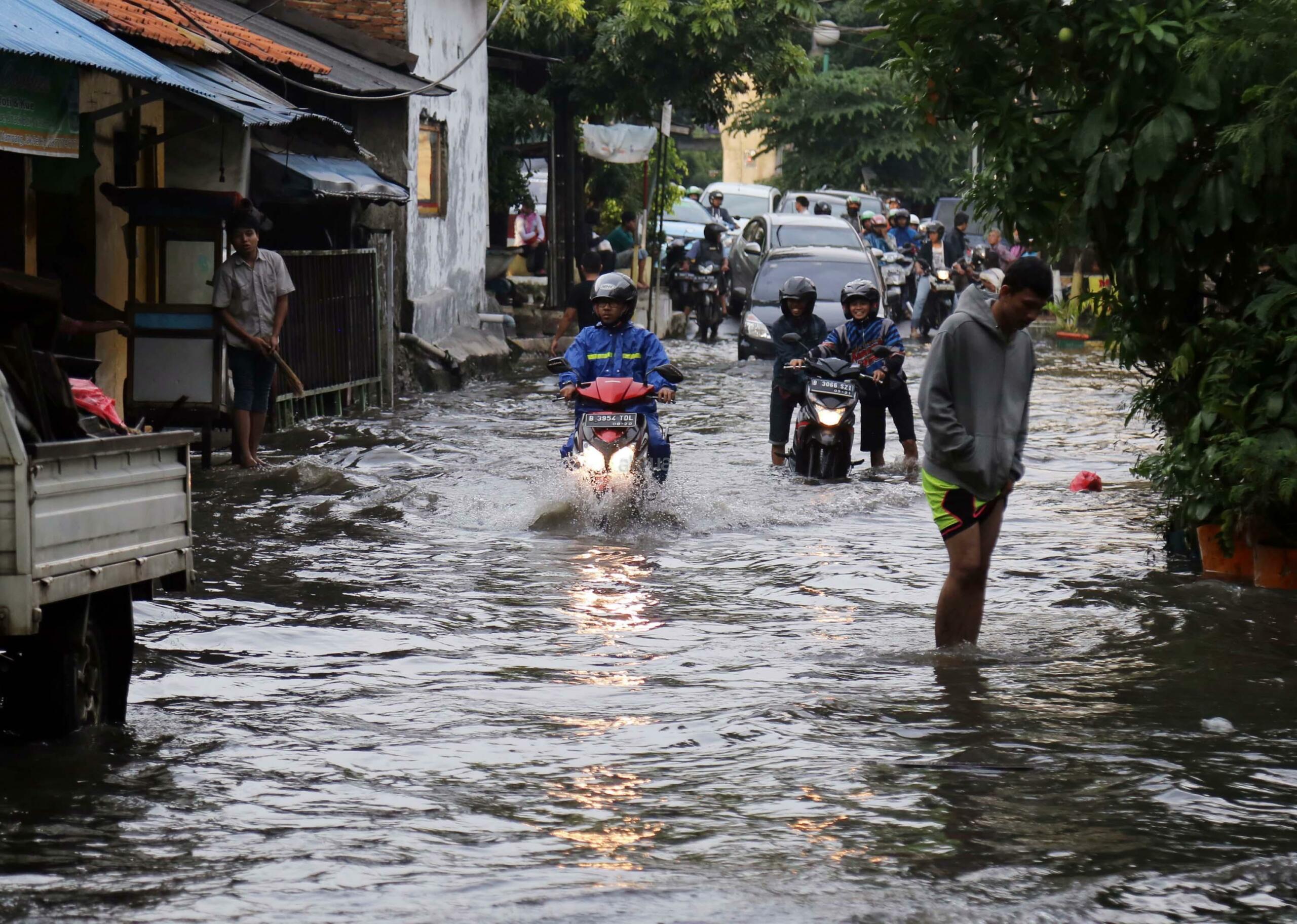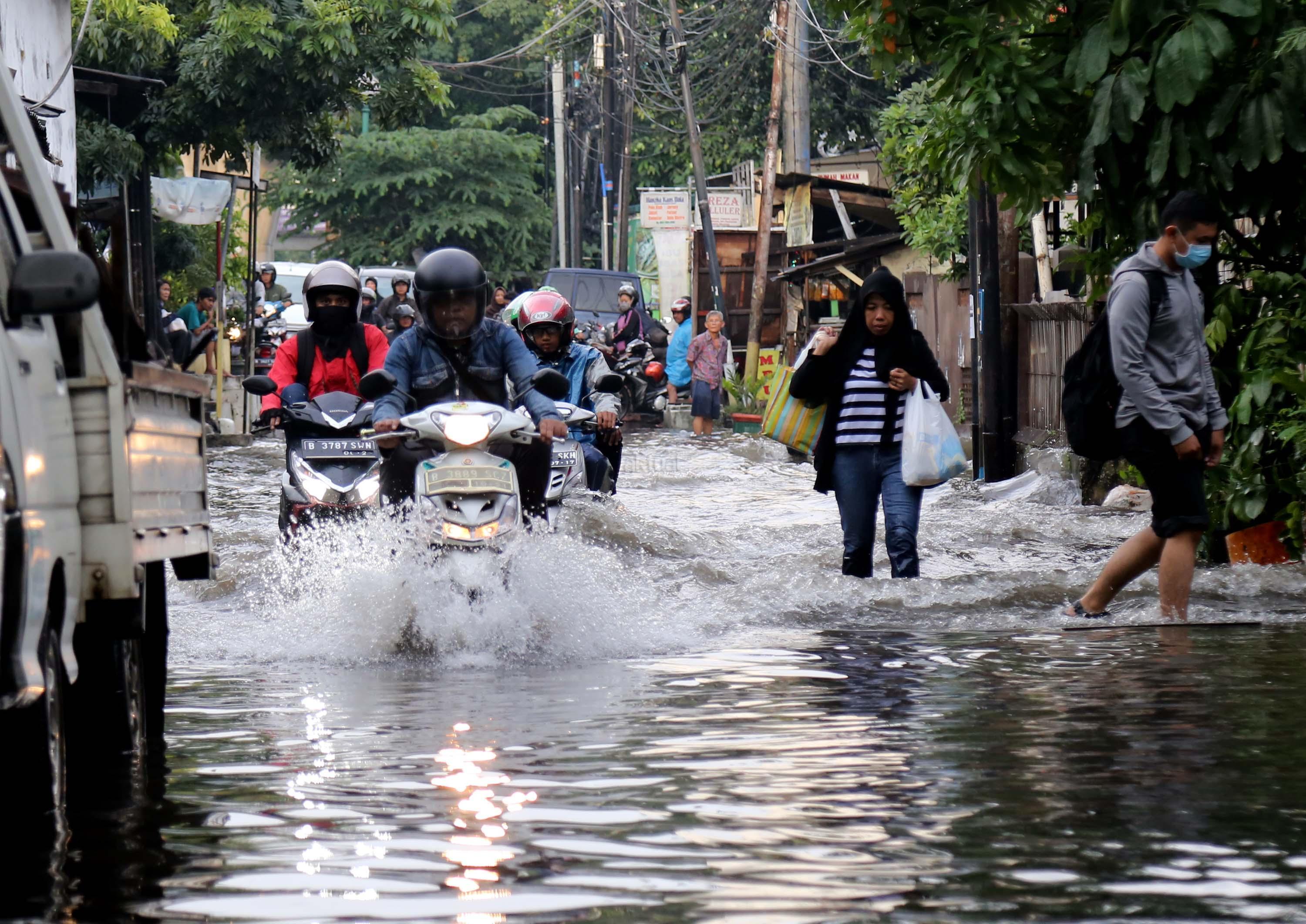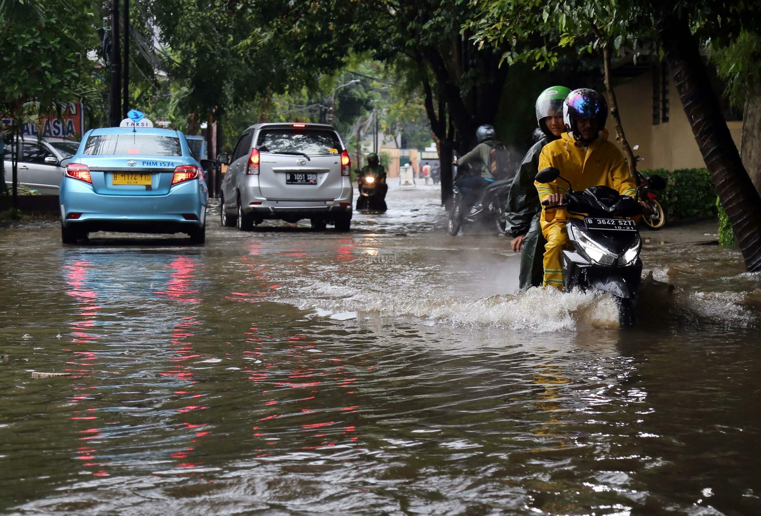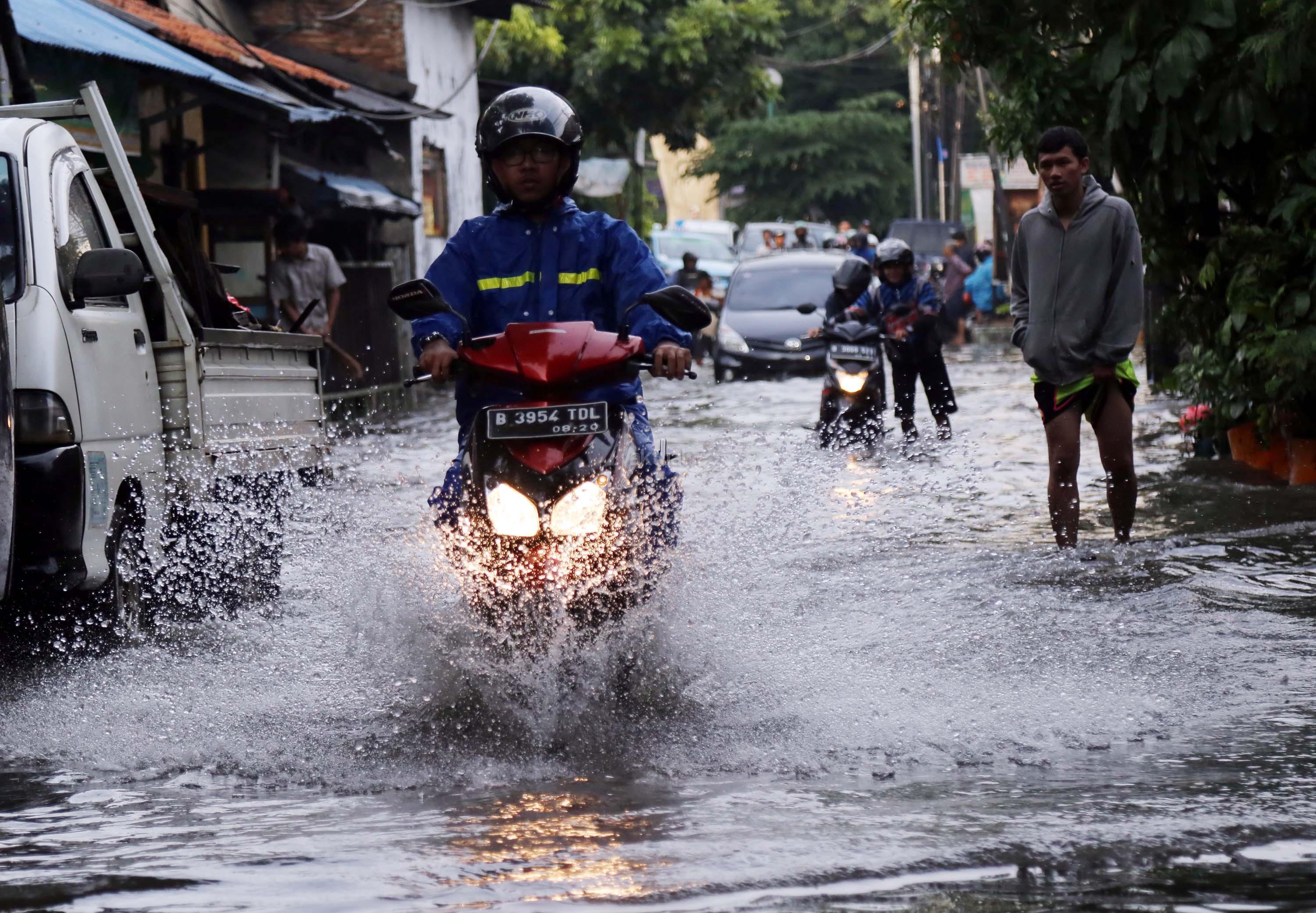 Pengendara sepeda motor melintasi banjir di jalan Bangka, Jakarta Selatan, Rabu (26/8). Hujan deras disertai angin kencang yang mengguyur Jakarta menyebabkan beberapa kawasan di Jakarta Selatan dilanda banjir akibat meluapnya kali Mampang. AKTUAL/Tino Oktaviano