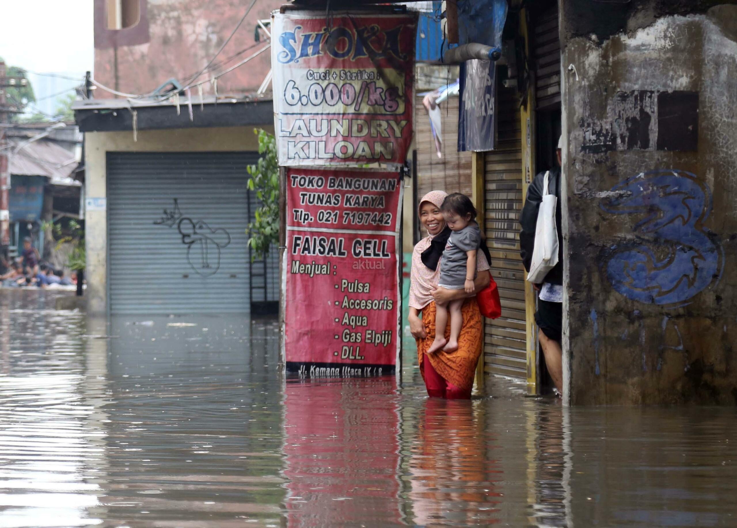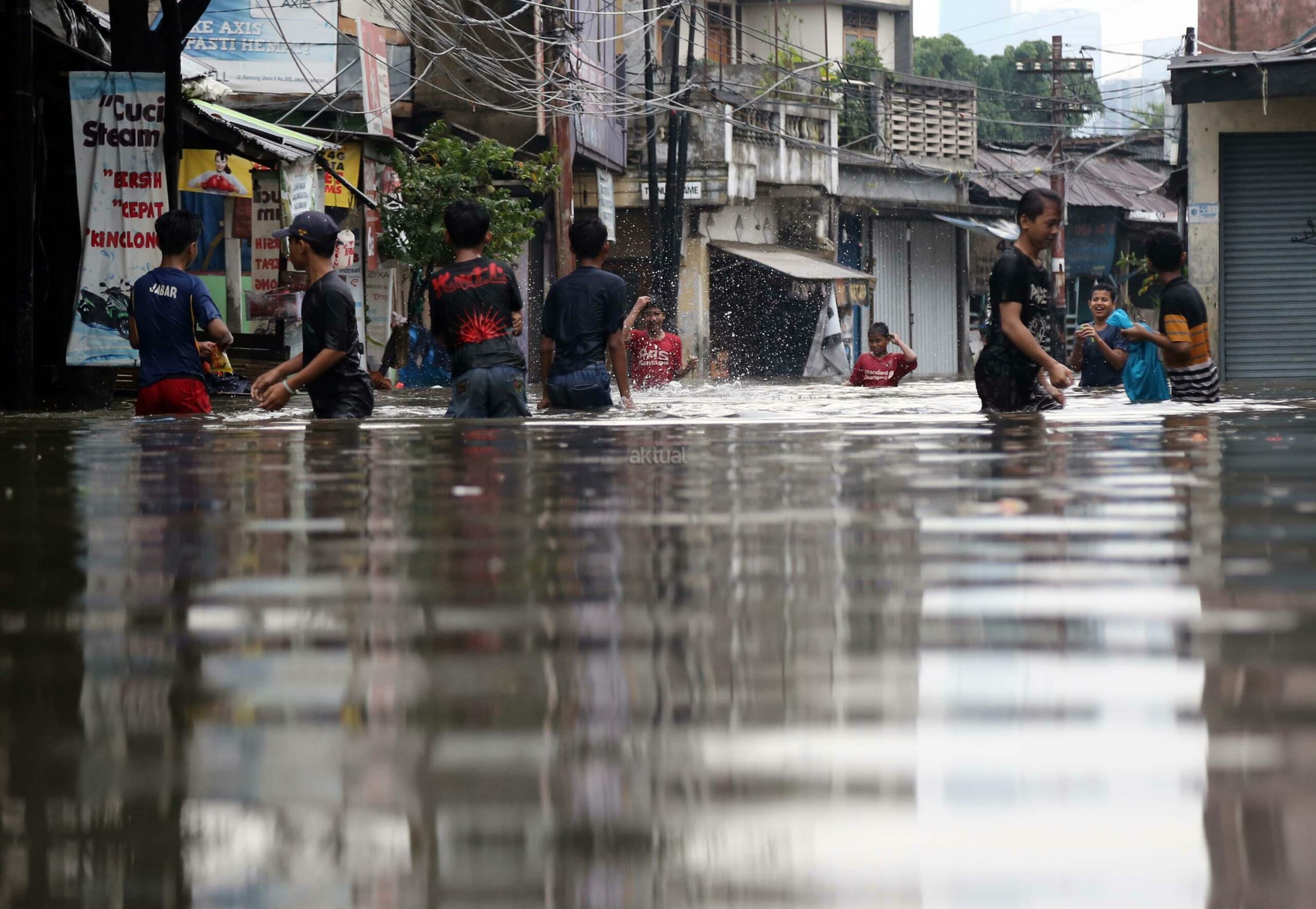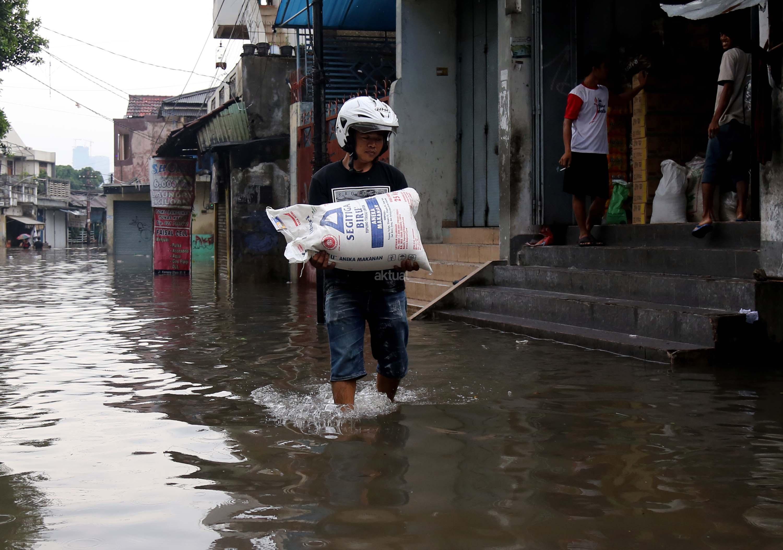 Warga melintasi banjir yang mengenangi kawasan Pasar Kambing, Mampang Prapatan, Jakarta Selatan, Rabu (26/4). Hujan deras disertai angin kencang yang mengguyur Jakarta menyebabkan beberapa kawasan di Jakarta Selatan dilanda banjir, akibat meluapnya kali Mampang. AKTUAL/Tino Oktaviano