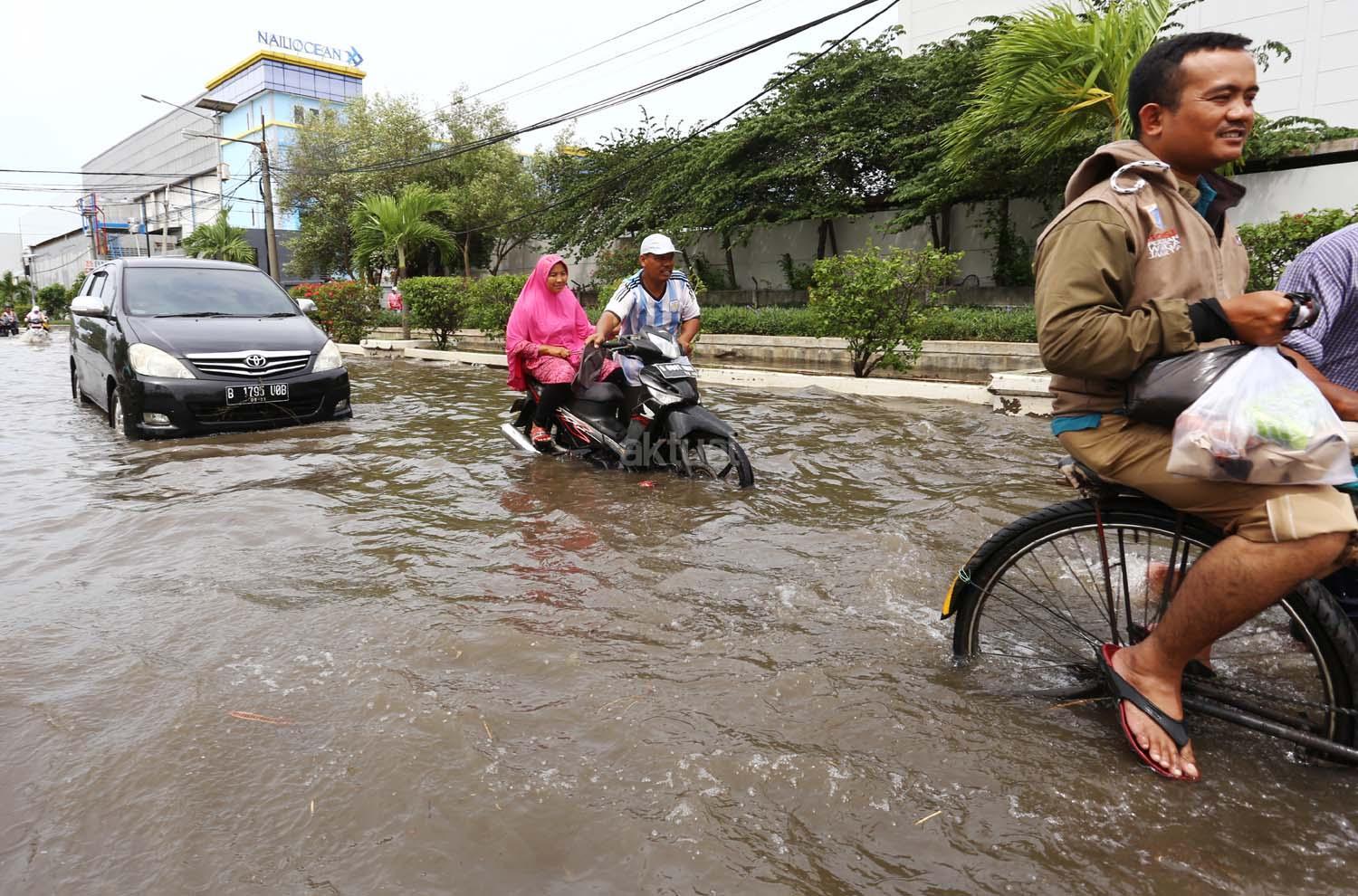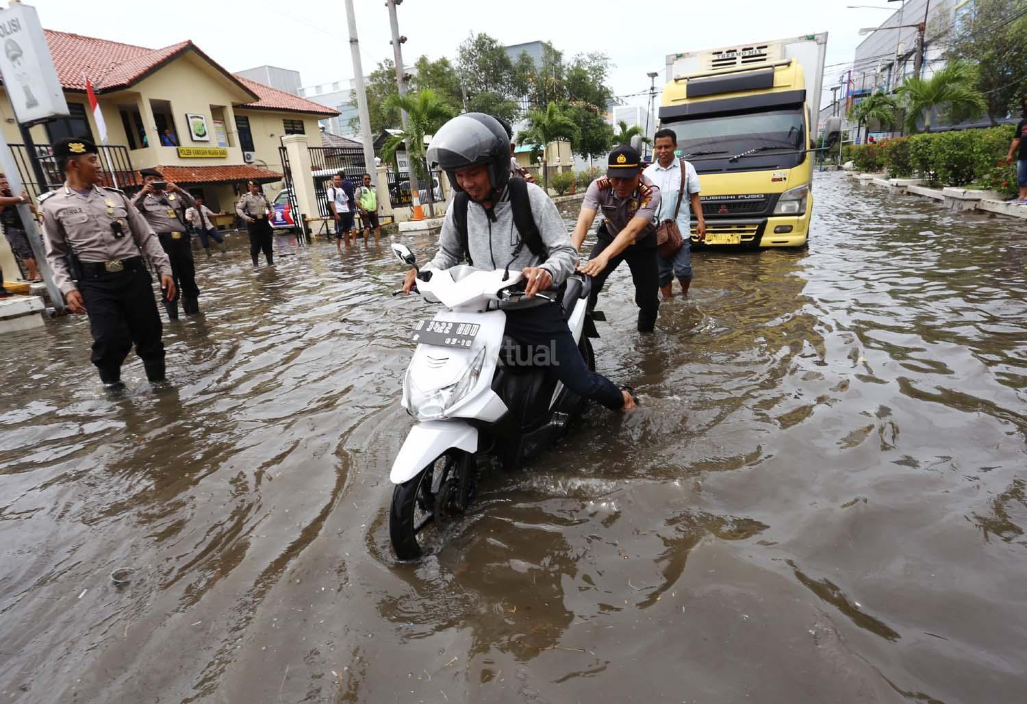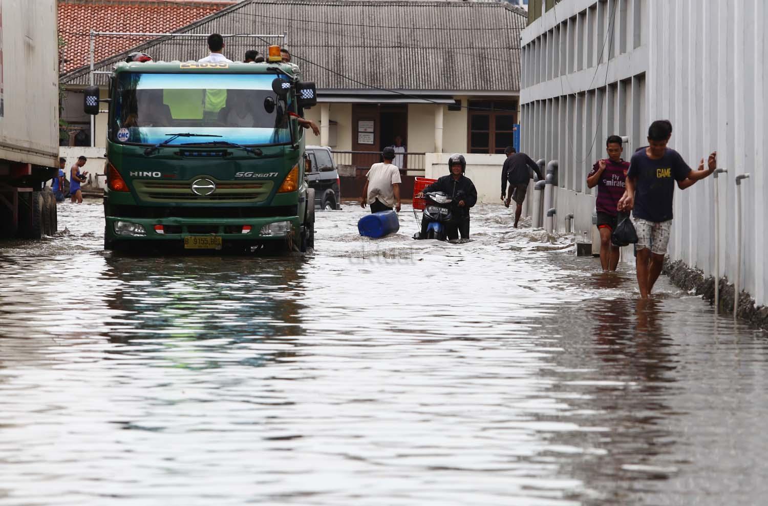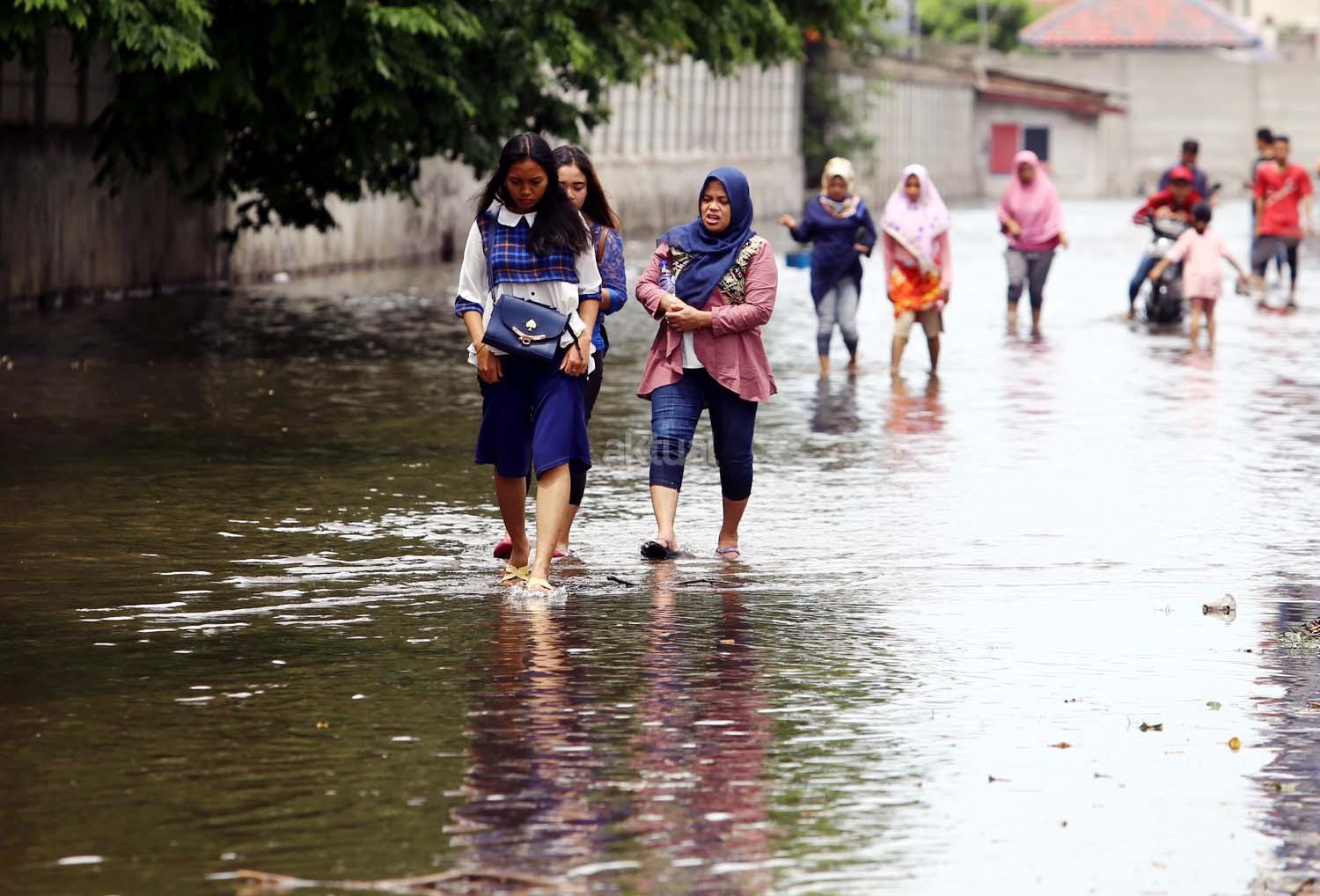 Warga melintasi bajir Rob di Muara Baru, Jakarta Utara, Selasa (5/12/2017). Tiga Kecamatan di Jakarta Utara, tergenang banjir rob, yaitu Kecamatan Cilincing, Kecamatan Pademangan, dan Kecamatan Penjaringan. Pemukiman penduduk di sekitar Pompa Waduk Pluit pinggiran tanggul RW 17 mengalami luber dengan ketinggian genangan hingga 20 centimeter. AKTUAL/Tino Oktaviano