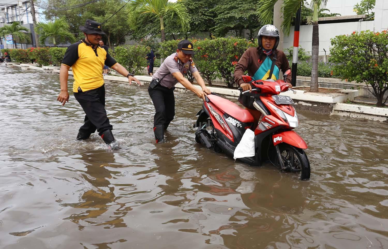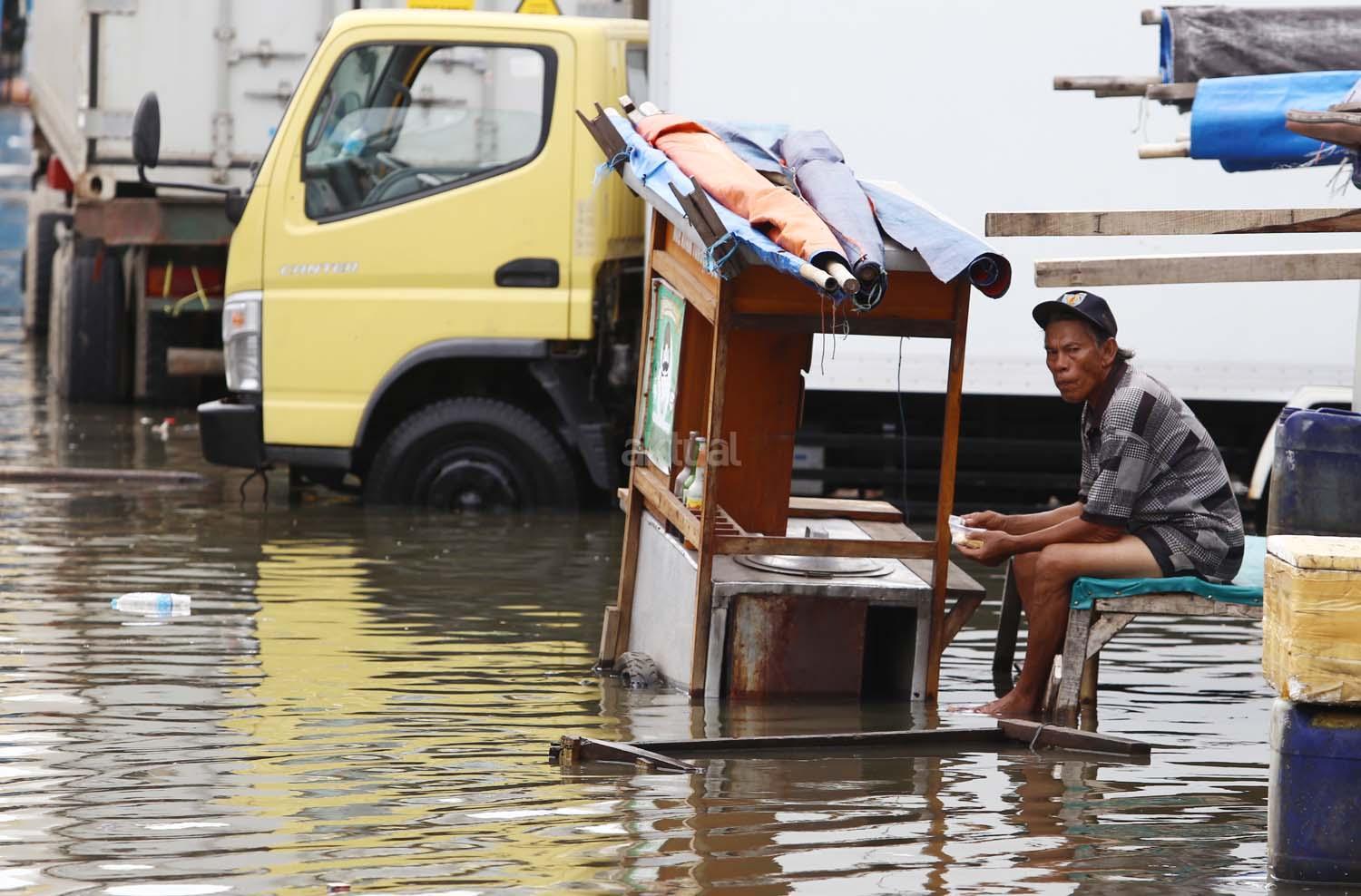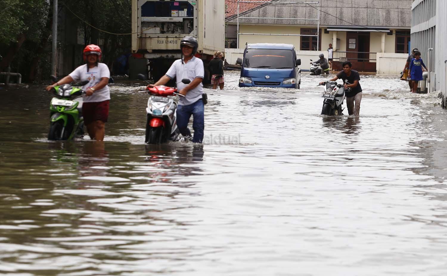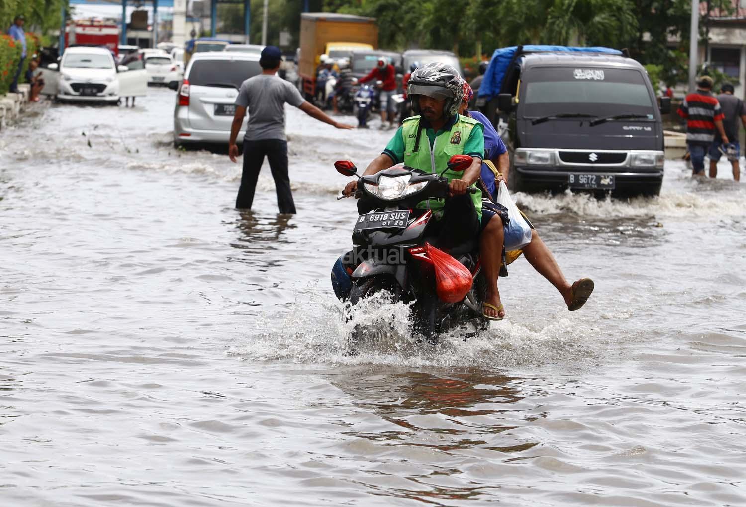 Warga melintasi bajir Rob di Muara Baru, Jakarta Utara, Selasa (5/12/2017). Tiga Kecamatan di Jakarta Utara, tergenang banjir rob, yaitu Kecamatan Cilincing, Kecamatan Pademangan, dan Kecamatan Penjaringan. Pemukiman penduduk di sekitar Pompa Waduk Pluit pinggiran tanggul RW 17 mengalami luber dengan ketinggian genangan hingga 20 centimeter. AKTUAL/Tino Oktaviano