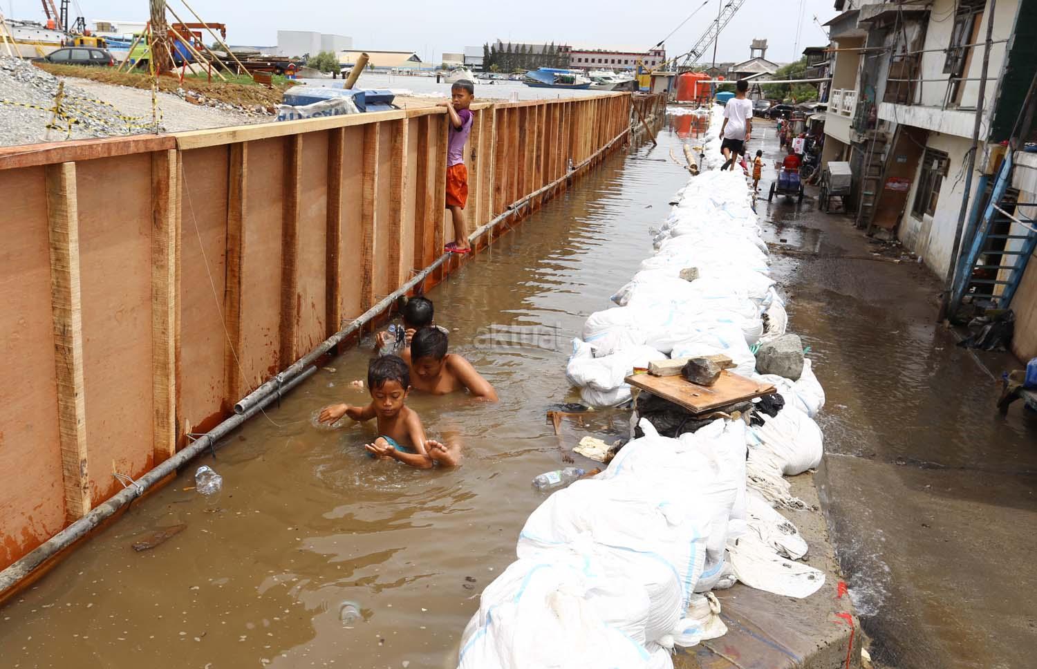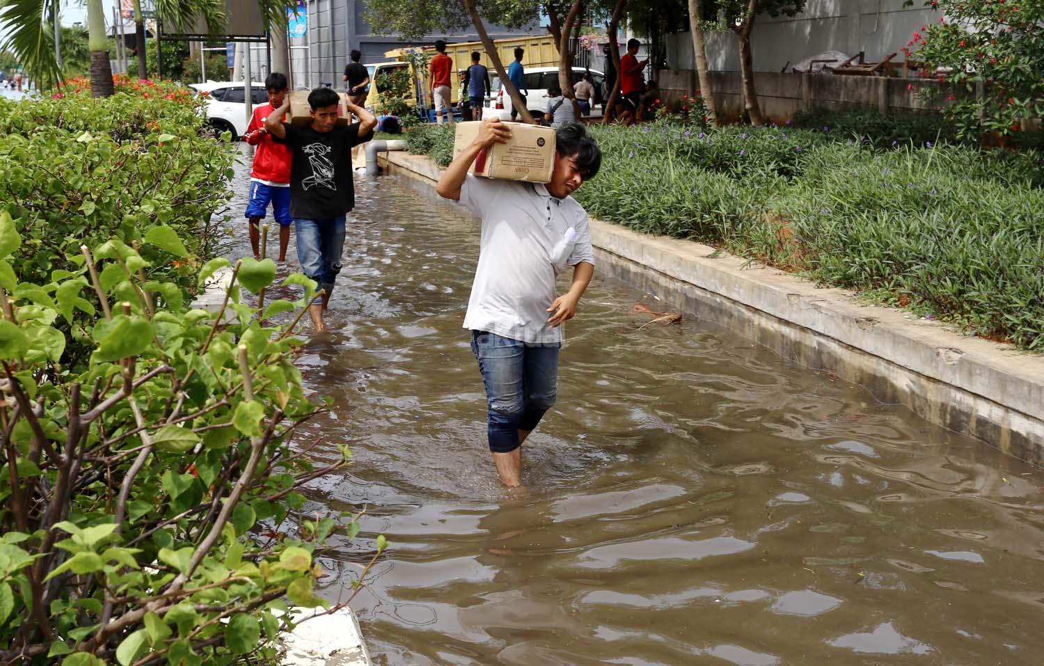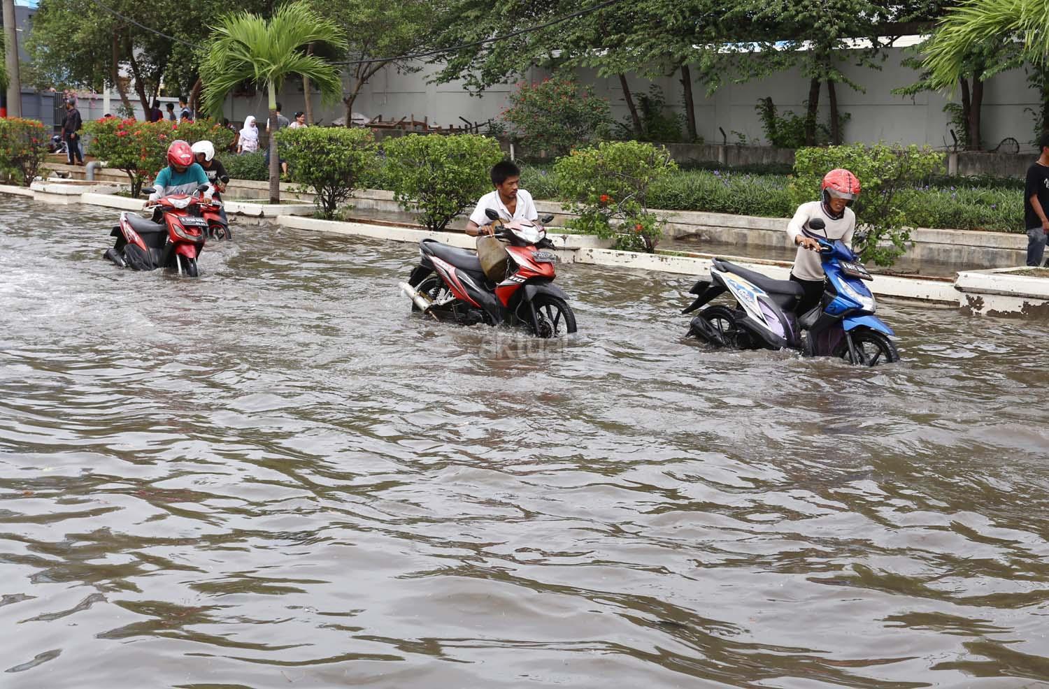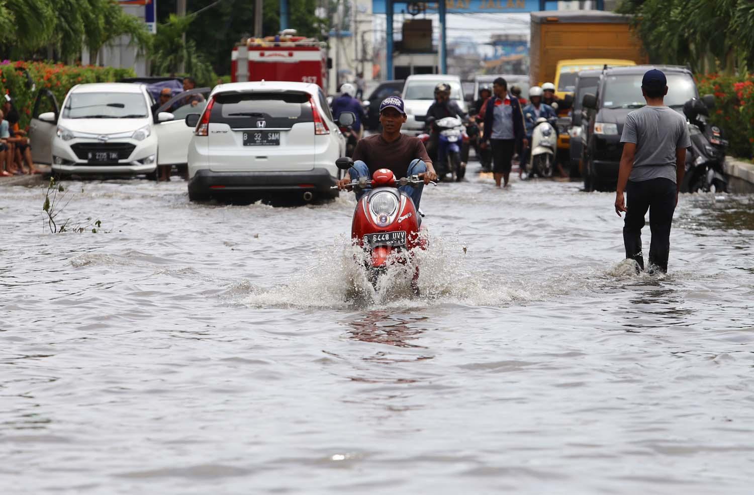 Warga melintasi bajir Rob di Muara Baru, Jakarta Utara, Selasa (5/12/2017). Tiga Kecamatan di Jakarta Utara, tergenang banjir rob, yaitu Kecamatan Cilincing, Kecamatan Pademangan, dan Kecamatan Penjaringan. Pemukiman penduduk di sekitar Pompa Waduk Pluit pinggiran tanggul RW 17 mengalami luber dengan ketinggian genangan hingga 20 centimeter. AKTUAL/Tino Oktaviano