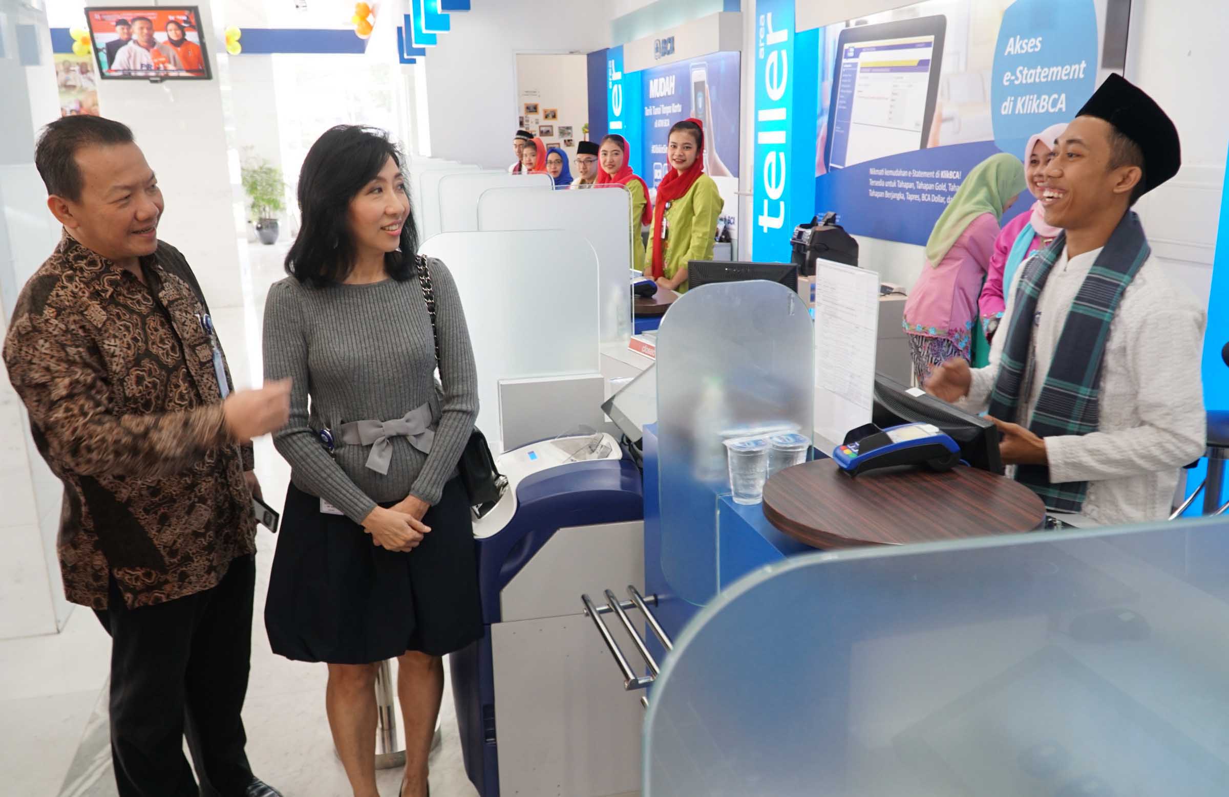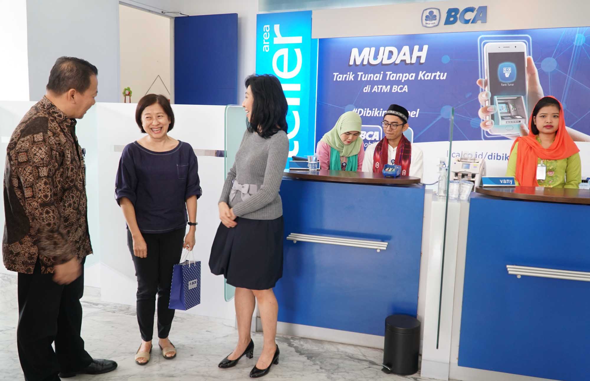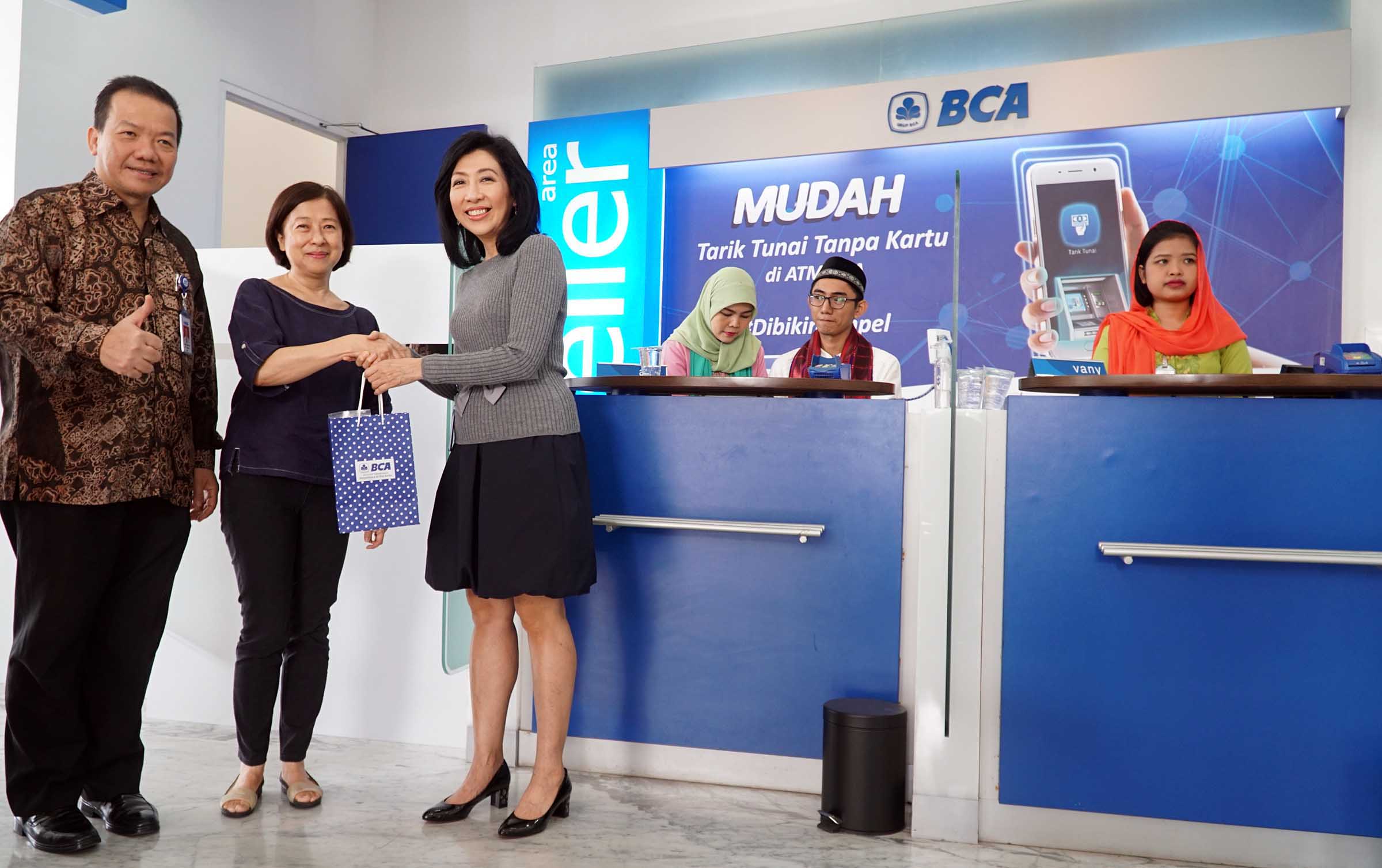 Dalam rangka Hari Pelanggan Nasional, Direktur PT Bank Central Asia Tbk (BCA) Vera Eve Lim (tengah) didampingi Kepala Kantor Wilayah VIII BCA Haryono Wongsonegoro (kiri) menyapa customer service seusai memberikan bingkisan kepada nasabah sebagai bentuk semangat pelayanan terhadap nasabah setianya dan apresiasi atas kesetiaan nasabah menggunakan layanan dan produk perbankan BCA di BCA Kantor Cabang Utama (KCU) Pondok Indah, Senin (04/09). Sejumlah produk dan layanan perbankan yang bermanfaat dirancang untuk memenuhi kebutuhan keuangan nasabah yang hingga akhir Juni 2018 jumlahnya mencapai 18 juta rekening nasabah yang tersebar di pelosok negeri. AKTUAL/Eko S Hilman
