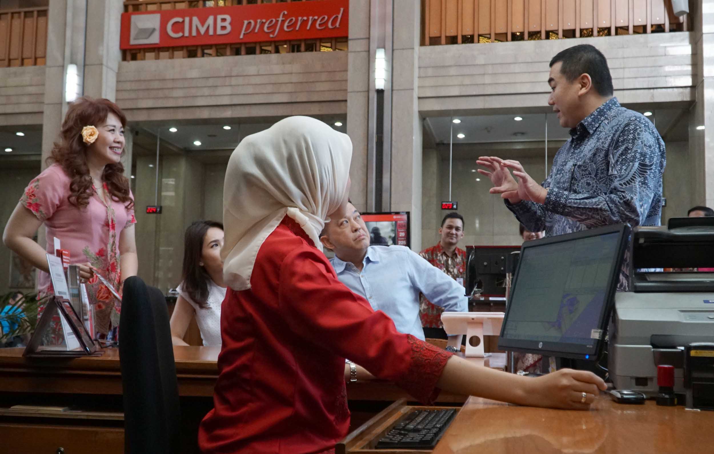 Direktur Treasury & Capital Market CIMB Niaga John Simon (kanan) menyapa nasabah yang bertransaksi di Kantor Cabang Graha CIMB Niaga, Jakarta dalam suasana perayaan Hari Pelanggan Nasional, Selasa (4/9/2018). CIMB Niaga merayakan Hari Pelanggan Nasional sebagai bagian dari upaya berkelanjutan untuk selalu mengapresiasi nasabah yang telah setia menggunakan produk dan layanan perseroan. Di sejumlah Kantor Cabang, nasabah dikunjungi dan dilayani oleh Direksi dan Senior Management. Tahun ini, Senior Management juga melakukan kunjungan ke nasabah (customer visit) dan ke karyawan terpilih dengan masa kerja di atas 25 tahun sebagai bentuk penghargaan dan terima kasih. AKTUAL/Eko S Hilman