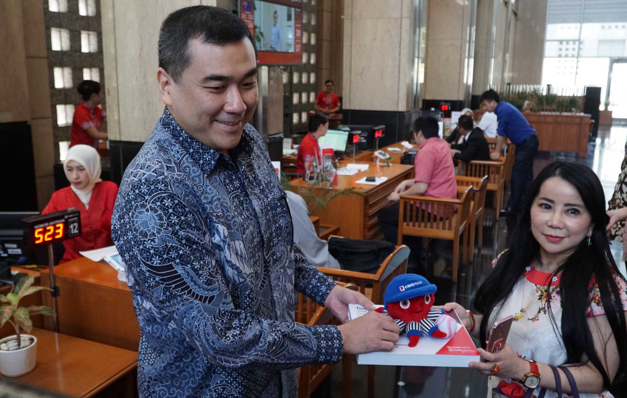 Direktur Treasury & Capital Market CIMB Niaga John Simon (kiri) menyerahkan cenderamata kepada nasabah yang bertransaksi di Kantor Cabang Graha CIMB Niaga, Jakarta dalam suasana perayaan Hari Pelanggan Nasional, Selasa (4/9/2018). CIMB Niaga merayakan Hari Pelanggan Nasional sebagai bagian dari upaya berkelanjutan untuk selalu mengapresiasi nasabah yang telah setia menggunakan produk dan layanan perseroan. Di sejumlah Kantor Cabang, nasabah dikunjungi dan dilayani oleh Direksi dan Senior Management. Tahun ini, Senior Management juga melakukan kunjungan ke nasabah (customer visit) dan ke karyawan terpilih dengan masa kerja di atas 25 tahun sebagai bentuk penghargaan dan terima kasih. AKTUAL/Eko S Hilman