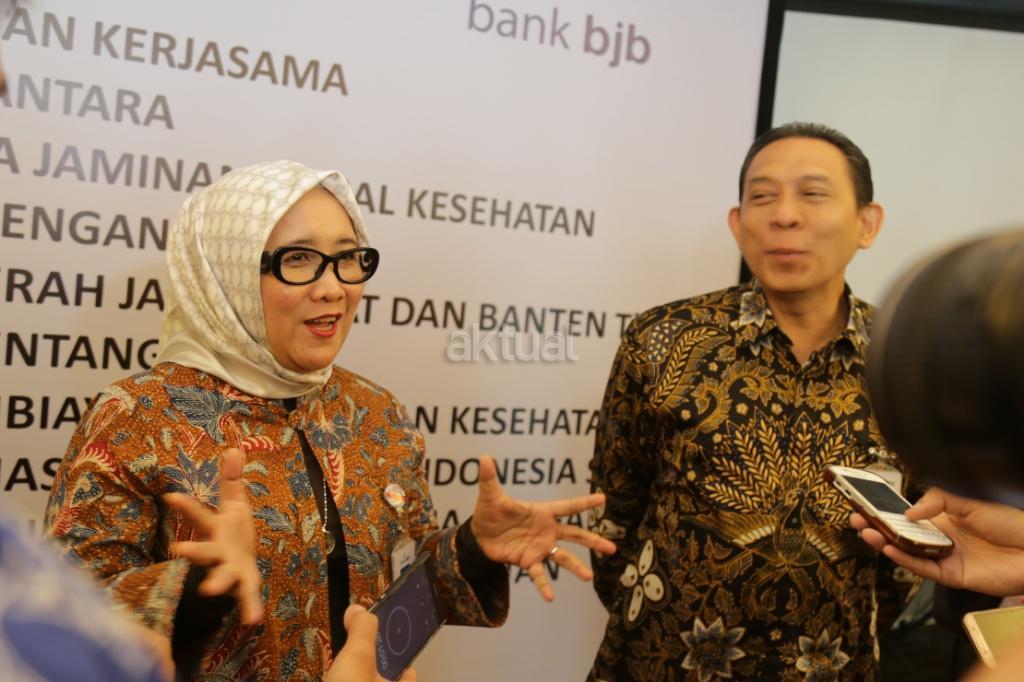 Direktur Komersial PT Bank Pembangunan Daerah Jawa Barat dan Banten, Tbk Suartini (kiri) dan Direktur Keuangan dan Investasi BPJS Kesehatan Kemal Imam Santoso (kanan) menjawab pertanyaan wartawan usai penandatanganan kerjasama dua perusahaan di Jakarta, Rabu (22/11/2017). Kerjasama ini dalam rangka pemberian konfirmasi fasilitas kesehatan oleh BPJS Kesehatan kepada Bank BJB dalam rangka memperlancar pembiayaan pelayanan kesehatan perserta BPJS Kesehatan. Selain itu melakukan pembiayaan kepada fasilitas kesehatan melalui produk Open Account Financing (OAF) Bank BJB. AKTUAL/Tino Oktaviano