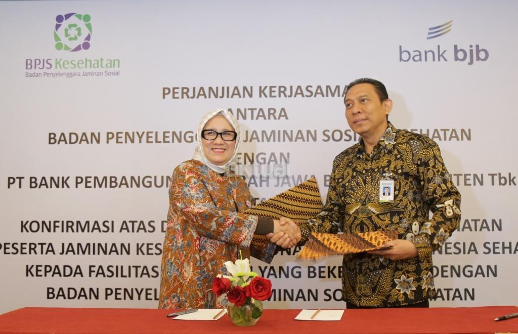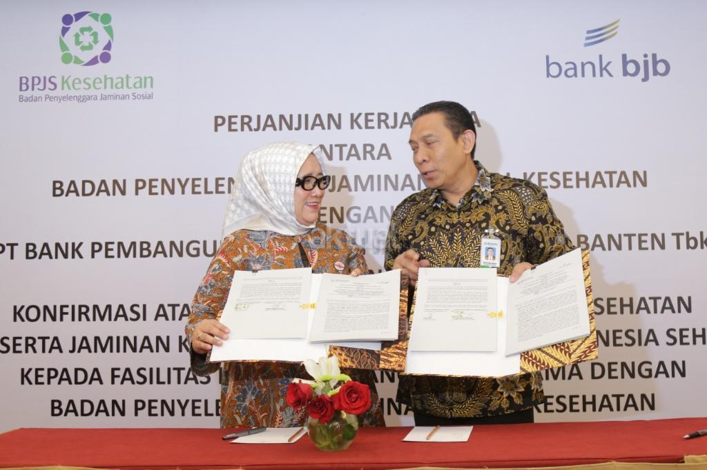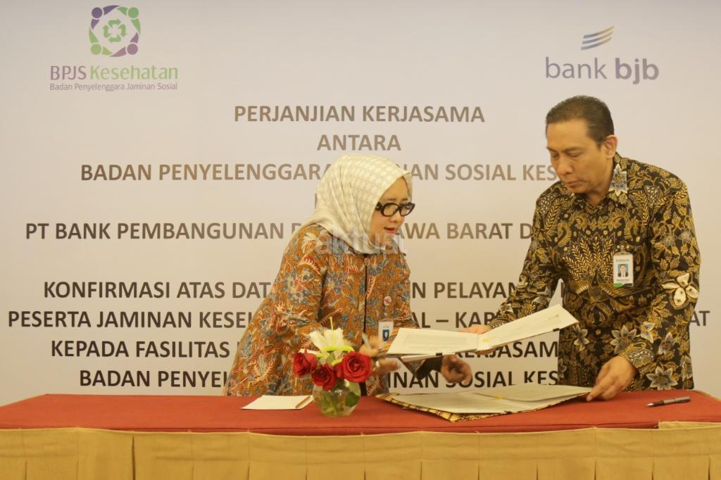 Direktur Komersial PT Bank Pembangunan Daerah Jawa Barat dan Banten, Tbk Suartini (kiri) dan Direktur Keuangan dan Investasi BPJS Kesehatan Kemal Imam Santoso (kanan) memperlihatkan nota kesepahaman saat penandatanganan kerjasama dua perusahaan di Jakarta, Rabu (22/11/2017). Kerjasama ini dalam rangka pemberian konfirmasi fasilitas kesehatan oleh BPJS Kesehatan kepada Bank BJB dalam rangka memperlancar pembiayaan pelayanan kesehatan perserta BPJS Kesehatan. Selain itu melakukan pembiayaan kepada fasilitas kesehatan melalui produk Open Account Financing (OAF) Bank BJB. AKTUAL/Tino Oktaviano