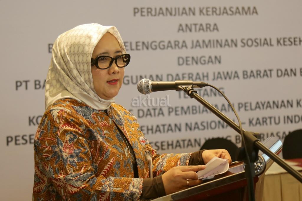 Direktur Komersial PT Bank Pembangunan Daerah Jawa Barat dan Banten, Tbk Suartini menyampaikan sambutan saat acara kerjasama dua perusahaan Bank BJB dan BPJS Kesehatan di Jakarta, Rabu (22/11/2017). Kerjasama ini dalam rangka pemberian konfirmasi fasilitas kesehatan oleh BPJS Kesehatan kepada Bank BJB dalam rangka memperlancar pembiayaan pelayanan kesehatan perserta BPJS Kesehatan. Selain itu melakukan pembiayaan kepada fasilitas kesehatan melalui produk Open Account Financing (OAF) Bank BJB. AKTUAL/Tino Oktaviano