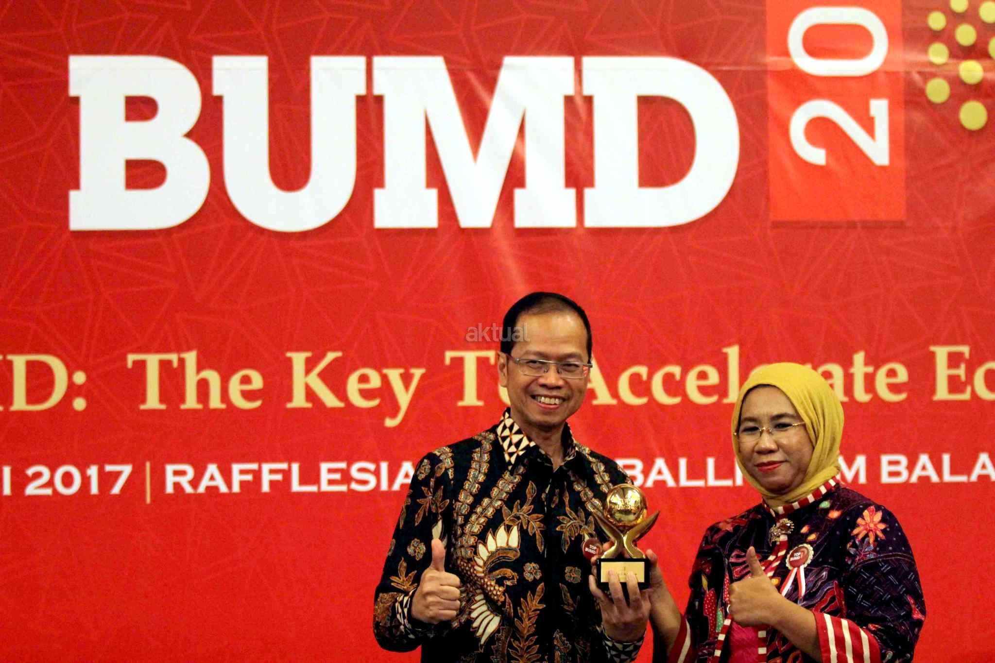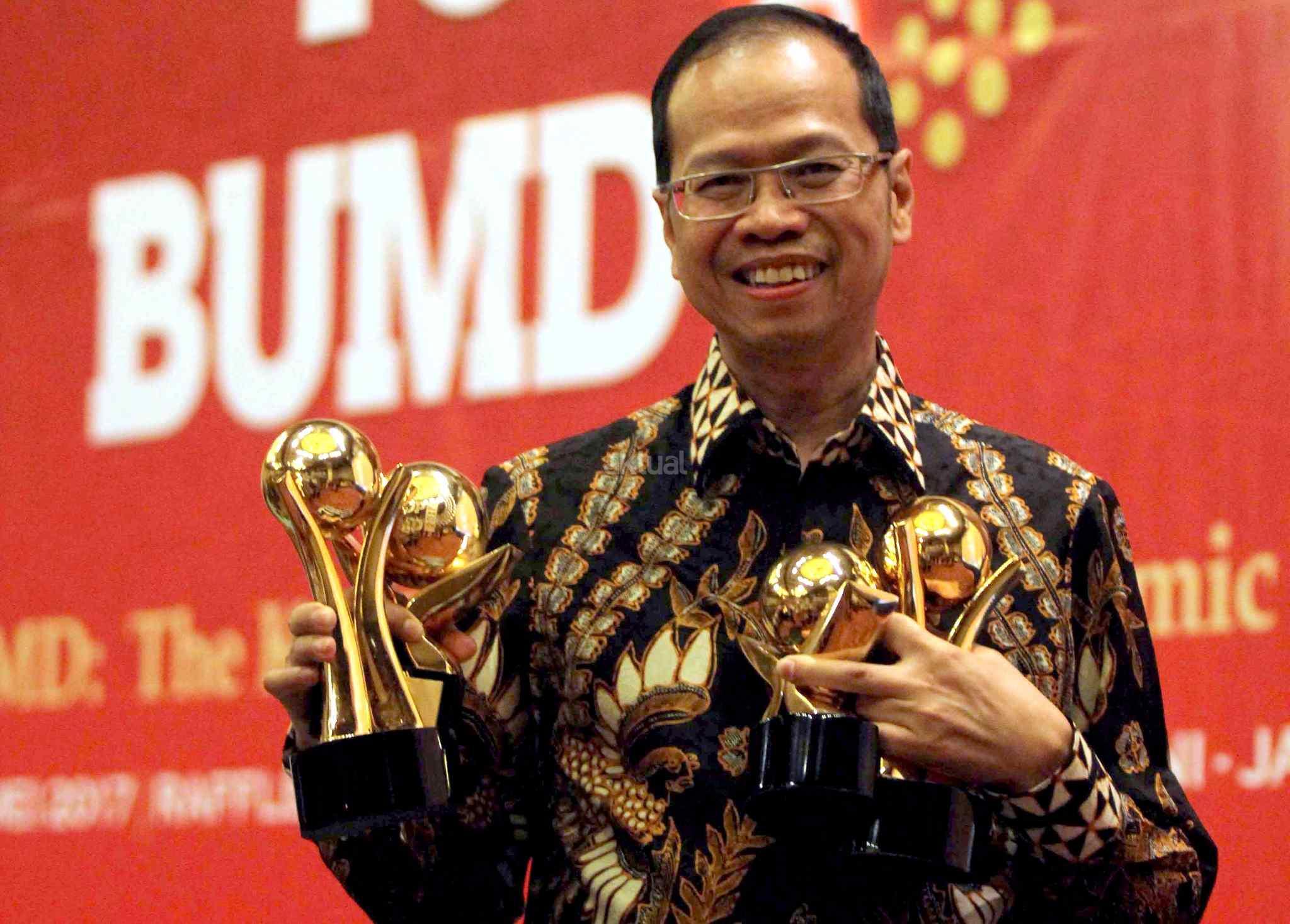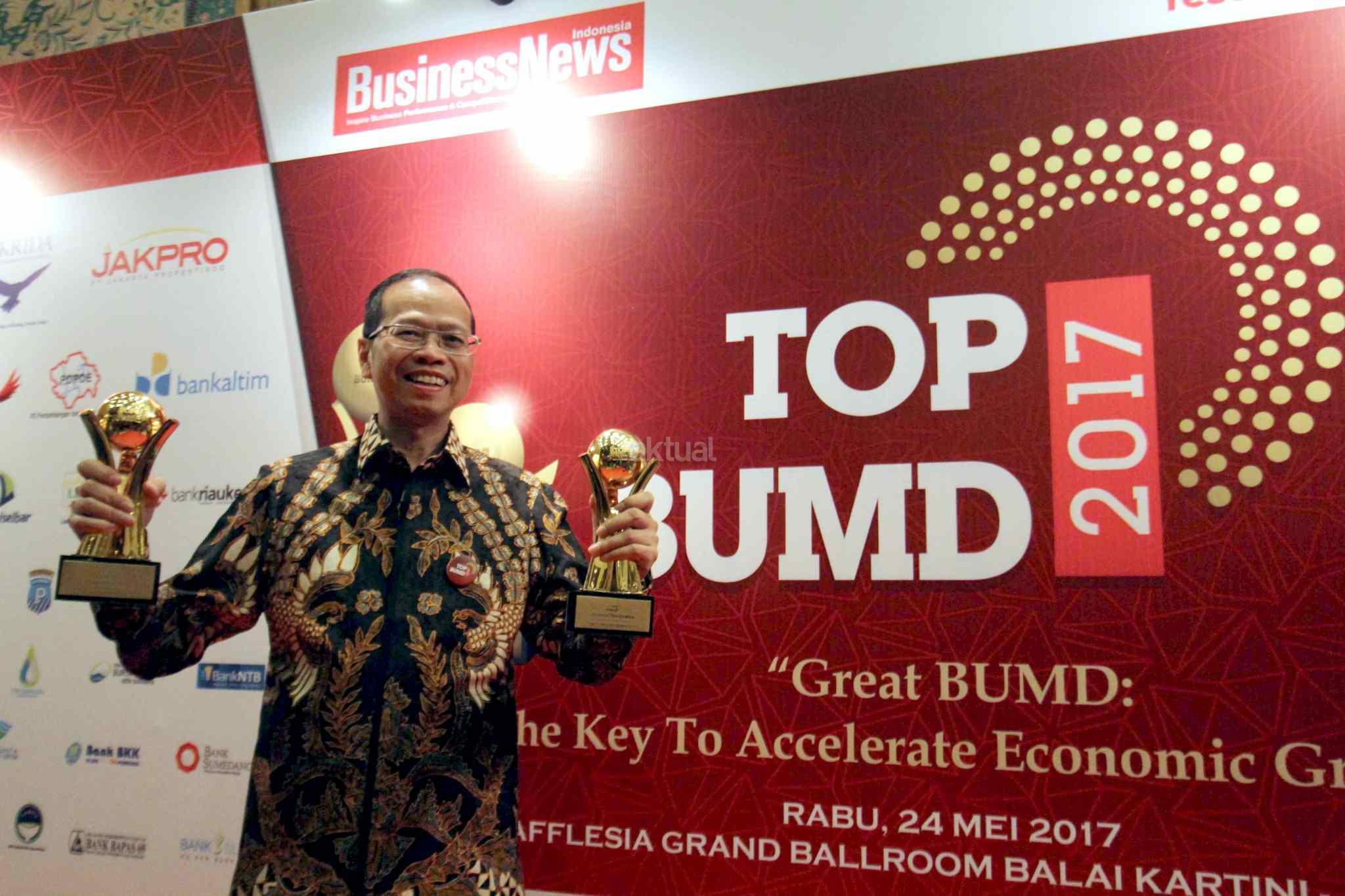 Direktur Utama Bank BJB Ahmad Irfan menunjukan penghargaan yang diterima oleh Bank BJB pada malam penganugerahan TOP BUMD 2017 di Jakarta, Rabu (24/5). Bank BJB berhasil meraih prestasi tertinggi dengan memenangi penghargaan TOP BPD 2017, TOP BUMD 2017, TOP CEO BUMD 2017 serta SWA TOP 100 Valuable Brand. AKTUAL/Tino Oktaviano