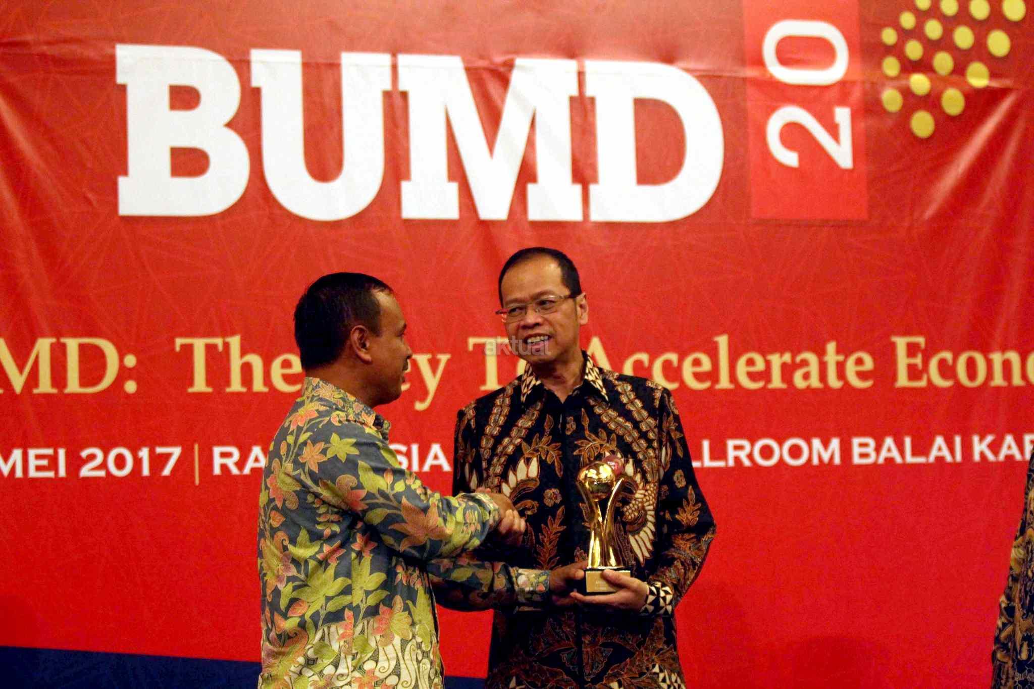 Direktur Utama Bank BJB Ahmad Irfan (kanan) menerima penghargaan kategori TOP BUMD 2017 pada malam penganugerahan TOP BUMD 2017 di Jakarta, Rabu (24/5). Bank BJB berhasil meraih prestasi tertinggi dengan memenangi penghargaan TOP BPD 2017, TOP BUMD 2017 serta TOP CEO BUMD 2017. AKTUAL/Tino Oktaviano