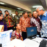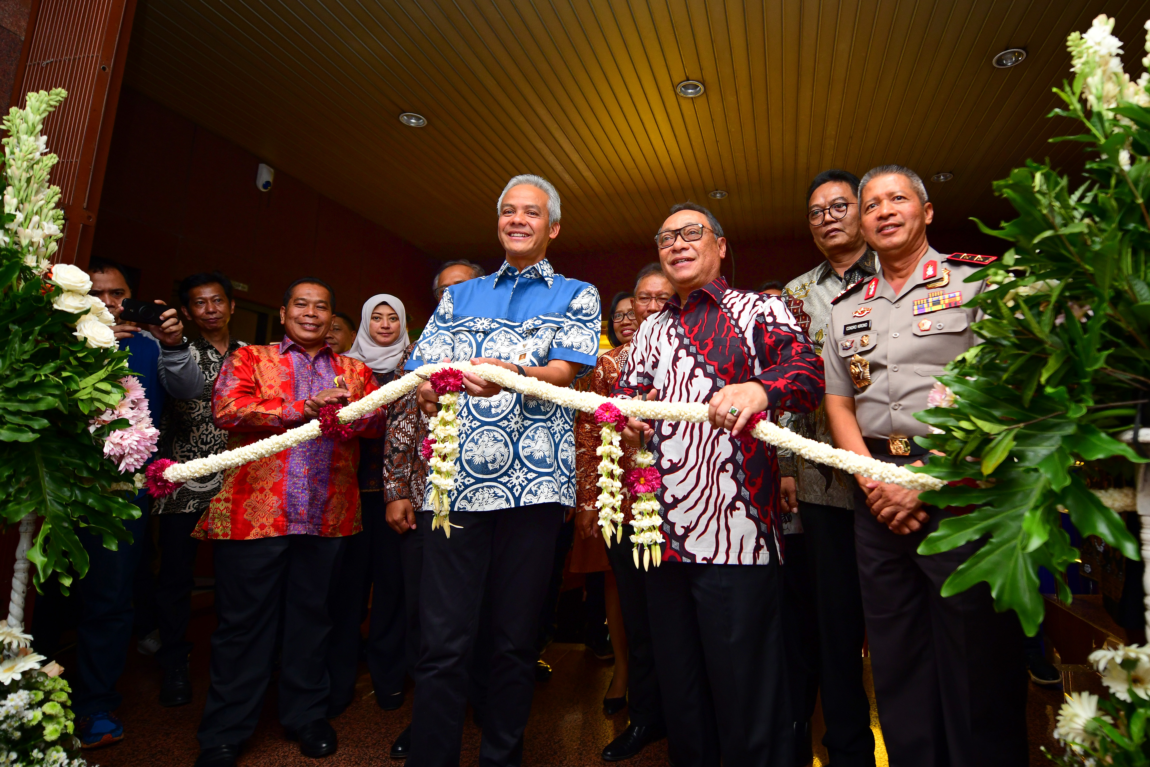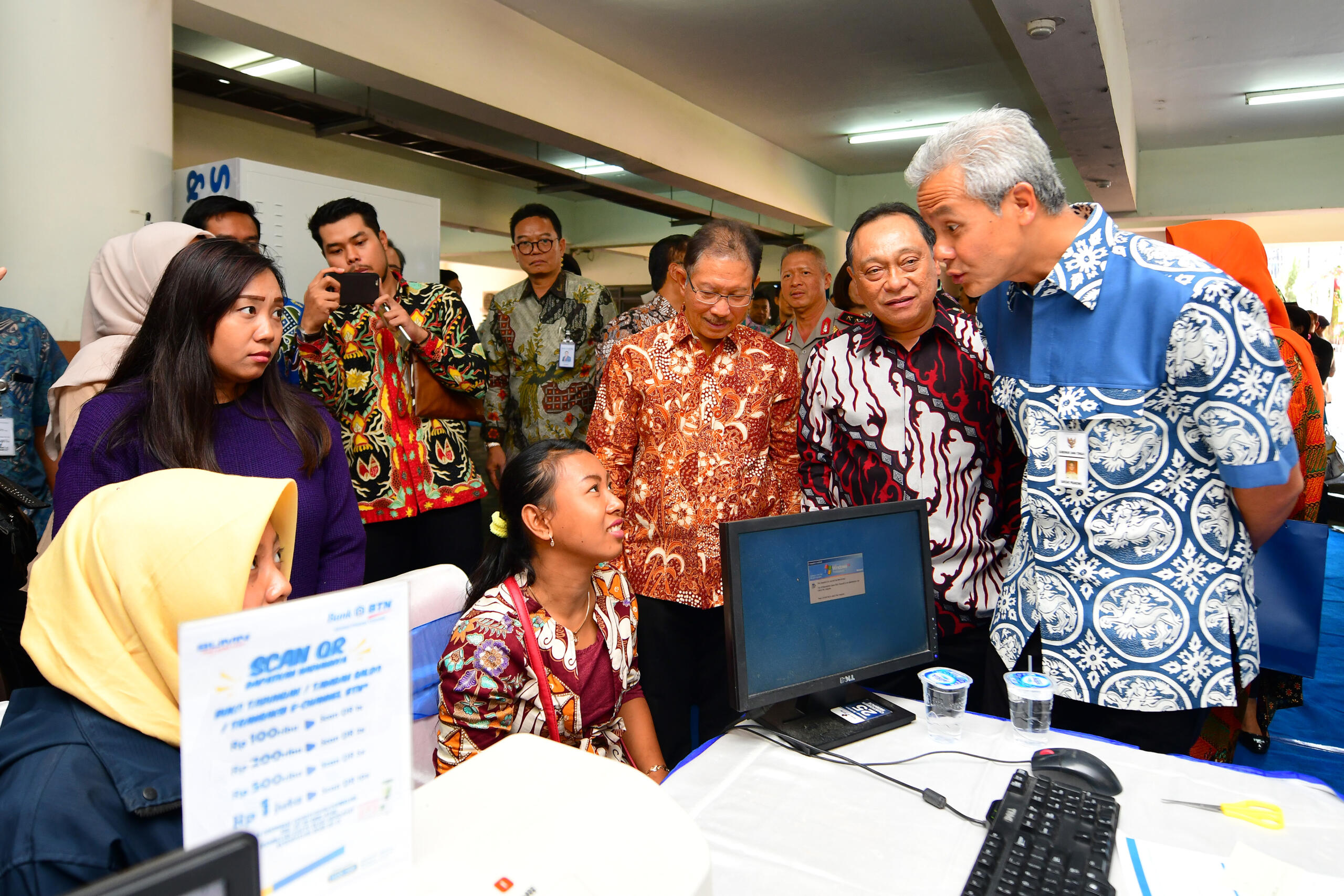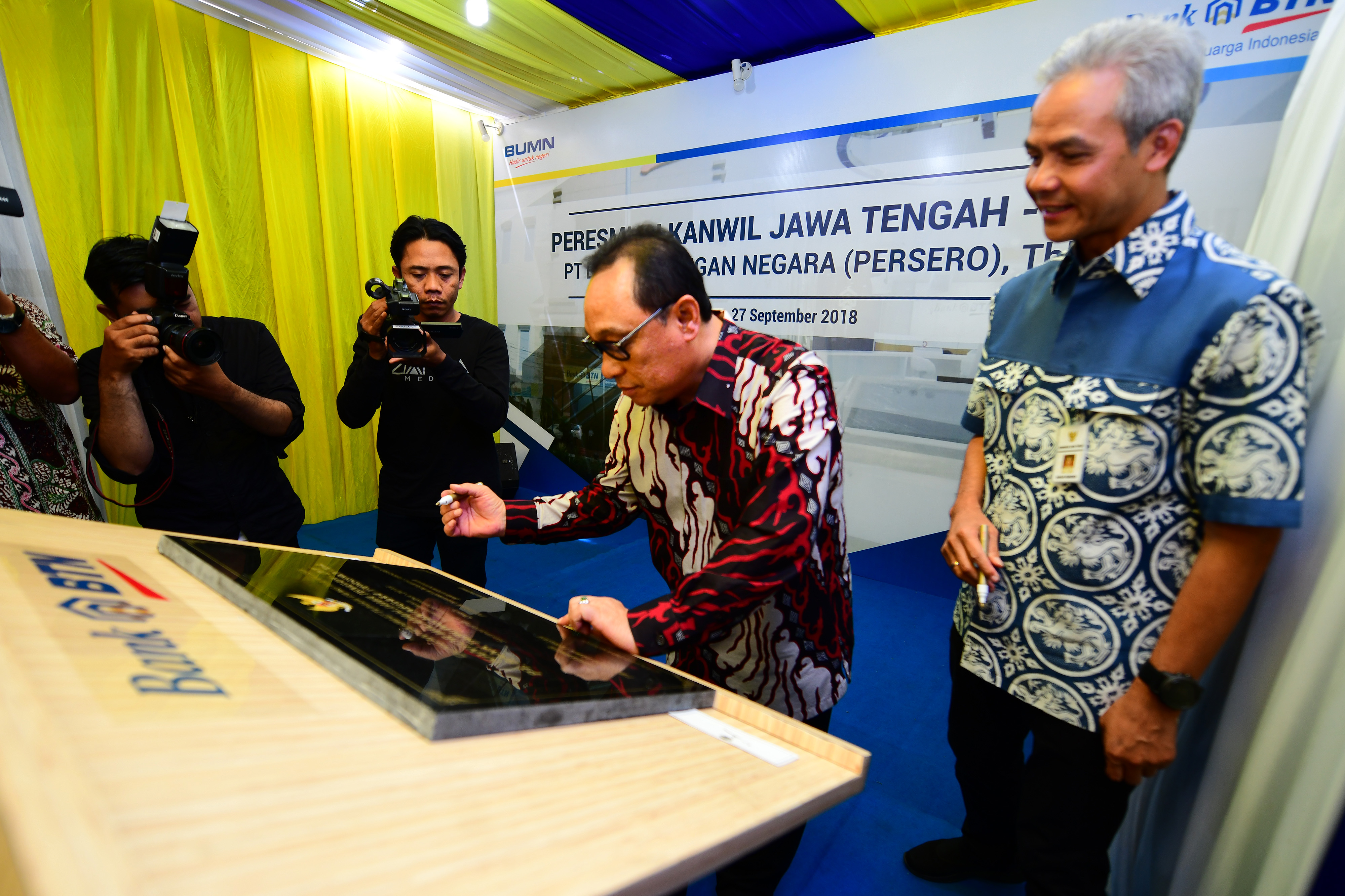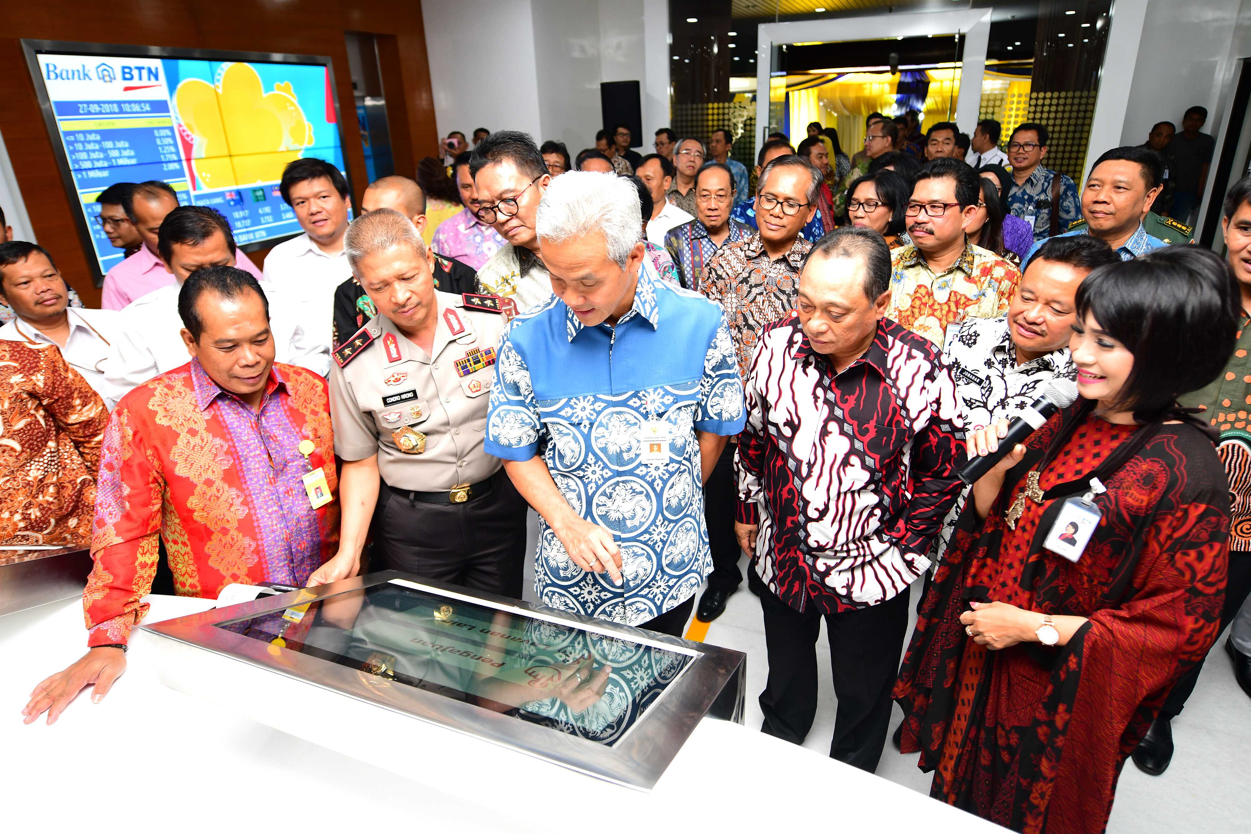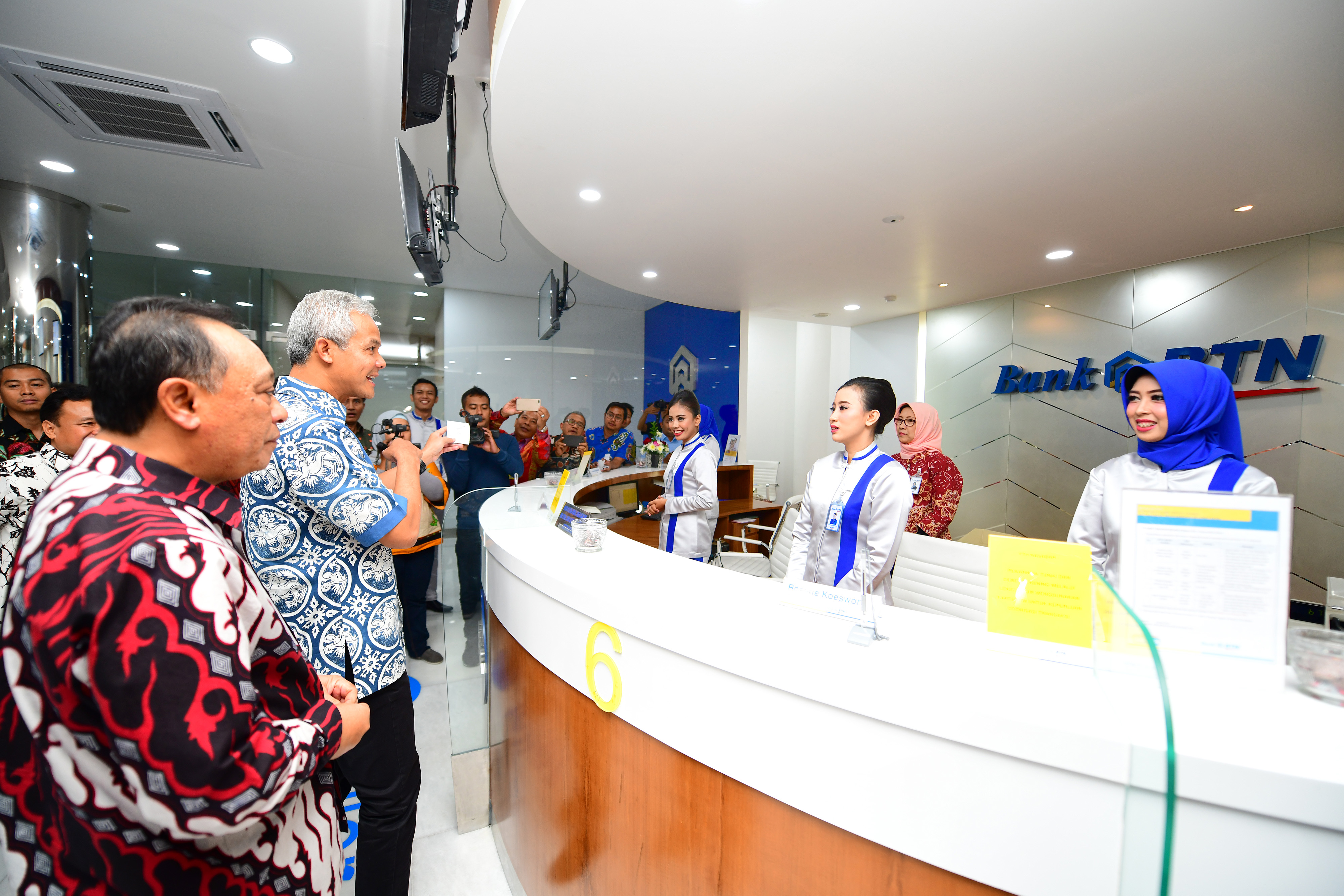 Direktur utama PT Bank Tabungan Negara (Persero) Tbk. Maryono bersama Gubernur Jawa Tengah, Ganjar Pranowo dan Kepala bank Indonesia Jawa Tengah dan DI Yogyakarta Ponco Wibowo meninjau acara akad massal KPR usai membuka Kantor Wilayah VI dan smart branch BTN di Semarang, Jawa Tengah, Kamis (27/9). Pertumbuhan ekonomi yang tinggi di Jateng menjadi alasan Bank BTN lebih ekspansif dengan meningkatkan layanan perbankan lewat smart branch dan menggenjot penyaluran KPR. Bank BTN juga melaksanakan pilot project KPR BTN Mikro dengan skim Academy Business Community dan Government atau ABCG bagi masyarakat berpenghasilan rendah. AKTUAL/Pool