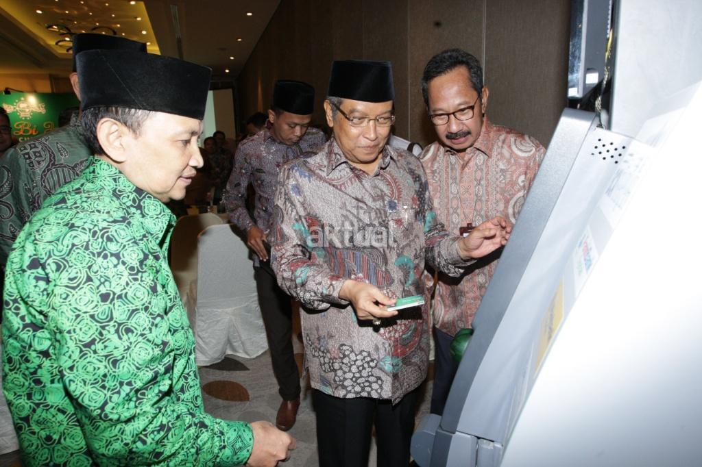 Ketua Umum PB NU Said Aqil Siroj berbincang dengan Direktur Bank BTN Adi Setianto dan Ketua Lembaga Pendidijan Maarif NU Pusat Zainal Arifin Djunaidi saat peluncuran ATM NU dan Kartu tanda Anggota NU, di Jakarta, Senin (24/7/2017). PT Bank Tabungan Negara (Persero) Tbk ikut memberikan dukungan dalam meningkatkan kesejahteraan umat khususnya anggota NU dalam penerbitan ATM NU. Melalui infrastuktur ini diharapkan masyarakat NU akan menjadi mudah terlayani kebutuhannya dalam transaksi perbankan dengan dukungan ATM kerjasama Bank BTN. ATM NU rencananya akan disiapkan di 10.000 titik di seluruh Indonesia baik di lingkungan NU, lingkungan sekolah LP Maarif dan sarana publik. AKTUAL/Eko S Hilman