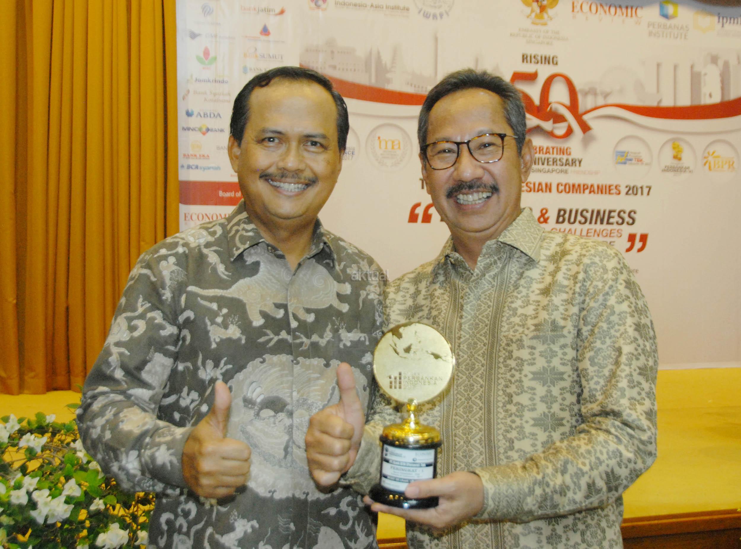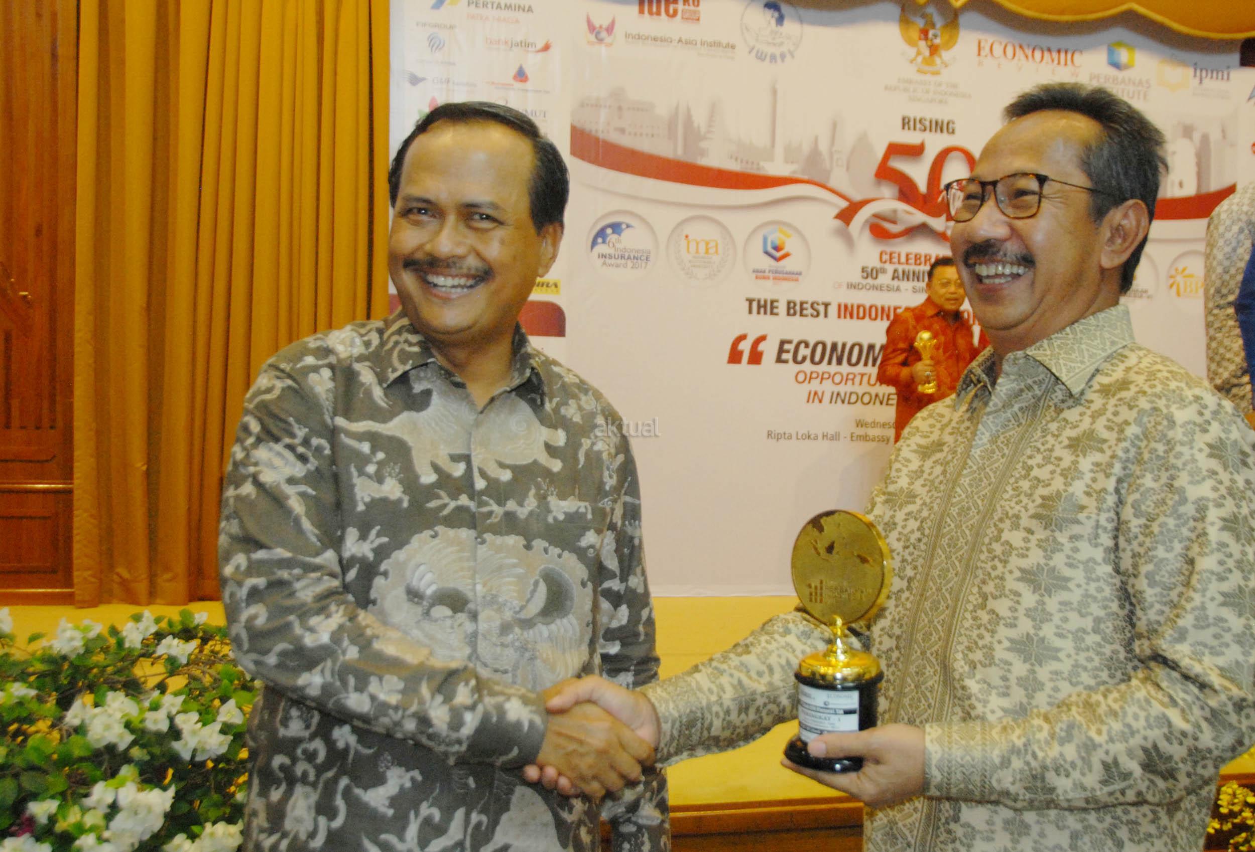 Direktur Bank PT Bank Tabungan Negara Persero Tbk Adi Setianto (kanan) menerima penghargaan dari Dubes RI untuk Singapura Ngurah Swajaya di KBRI Singapura, Rabu (23/8) malam. Bank BTN berhasil menyabet penghargaan sebagai bank terbaik perbankan Indonesia dalam ajang Anugerah Perbankan Indonesia 2017 yang diselenggarakan oleh Perbanas bekerjasama dengan Economic review. BTN juga berhasil menyabet penghargaan yang mengantarkan Direktur Utama BTN Maryono sebagai CEO terbaik perbankan Indonesia 2017. Penghargaan yang diterima BTN itu merupakan hasil penilaian yang dilakukan berdasarkan kinerja perusahaan tahun 2016 dan BTN unggul pada kategori finance, good corporate governance, risk management, legal, human capital, marketing, corporate social responsibility, information technology, dan corporate communication. AKTUAL/Humas BTN