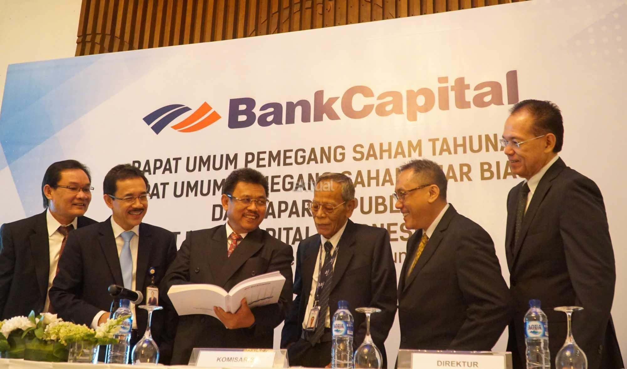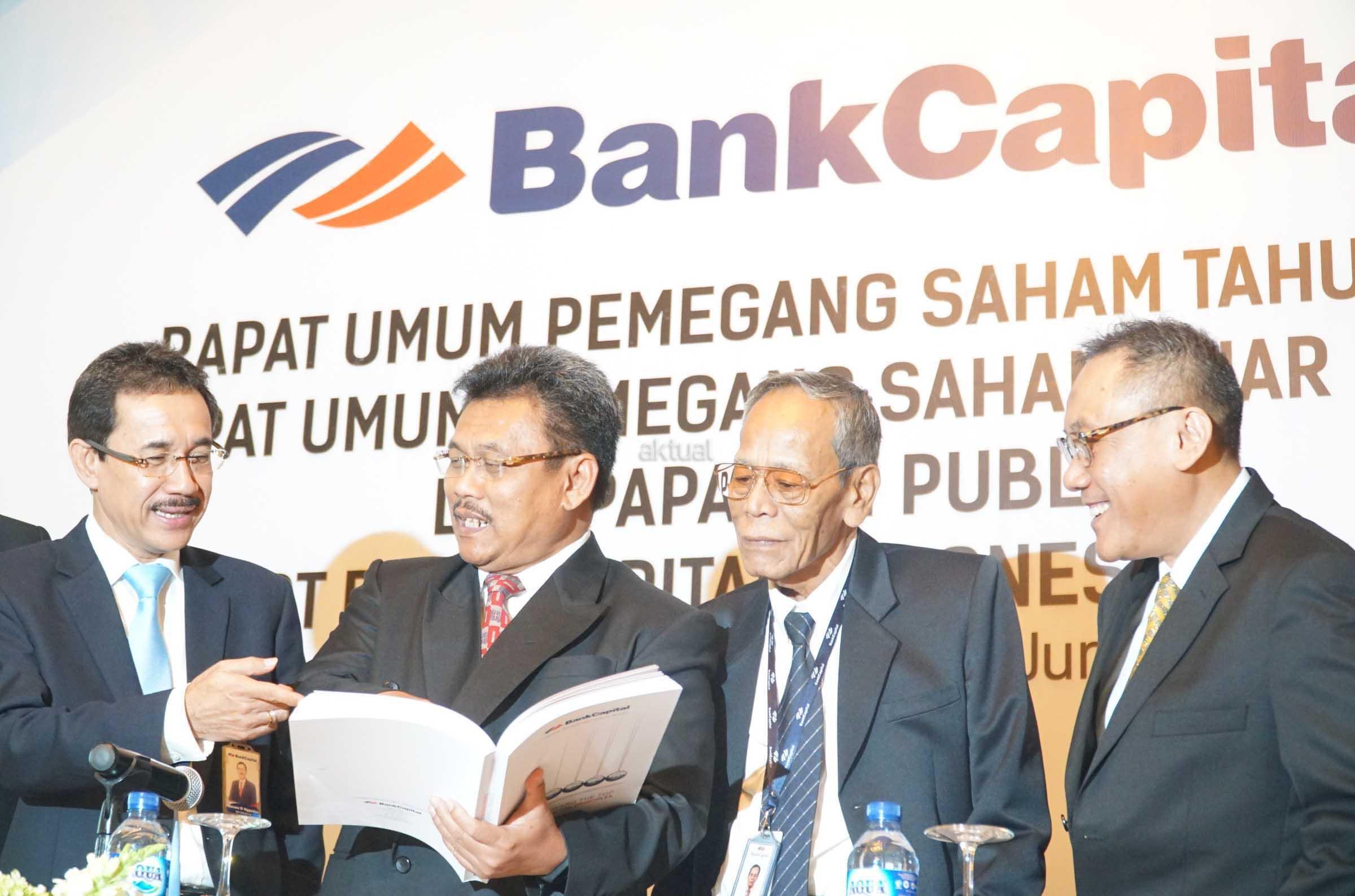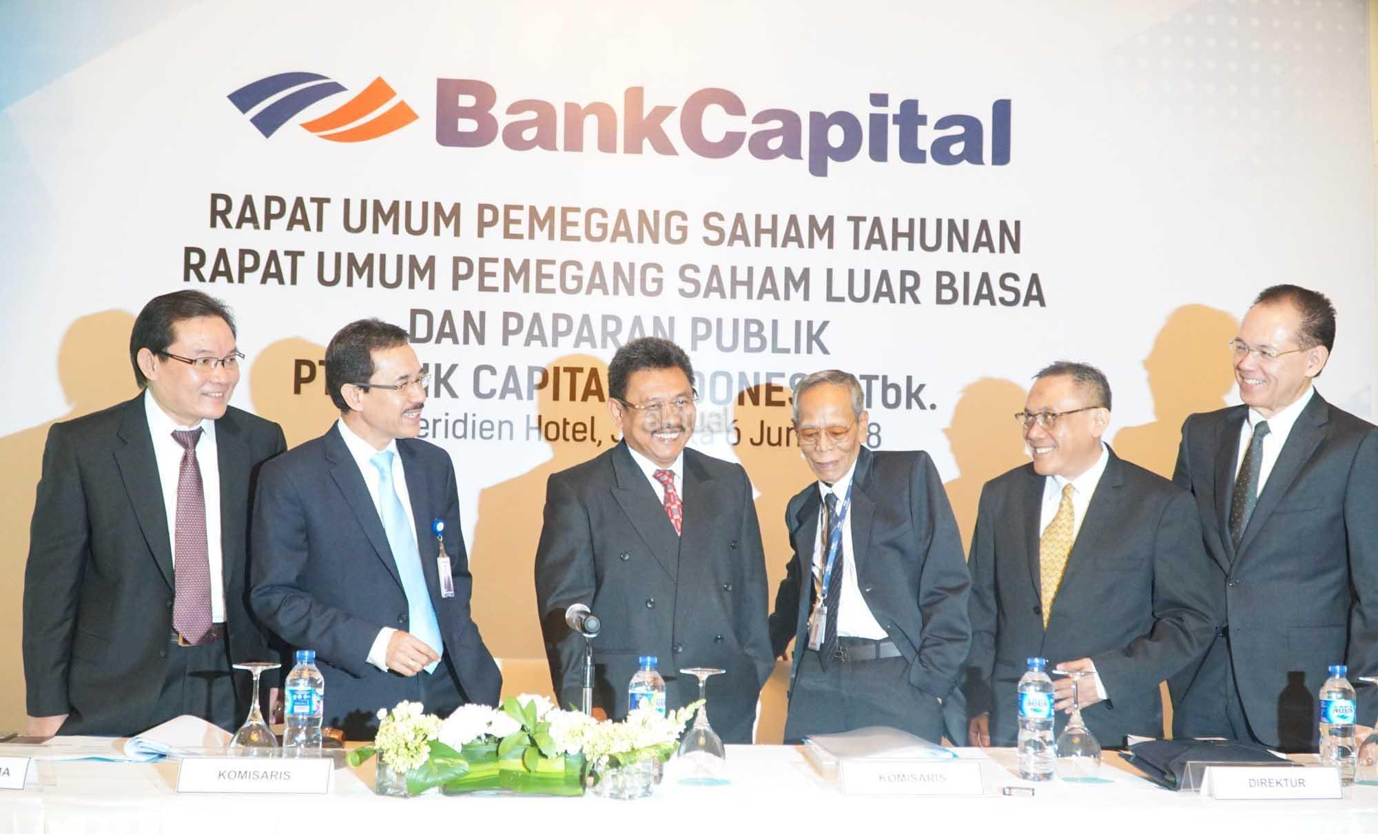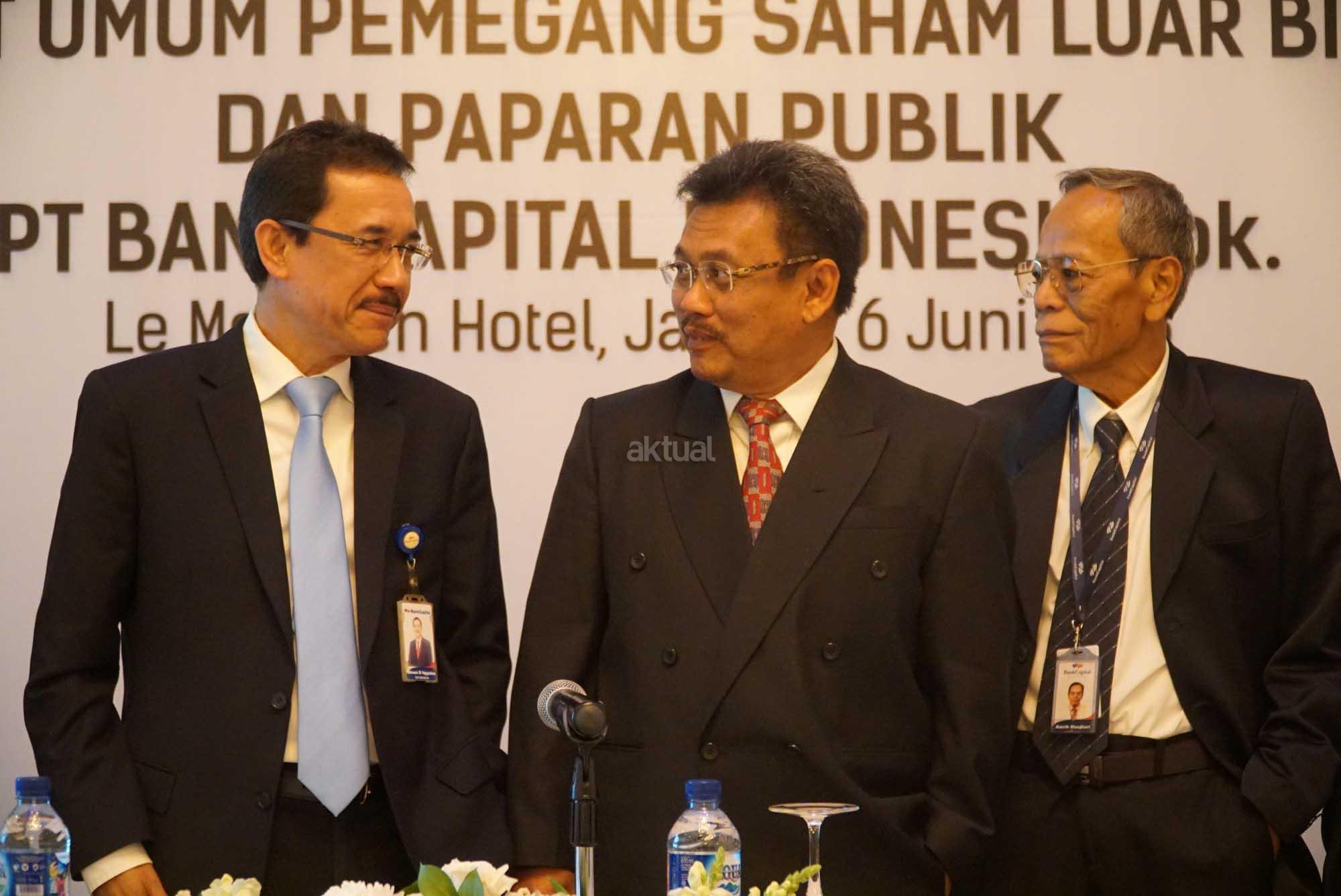 Direktur Utama PT Bank Capital Indonesia Tbk (BACA) Wahyu Dwi Aji (tengah) berbincang dengan jajaran Direksi dan Komisaris, Maxen Bastian Nggadas, Amrih Masjhuri disela paparan publik di Jakarta, Rabu (6/6). PT Bank Capital Indonesia Tbk (BACA) menargetkan pertumbuhan kredit 2018 sebesar 12% secara tahunan atau year on year (yoy). Hingga pada akhir Maret lalu, perusahaan menyalurkan kredit Rp 7,46 triliun. Perolehan ini lebih tinggi 10% dibanding kredit pada Maret 2017 yang sebesar Rp 6,77 triliun. AKTUAL/Eko S Hilman