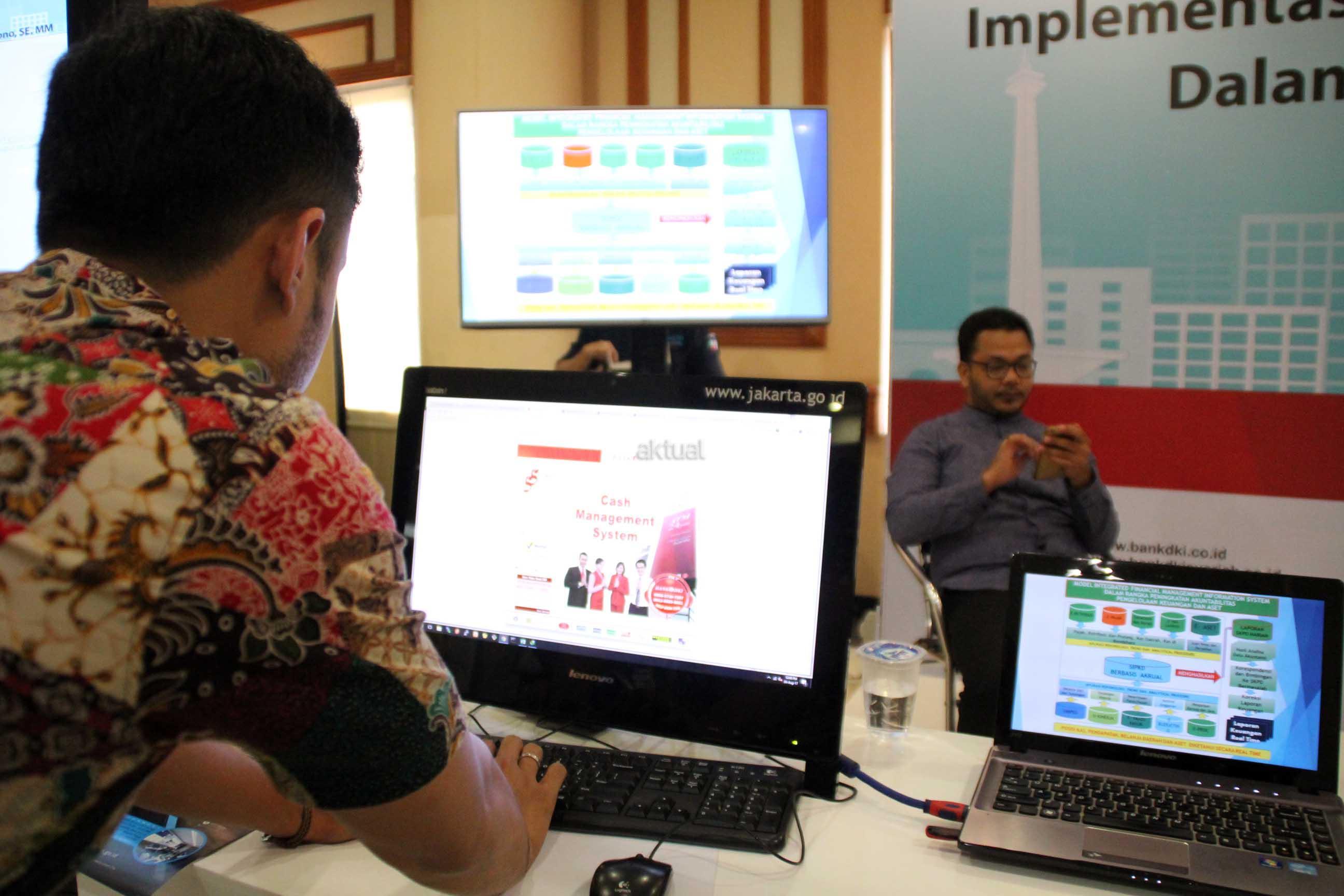 Pegawai Badan Pengelola Keuangan Daerah sedang melakukan demonstrasi penggunaan Cash Management System Bank DKI dalam Implementasi Transaksi Non Tunai Pemprov DKI Jakarta pada acara Ulang Tahun Lembaga Administrasi Negara ke 60 di Jakarta, Kamis (3/8). Bank DKI berkomitmen untuk terus mendukung program Less Cash Pemprov DKI Jakarta. AKTUAL/Eko S Hilman