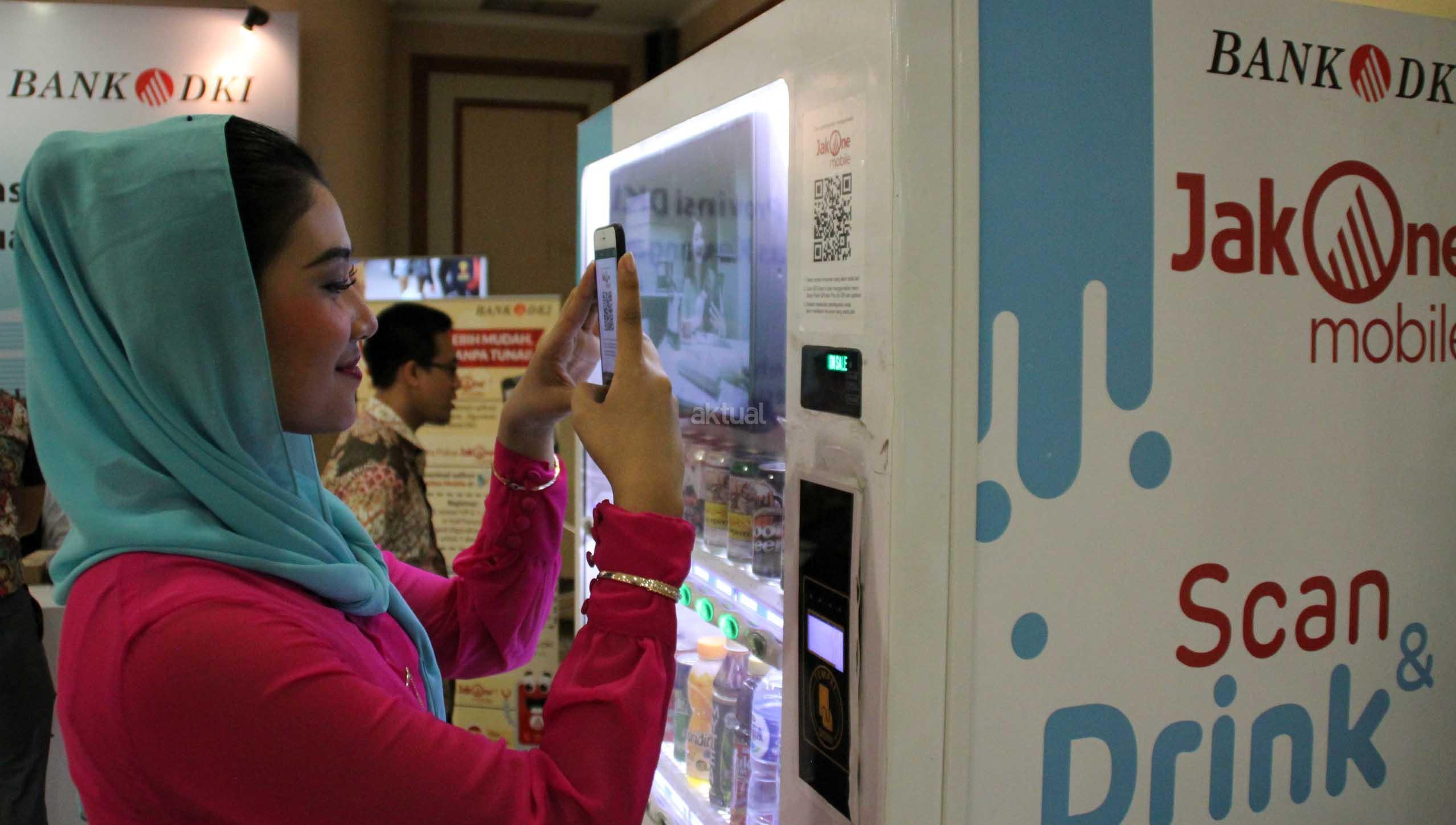 Finalis None Jakarta 2017 melakukan scan barcode disela demonstrasi penggunaan Cash Management System Bank DKI dalam Implementasi Transaksi Non Tunai Pemprov DKI Jakarta pada acara Ulang Tahun Lembaga Administrasi Negara ke 60 di Jakarta, Kamis (3/8). Bank DKI berkomitmen untuk terus mendukung program Less Cash Pemprov DKI Jakarta. AKTUAL/Eko S Hilman