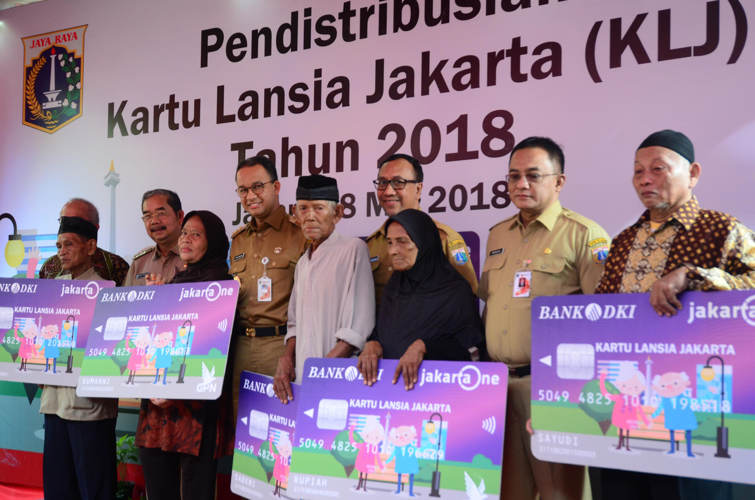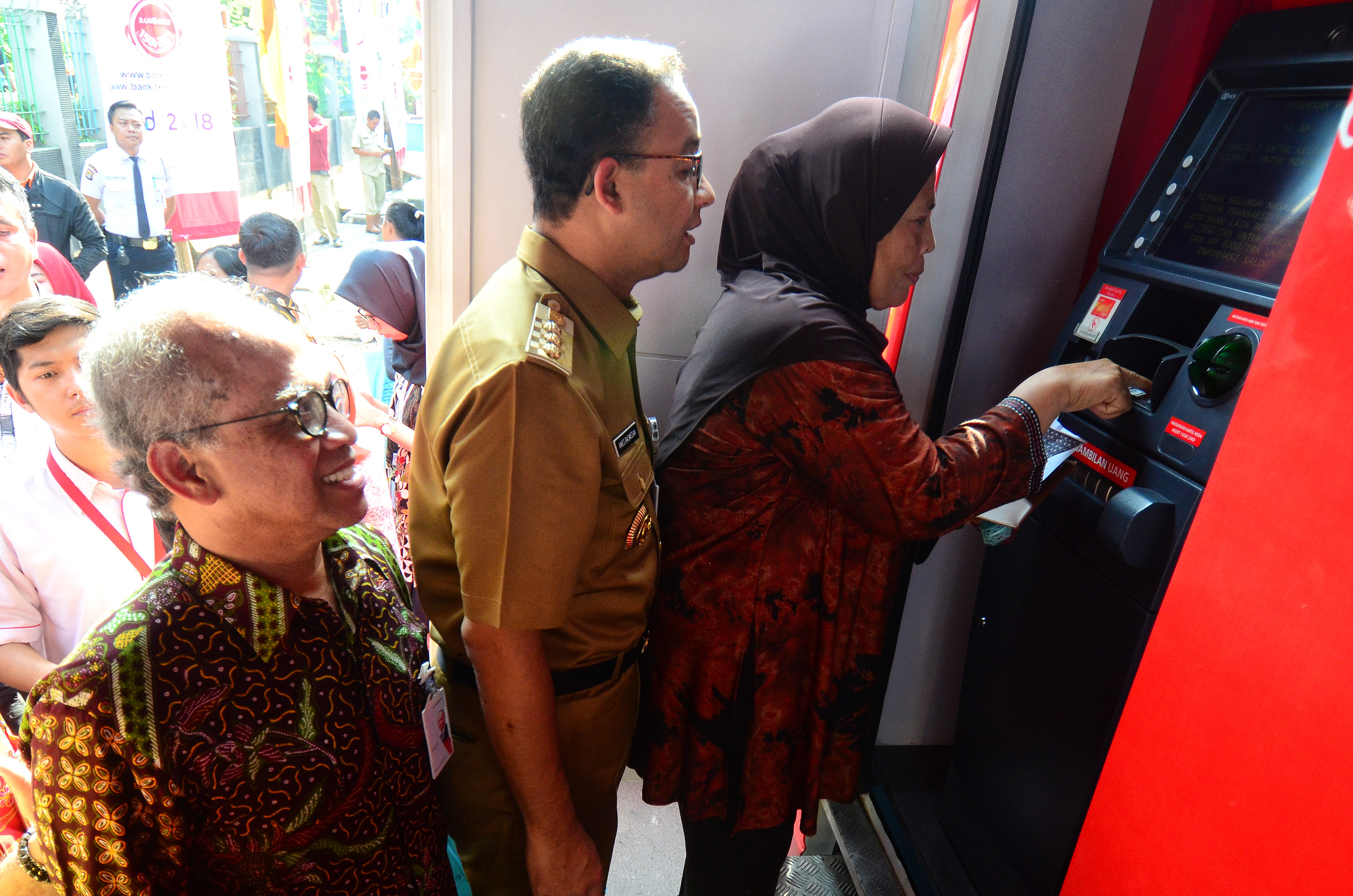 Direktur Utama Bank DKI Kresno Sediarsi (kiri) mendampingi Bapak Gubernur DKI Jakarta Anies Baswedan (tengah), bersama salah satu penerima Kartu Lansia Jakarta (KLJ) usai melakukan penarikan di ATM Bank DKI, di Kramat Pulo Gundul, Kelurahan Tanah Tinggi Jakarta, Selasa (8/5/18). Bank DKI bersama Dinas Sosial DKI Jakarta mendistribusikan Kartu Lansia Jakarta (KLJ) untuk tahap pertama sebanyak 12.141 lansia yang disalurkan. AKTUAL/Eko S Hilman