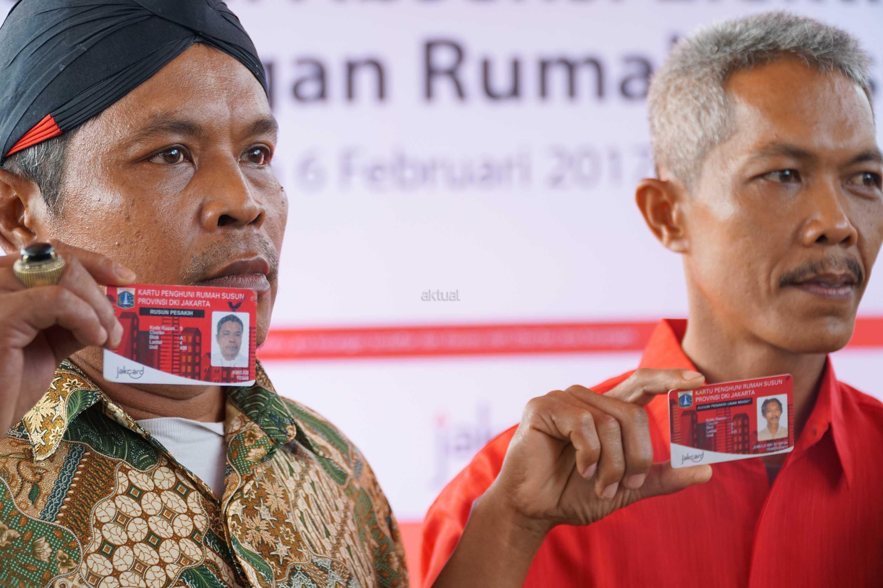 Perwakilan warga penghuni rusun memperlihatkan kartu rusun di rusun Pesakih, Kalideres, Jakarta Barat seusai peresmiaan pengunaannya Senin (6/2). Pengunaaan abesensi elektronik lingkungan rumah susun yang telah mulai diimplementasikan sejak Agustus 2016 lalu, Hingga saat ini sudah sebanyak 9.459 penghuni atau 70% dari total 13.731 penghuni rumah susun yang telah memiliki kartu jakarta one (kartu rusun) di 23 rumah susun milik Pemprov DKI Jakarta. Absensi elektronik digunakan sebagai media otensifikasi atau pengecekan dan absensi penghuni rusun secara berkala sesuai dengan ketentuan dari Dinas Perumahan. AKTUAL/Eko S Hilman