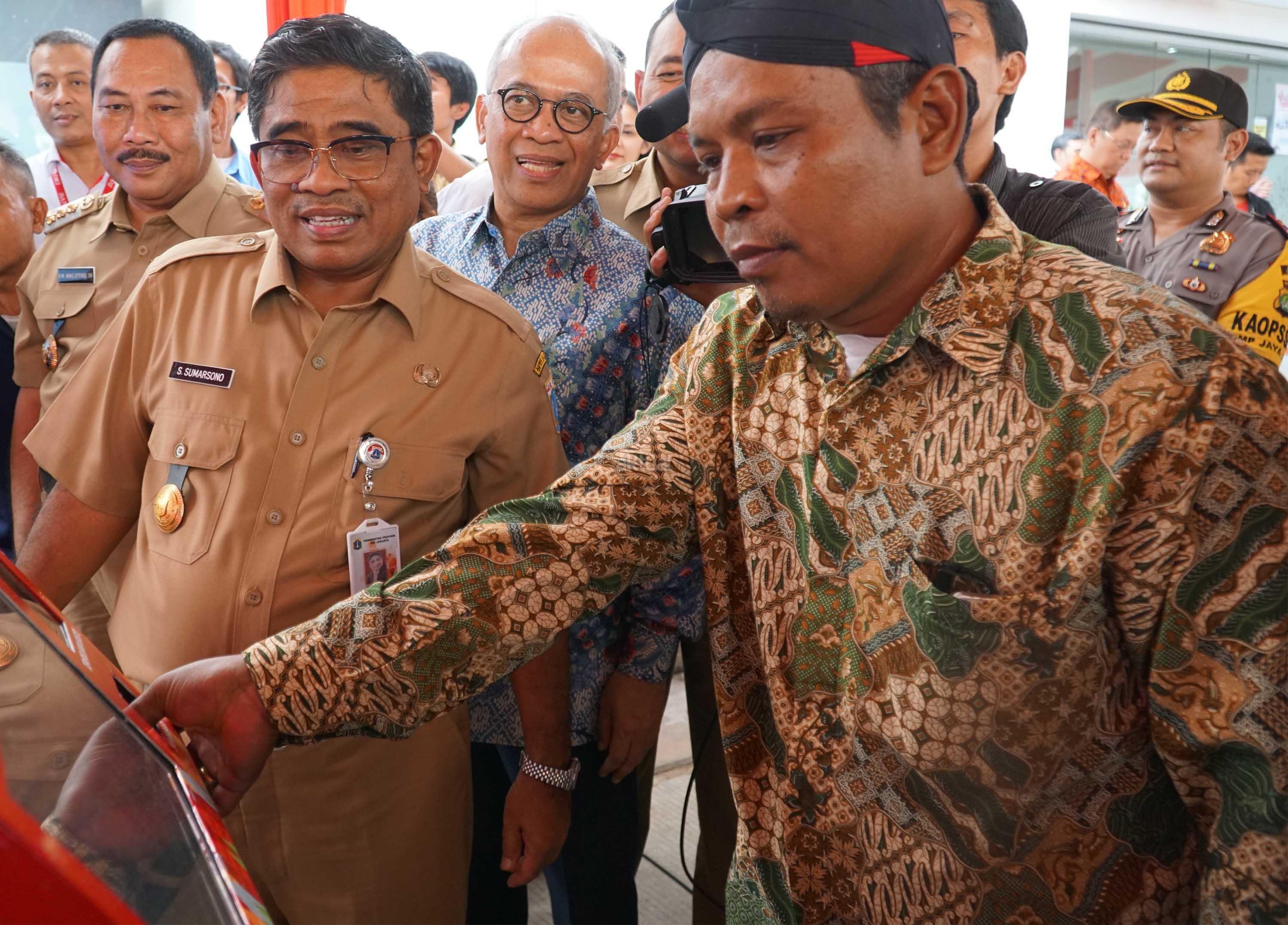 Plt Gubernur DKI Jakarta,Soni Sumarsono (kiri) didampingi Direktur Utama Bank DKI, Kresno Sediarsi (kedua dari kiri), serta Kepala Dinas Perumahan DKI, Arifin menyaksikan warga melakukan tapping kartu Jakarta One untuk penghuni rusun Pesakih, Kalideres, Jakarta Barat seusai peresmiaan pengunaannya Senin (6/2). Pengunaaan absensi elektronik lingkungan rumah susun yang telah mulai diimplementasikan sejak Agustus 2016 lalu, Hingga saat ini sudah sebanyak 9.459 penghuni atau 70% dari total 13.731 penghuni rumah susun yang telah memiliki kartu jakarta one (kartu rusun) di 23 rumah susun milik Pemprov DKI Jakarta. Absensi elektronik digunakan sebagai media otensifikasi atau pengecekan dan absensi penghuni rusun secara berkala sesuai dengan ketentuan dari Dinas Perumahan. AKTUAL/Eko S Hilman