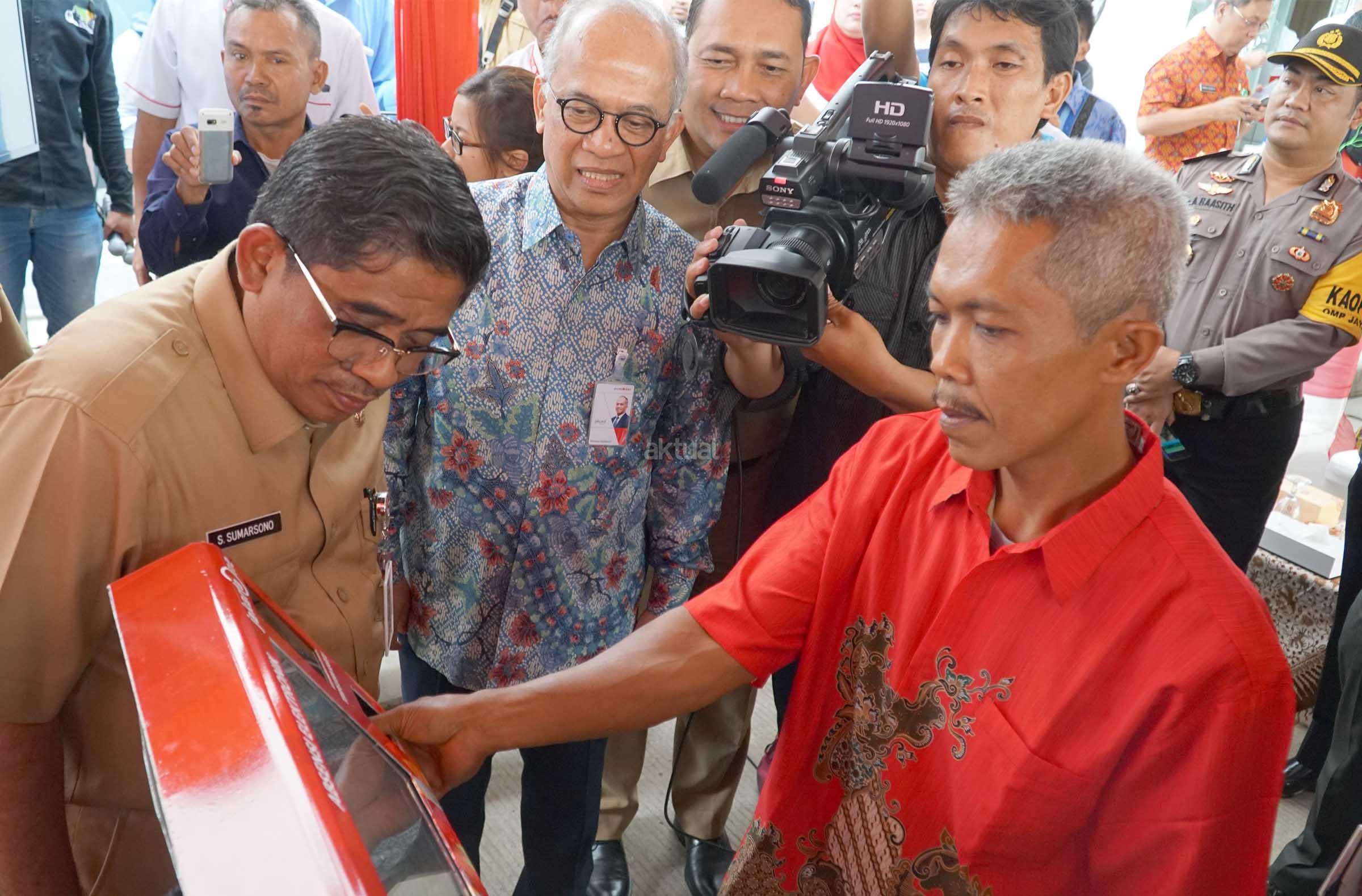 Plt Gubernur DKI Jakarta,Soni Sumarsono (kanan) mnyerahkan kartu Jakarta One kepada perwakilan penghuni di rusun Pesakih, Kalideres, Jakarta Barat seusai peresmiaan pengunaannya Senin (6/2). Pengunaaan abesensi elektronik lingkungan rumah susun yang telah mulai diimplementasikan sejak Agustus 2016 lalu, Hingga saat ini sudah sebanyak 9.459 penghuni atau 70% dari total 13.731 penghuni rumah susun yang telah memiliki kartu jakarta one (kartu rusun) di 23 rumah susun milik Pemprov DKI Jakarta. Absensi elektronik digunakan sebagai media otensifikasi atau pengecekan dan absensi penghuni rusun secara berkala sesuai dengan ketentuan dari Dinas Perumahan. AKTUAL/Eko S Hilman