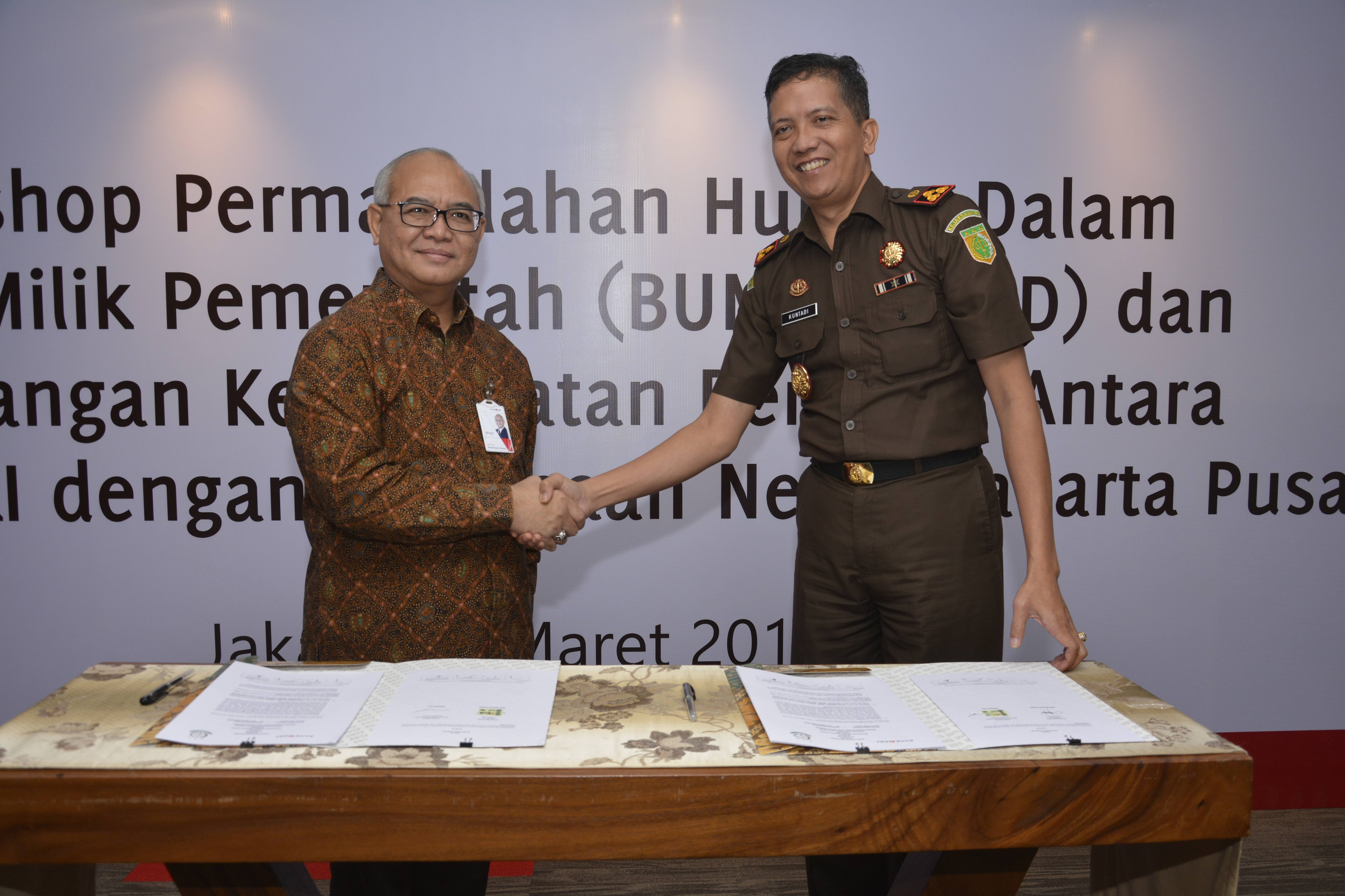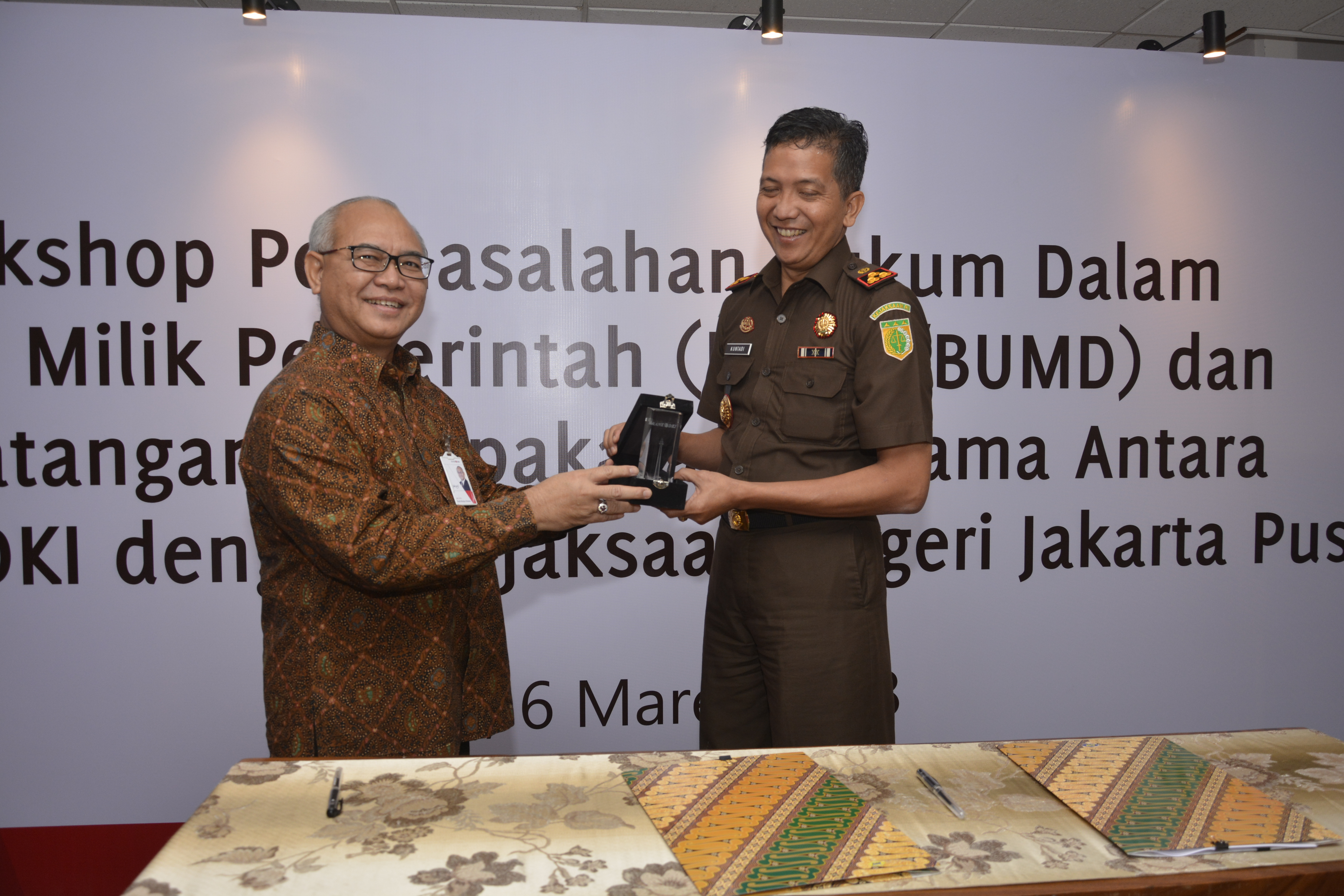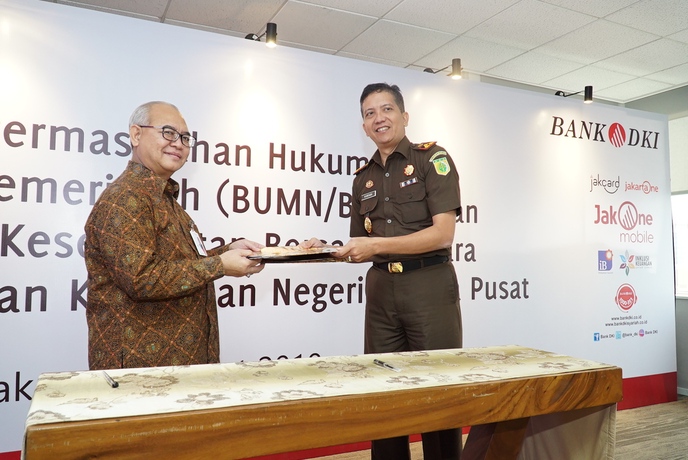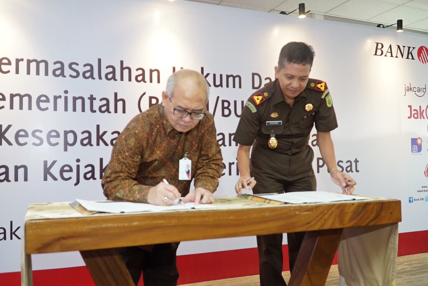 Direktur Kepatuhan Bank DKI Budi Mulyo Utomo (kiri) foto bersama Kepala Kejaksaan Negeri Jakarta Pusat, Kuntadi usai melakukan penandatanganan kesepakatan bersama antara Bank DKI dengan Kejaksaan Negeri Jakarta Pusat tentang penanganan masalah hukum bidang perdata dan tata usaha negara di Kantor Pusat Bank DKI, Jakarta, Selasa (6/3). Kesepakatan dengan Kejaksaan Negeri Jakarta Pusat tersebut merupakan bukti komitmen Bank DKI dalam penerapan tata kelola perusahaan, khususnya dalam penanganan permasalahan hukum perdata dan tata usaha negara. AKTUAL/Eko S Hilman