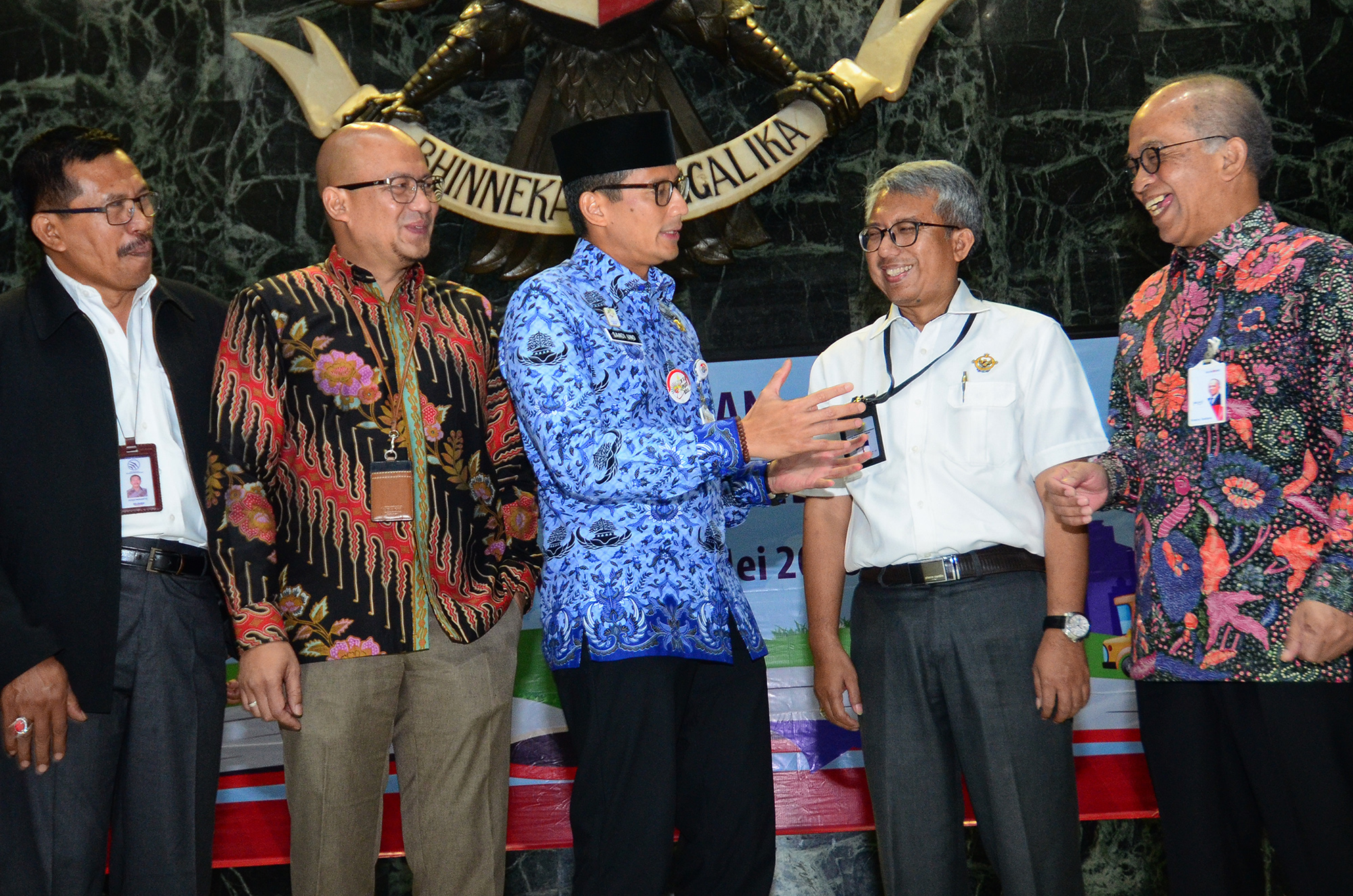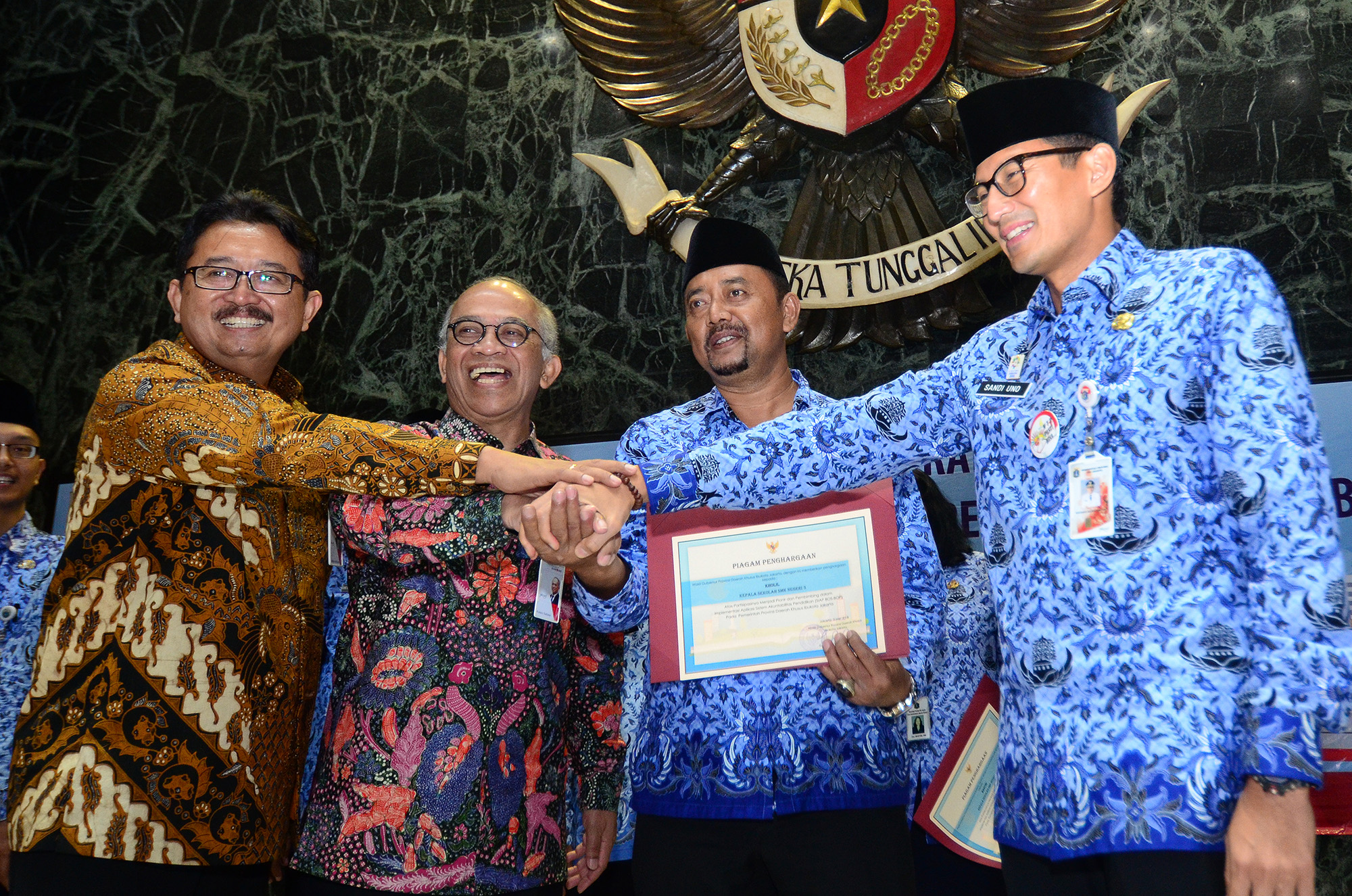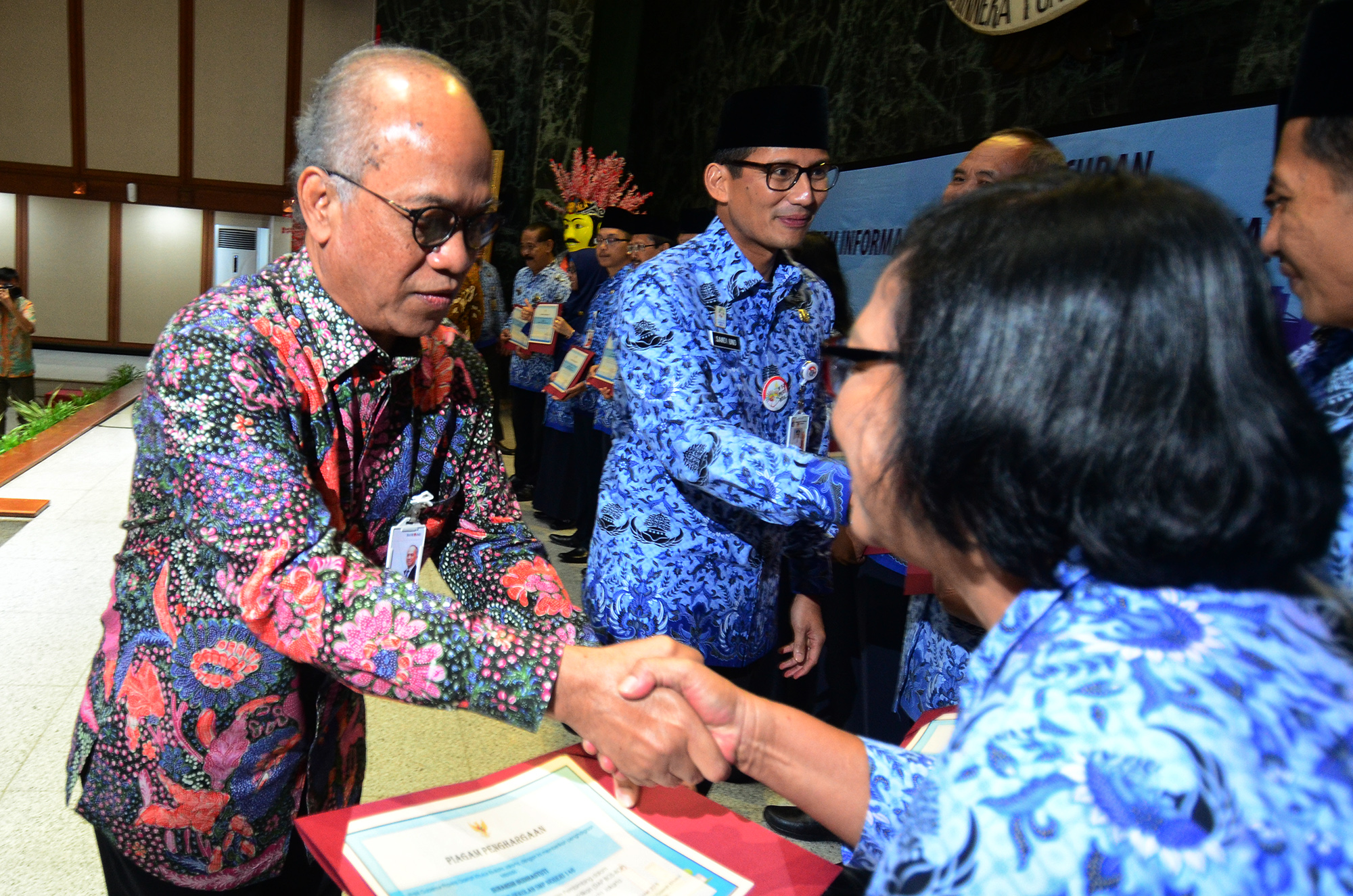 Dari kiri ke kanan, Direktur Bisnis Bank DKI Antonius Widodo, Direktur Utama Bank DKI Kresno Sediarsi, dan Pelaksana Harian Gubernur DKI Jakarta Sandiaga Uno berfoto bersama dengan salah satu Kepala Sekolah penerima penghargaan usai peluncuran Sistem Informasi Akuntabilitas Pendidikan SIAP BOS BOP di Jakarta, Rabu (2/5). Dukung peningkatan akuntabilitas pengelolaan keuangan di sektor pendidikan di DKI Jakarta, Bank DKI turut berpartisipasi membangun SIAP BOS BOP berbasis Cash Management System (CMS) Bank DKI yang diberi nama CMS – SIAP BOS BOP. Per Maret 2018 jumlah transaksi SIAP BOS BOP telah mencapai 141.725 transaksi dengan nominal sebesar Rp425,89 miliar. AKTUAL/Tino Oktaviano