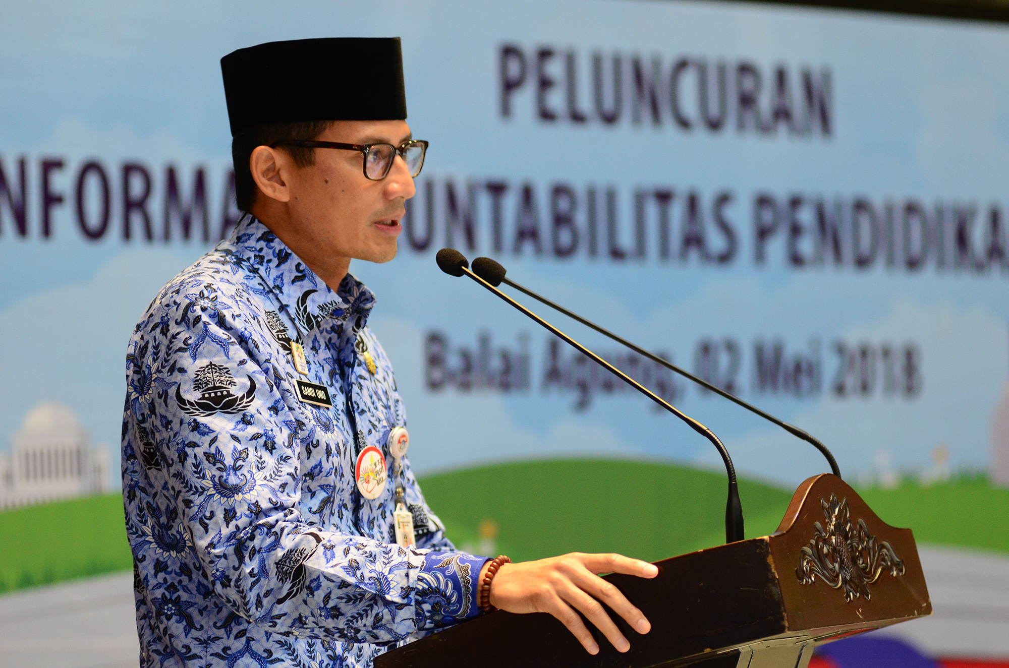 Pelaksana Harian Gubernur DKI Jakarta Sandiaga Uno memberikan sambutan saat peluncuran Sistem Informasi Akuntabilitas Pendidikan SIAP BOS BOP di Jakarta, Rabu (2/5). Dukung peningkatan akuntabilitas pengelolaan keuangan di sektor pendidikan di DKI Jakarta, Bank DKI turut berpartisipasi membangun SIAP BOS BOP berbasis Cash Management System (CMS) Bank DKI yang diberi nama CMS – SIAP BOS BOP. Per Maret 2018 jumlah transaksi SIAP BOS BOP telah mencapai 141.725 transaksi dengan nominal sebesar Rp425,89 miliar. AKTUAL/Tino Oktaviano
