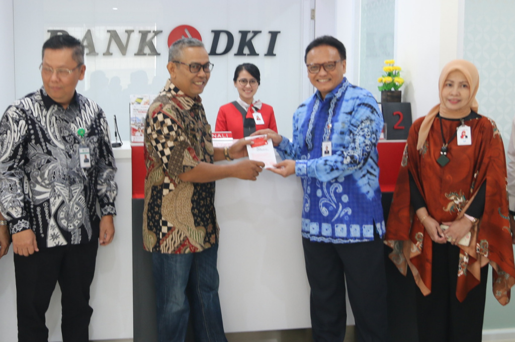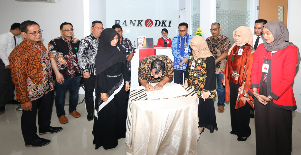 Direktur Teknologi dan Operasional Bank DKI, Priagung Suprapto (ketiga kanan), bersama Direktur Food Station Tjipinang Jaya, Thomas Hadinata (ketiga kiri), Komisaris Food Station Tjipinang Jaya, Masrokhan (kedua kiri) dan Pemimpin Grup Pengembangan Jaringan Bank DKI, Romy Wijayanto (kiri) menyaksikan penandatanganan akad kredit usai peresmian Kantor Layanan Bank DKI di Pasar Induk Beras Cipinang di Jakarta, Selasa (30/7). AKTUAL/Dok Bank DKI