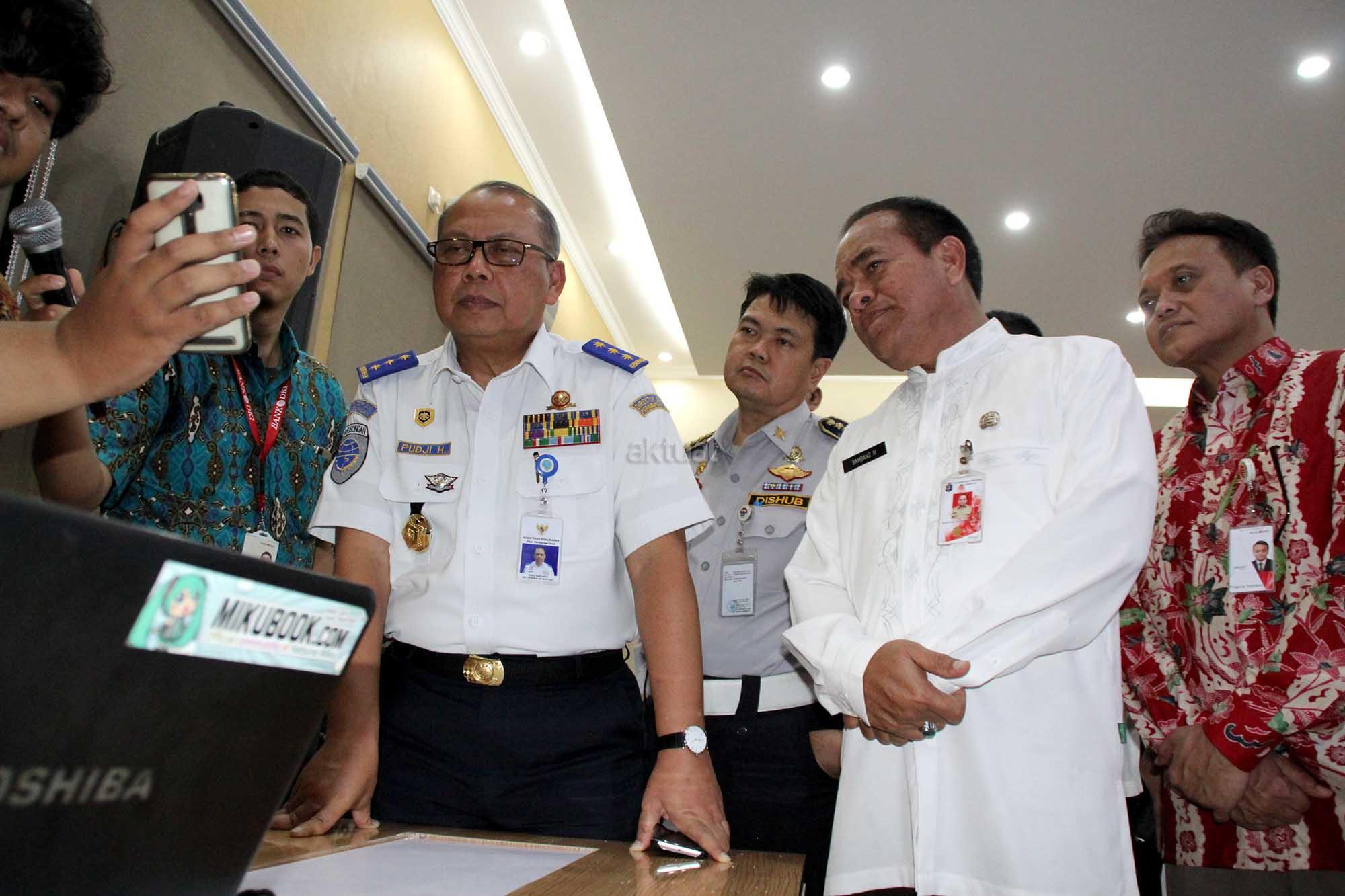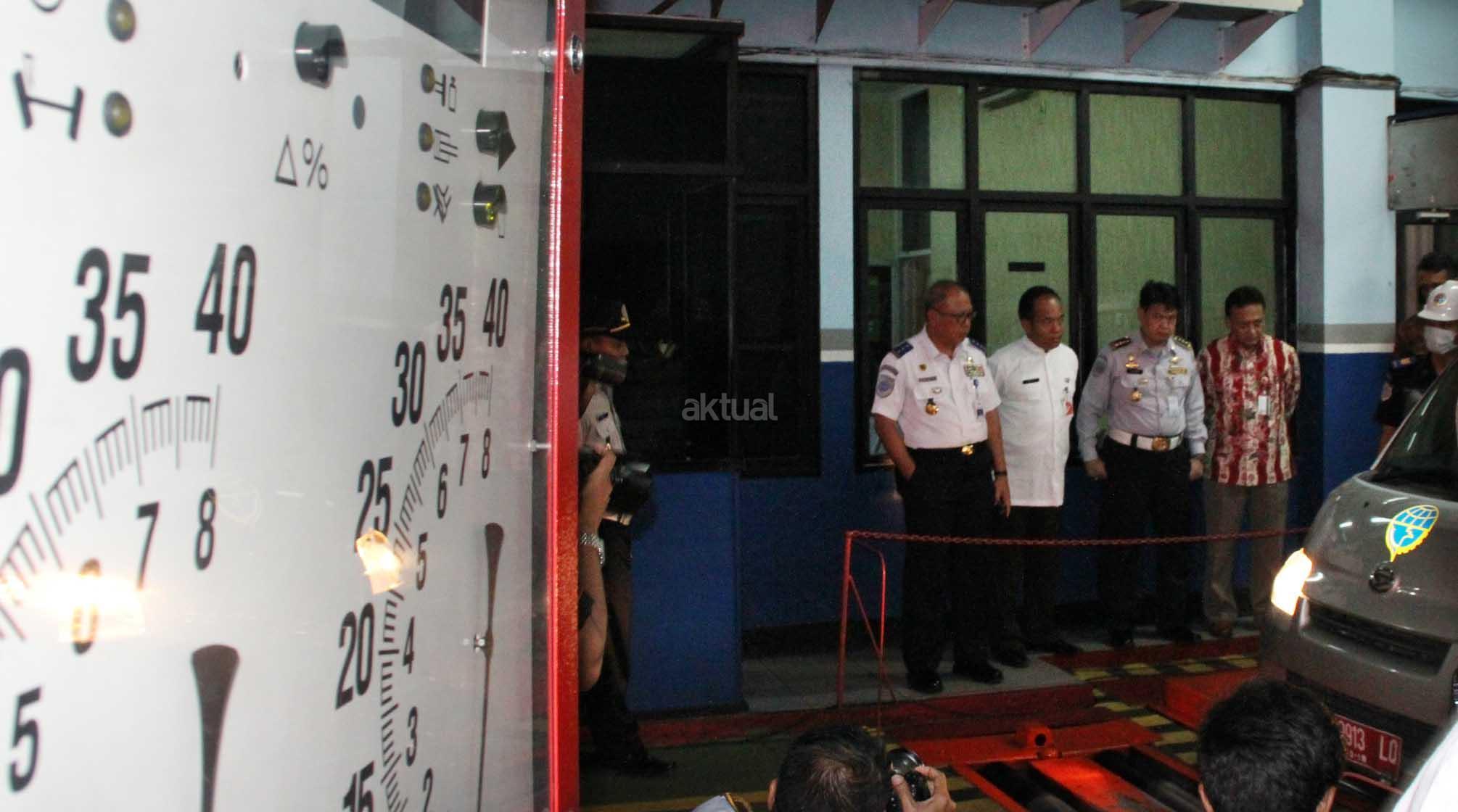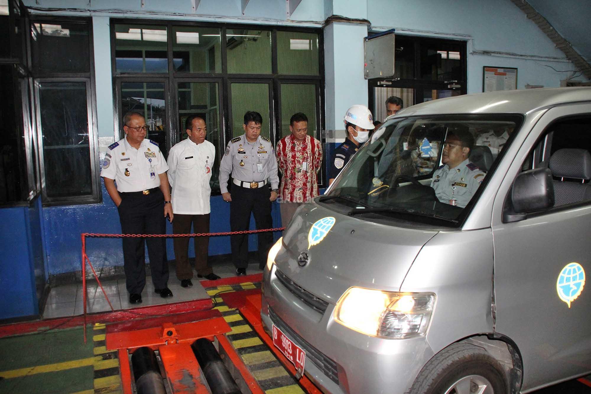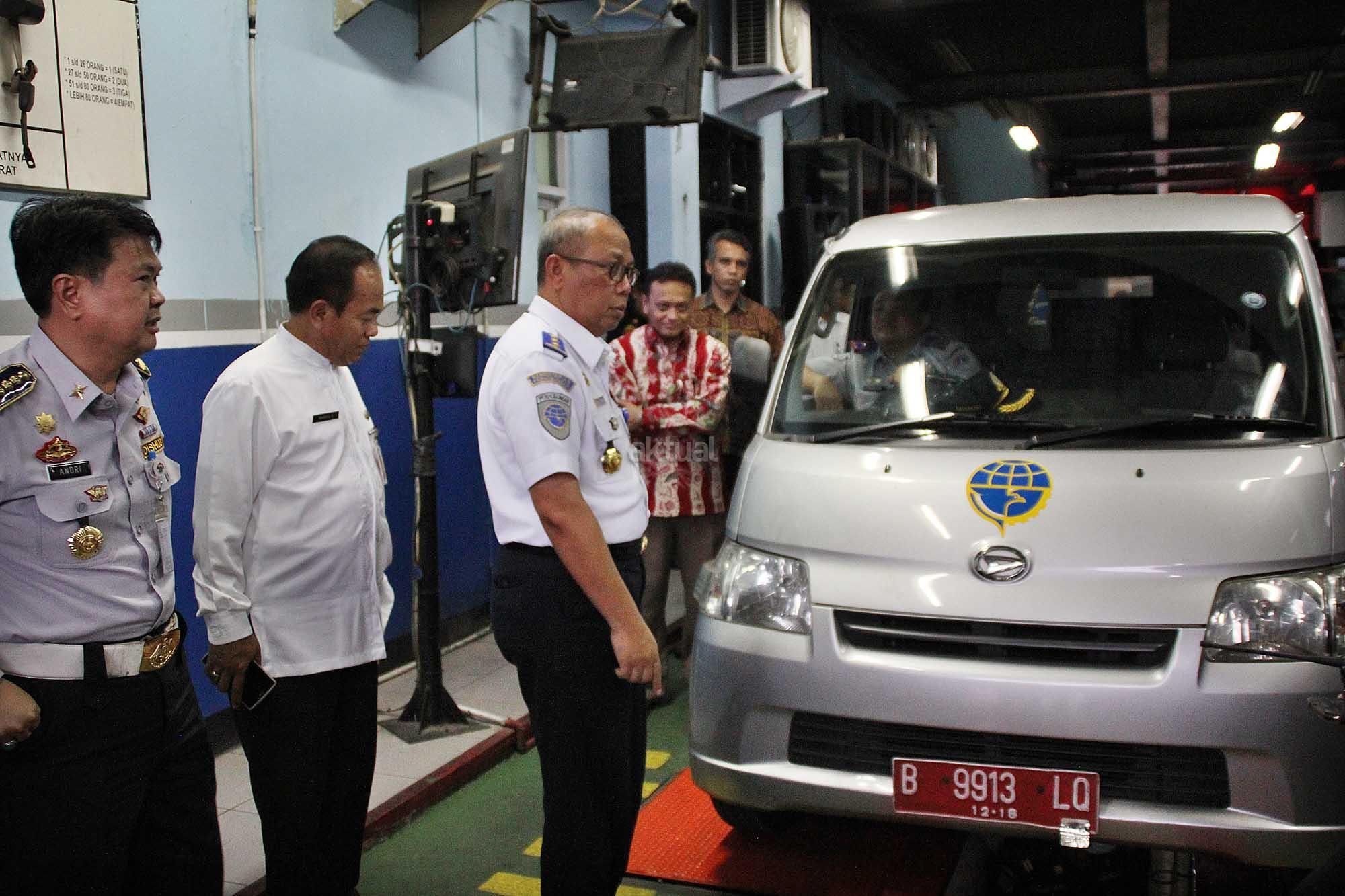 Dirjen Perhubungan Darat Kemenhub Pudji Hartanto (tengah) didampingi Direktur Teknologi & Operasional Bank DKI Priagung Suprapto mendengarkan penjelasan petugas meninjau test kendaraan usai peresmian aplikasi booking online (E-KIR) dan sistem drivethru pelayanan uji KIR di jakarta 27 Oktober 2016.Mekanisme pembayaran uji KIR bisa dilakukan melalui loket drivethru yang ada di PKB KIR,ATM Bank DKI,JakMobile Bank DKI dan Virtual Account Bank DKI.Pembayaran uji KIR melalui digital channel Bank DKI ini merupakan bentuk dukungan Bank DKI terhadap less cash society yang didorong oleh Pemprov DKI. AKTUAL/Eko S HIlman