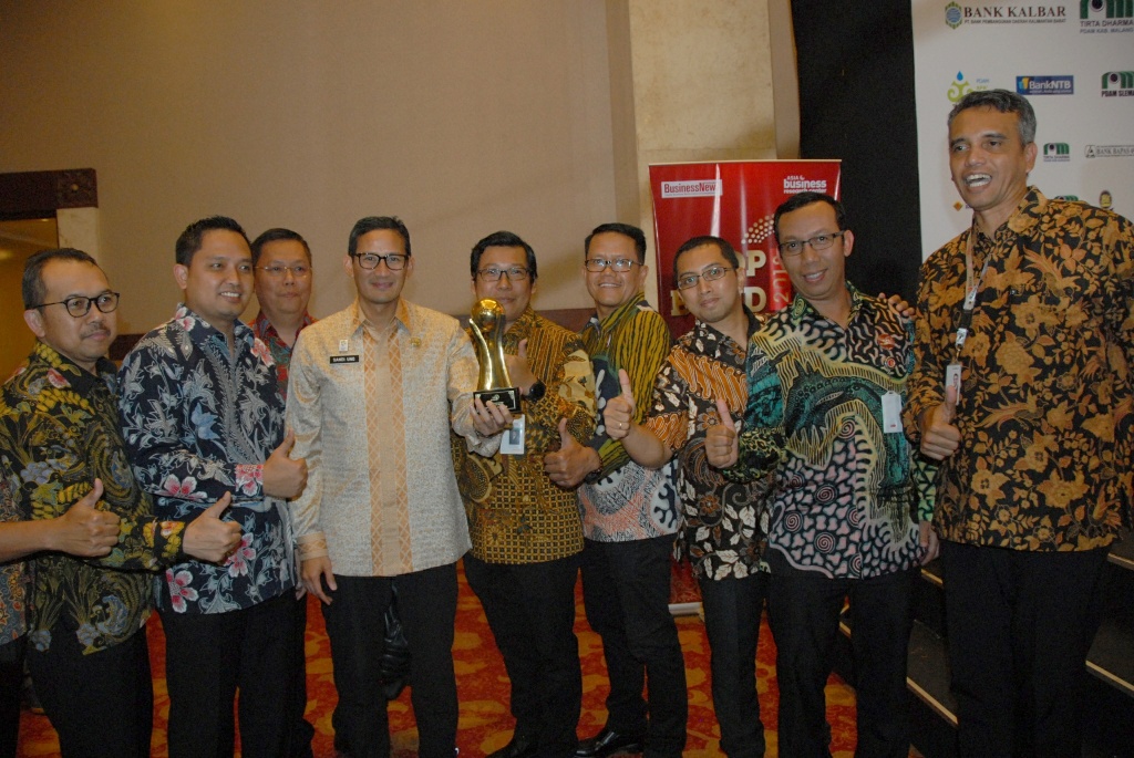 Wakil Gubernur DKI Jakarta, Sandiaga Uno memperlihatkan Piala TOP Pembina BUMD 2018 bersama dengan Direktur Keuangan Bank DKI, Sigit Prastowo dan Corporate Secretary Bank DKI, Zulfarshah dalam TOP BUMD 2018 award di Jakarta, Kamis (3/5/18). Dalam kesempatan tersebut Bank DKI juga menerima penghargaan TOP BUMD 2018 & TOP BPD BUKU III 2018. Total aset Bank DKI per Maret 2018 tercatat Rp 51,22 triliun dengan Laba per Maret 2018 tercatat Rp 167,43 miliar. Sebagai BUMD, Bank DKI terus mendukung program kerja DKI Jakarta, diantaranya implementasi transaksi non tunai di lingkungan Pemprov DKI Jakarta. AKTUAL/Dok Bank DKI