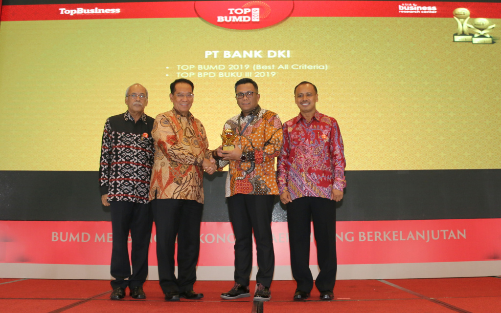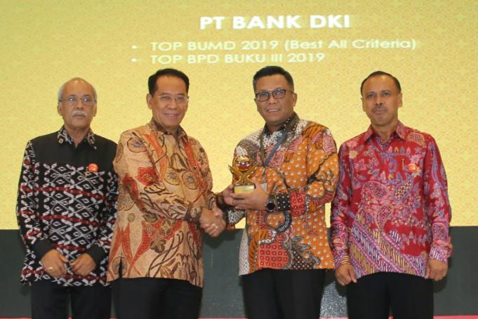 Sekretaris Perusahaan Bank DKI, Herry Djufraini (kedua kanan) menerima penghargaan TOP BUMD 2019 di Jakarta, Selasa (30/4/2019). Pada ajang penghargaan tersebut, Bank DKI menjadi BUMD terbaik dengan kategori TOP BUMD Best All Criteria dan TOP BPD BUKU III. Penghargaan ini merupakan apresiasi atas kinerja Bank DKI. Per Desember 2018, Bank DKI membukukan laba bersih sebersih Rp800,3 miliar atau meningkat 12,4% dibandingkan laba bersih pada periode yang sama di tahun sebelumnya sebesar Rp 712,2 miliar. AKTUAL/Dok Bank DKI