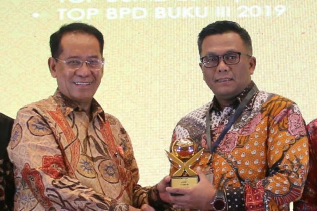 Sekretaris Perusahaan Bank DKI, Herry Djufraini (kanan) menerima penghargaan TOP BUMD 2019 di Jakarta, Selasa (30/4/2019). AKTUAL/Dok Bank DKI