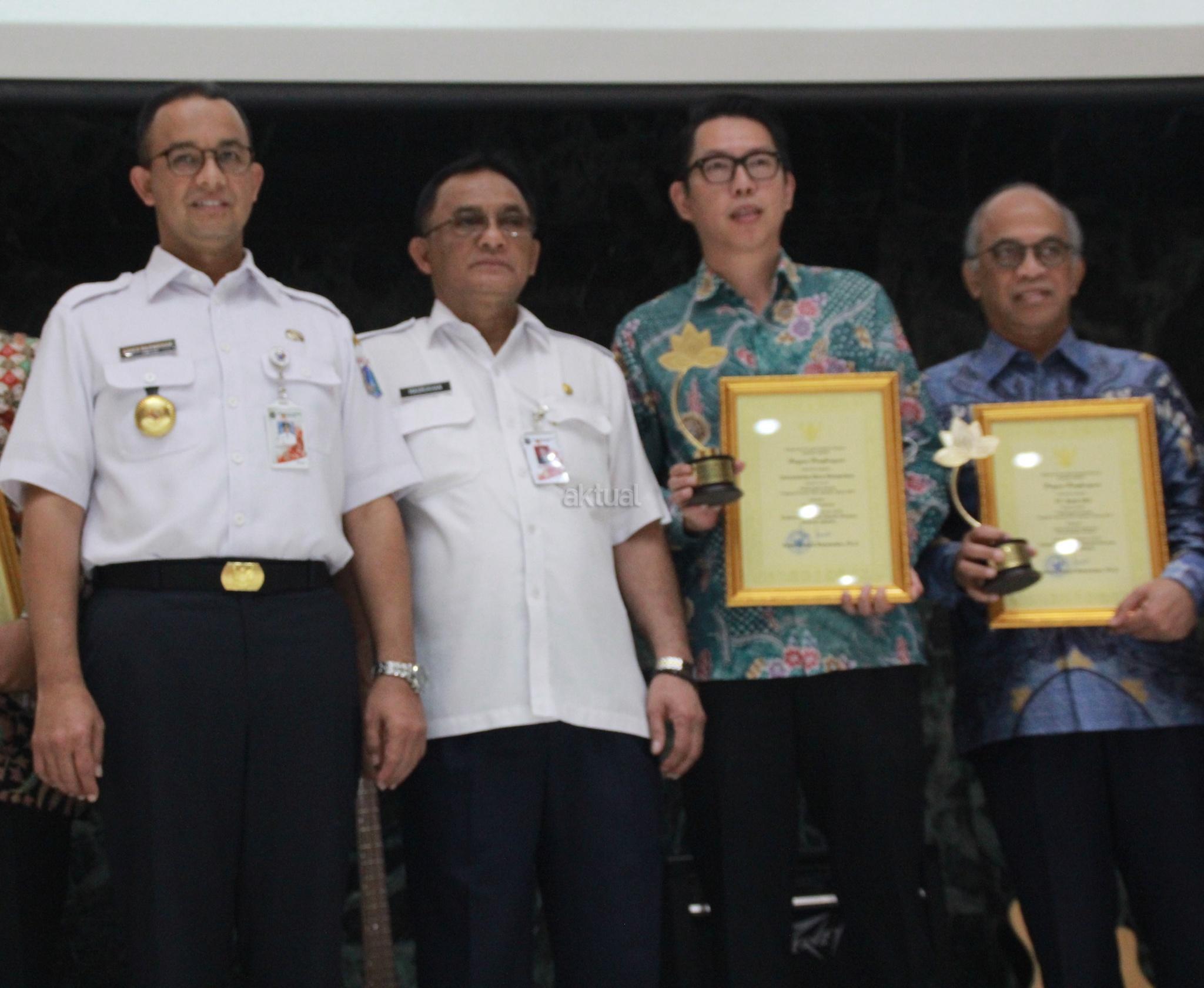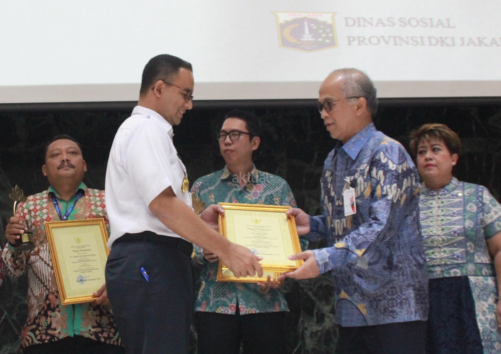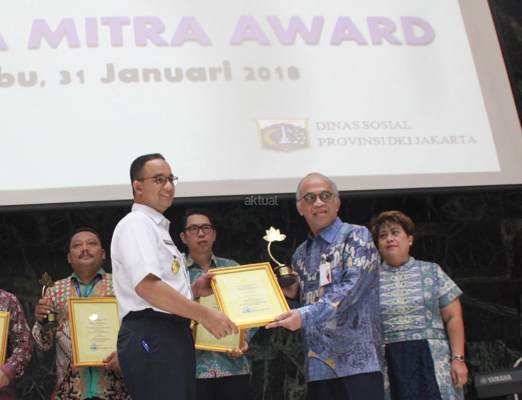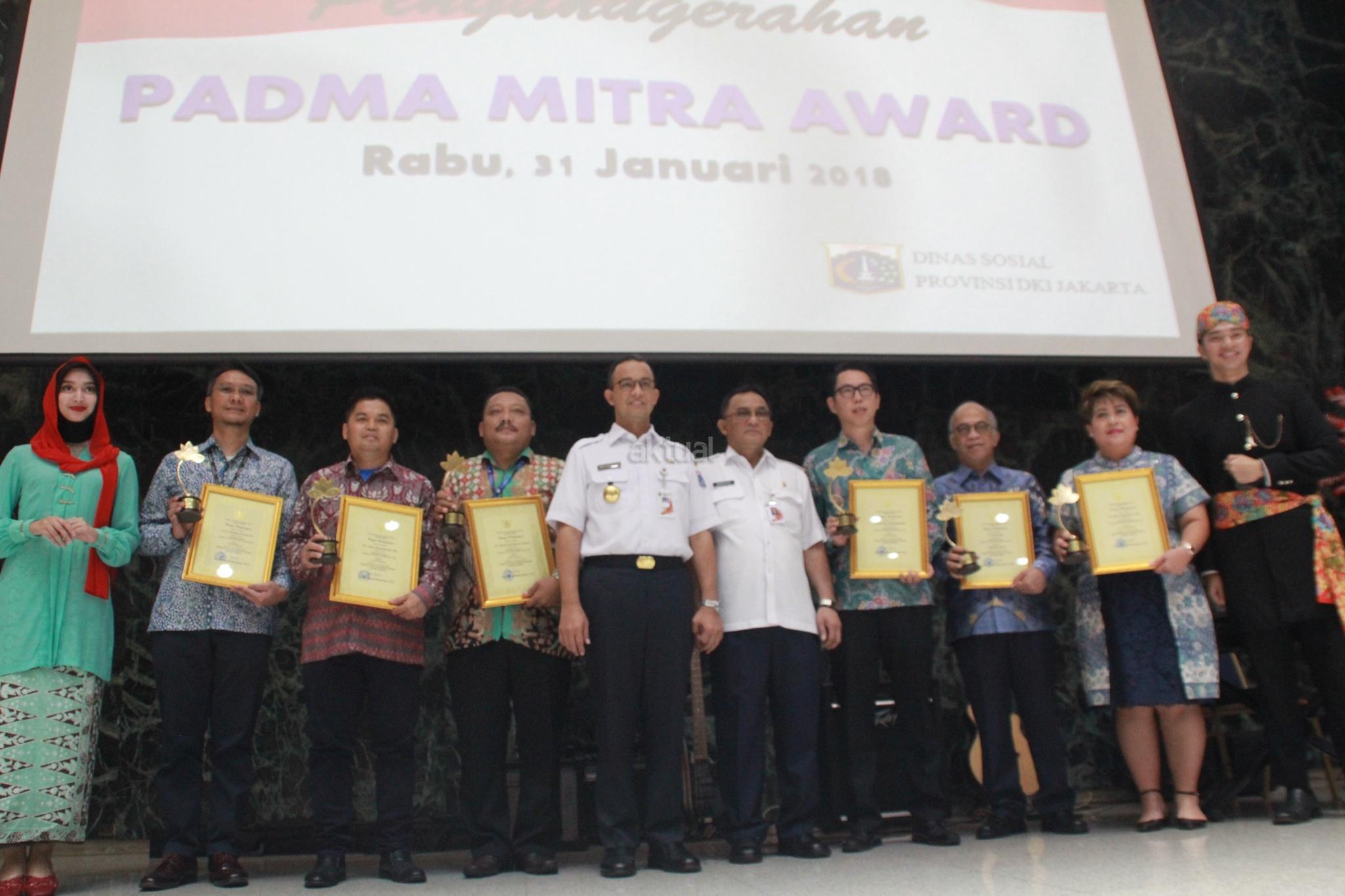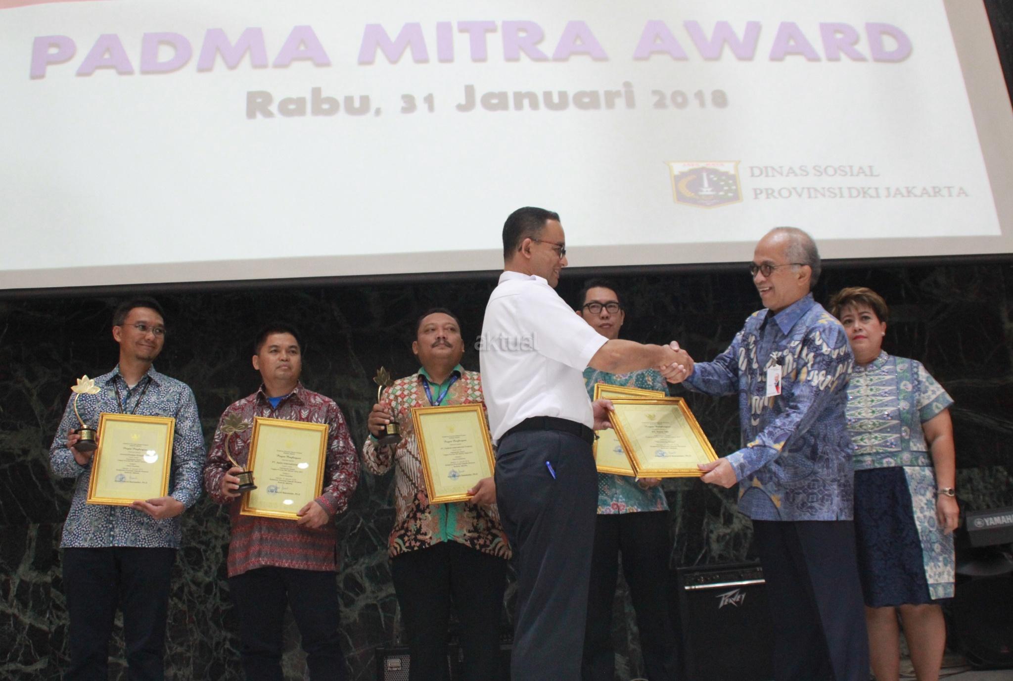 Gubernur DKI Jakarta, Anies Baswedan memberikan penghargaan Padmamitra Award kepada Direktur Utama Bank DKI, Kresno Sediarsi di Balaikota, Jakarta, Rabu (31/1). Bank DKI mendapatkan penghargaan Padmamitra Awards dari Dinas Sosial Pemerintah Provinsi DKI Jakarta. Sepanjang tahun 2017 Bank DKI telah merealisasikan CSR dengan nilai sebesar Rp 4.34 miliar. AKTUAL/Eko S Hilman