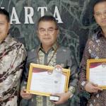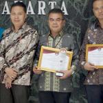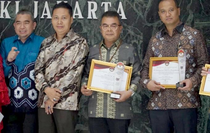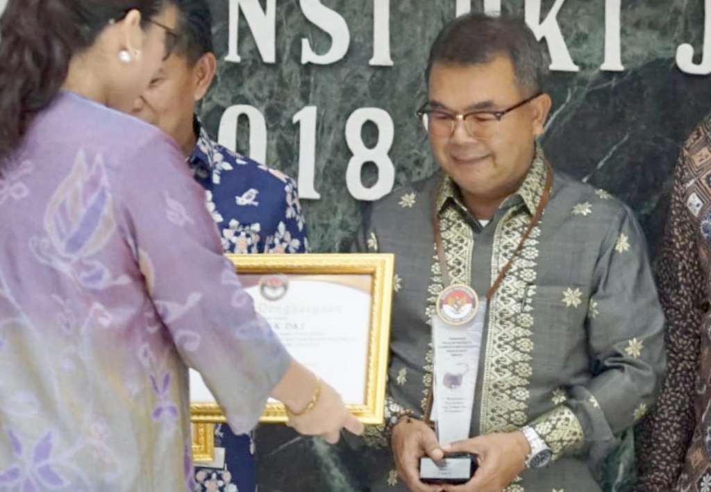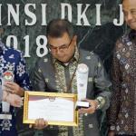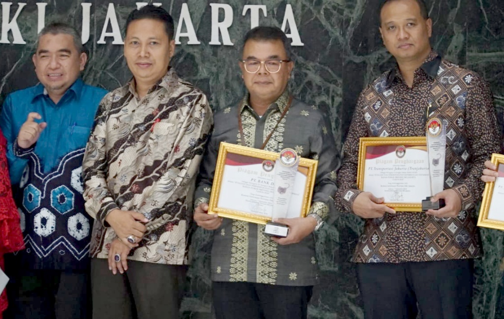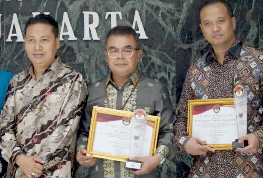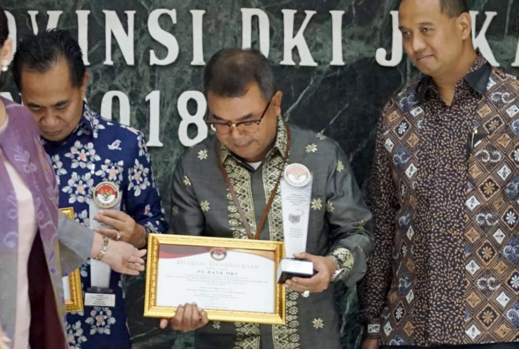 Direktur Utama Bank DKI Wahyu Widodo (kedua kanan) menerima penghargaan pada kategori BUMD dalam Evaluasi dan Pemeringkatan Keterbukaan Informasi Badan Publik Provinsi DKI Jakarta Tahun 2018 oleh Komisi Informasi DKI Jakarta, Jumat (7/12). Penghargaan ini merupakan bentuk komitmen Bank DKI dalam penerapan keterbukaan informasi publik. AKTUAL/Dok Bank DKI
