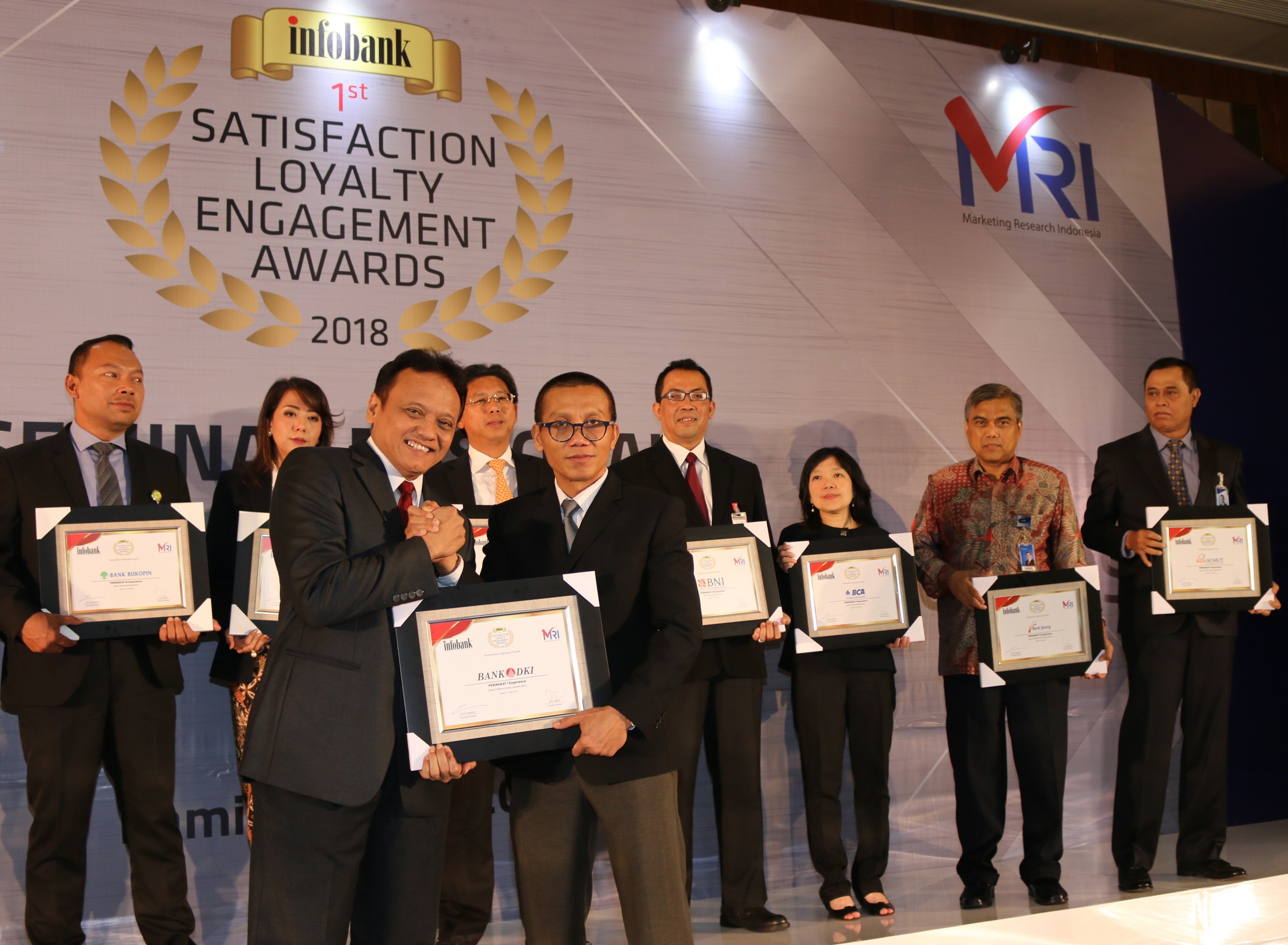 Direktur Teknologi & Informasi Bank DKI, Priagung Suprapto (kiri depan) menerima penghargaan Peringkat 1 kategori Experience Bank Pembangunan Daerah 2018 dari Wakil Pemimpin Redaksi Infobank, Karnoto Mohamad (kanan depan) dalam Infobank 1st Satisfaction Loyalty Engagement Awards 2018 di Jakarta, Jumat (17/5). Penghargaan yang diterima Bank DKI diantaranya 2 peringkat 1 untuk Experience Index dan Satisfaction Index, 3 peringkat 2 untuk kategori Satisfaction Index (kategori Fisik, dan ATM) dan 3 peringkat 3 kategori Satisfaction Index (untuk kategori satpam, customer service dan teller)peringkat 3 pada kategori Net Promoter Scope (yang menandakan tingkat kesediaan nasabah untuk merekomendasikan Bank DKI cukup tinggi). AKTUAL/Tino Oktaviano
