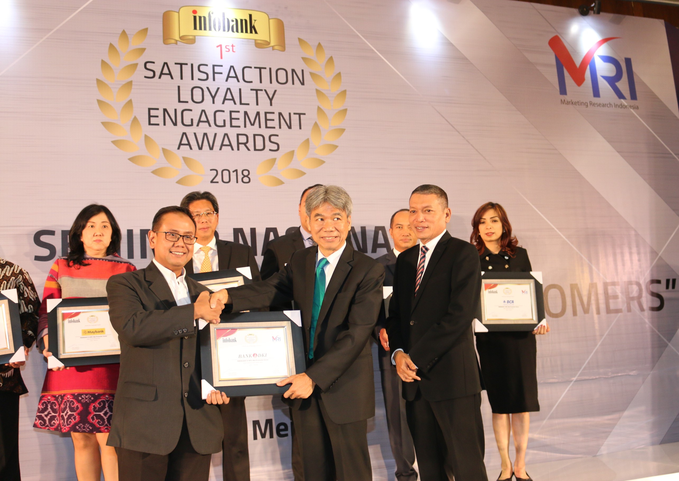 Pemimpin Grup Pengembangan Jaringan Bank DKI, Romi Wijayanto (kiri depan) menerima penghargaan Peringkat 1 kategori Satisfaction Bank Pembangunan Daerah 2018 dari Presiden Direktur MRI, Hari Puspito (tengah depan) dan Pemimpin Redaksi Infobank, Eko B Supriyanto (kanan depan) dalam Infobank 1st Satisfaction Loyalty Engagement Awards 2018 di Jakarta, Jumat (17/5). Penghargaan yang diterima Bank DKI diantaranya 2 peringkat 1 untuk Experience Index dan Satisfaction Index, 3 peringkat 2 untuk kategori Satisfaction Index (kategori Fisik, dan ATM) dan 3 peringkat 3 kategori Satisfaction Index (untuk kategori satpam, customer service dan teller)peringkat 3 pada kategori Net Promoter Scope (yang menandakan tingkat kesediaan nasabah untuk merekomendasikan Bank DKI cukup tinggi). AKTUAL/Tino Oktaviano