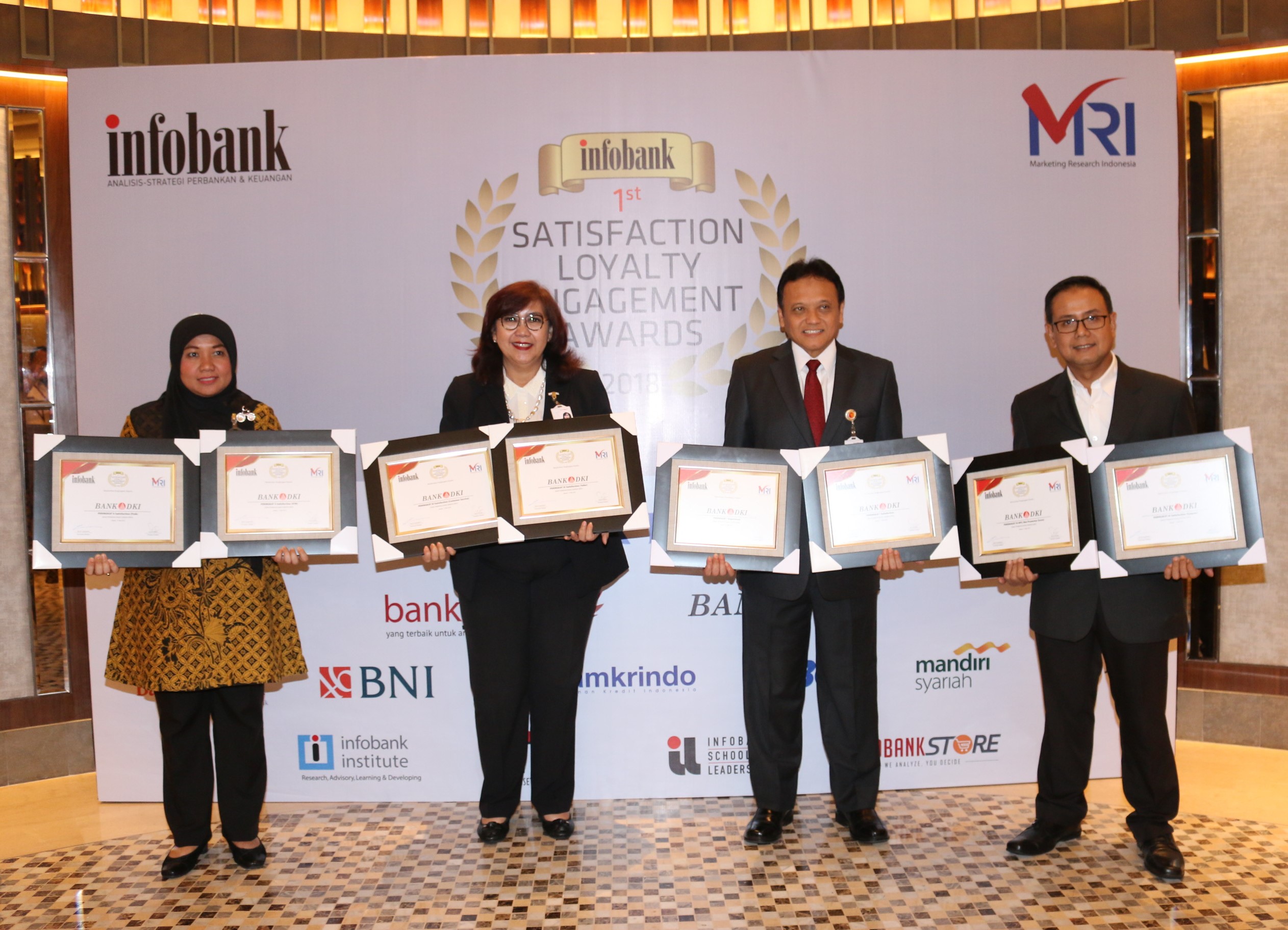 Direktur Teknologi & Informasi Bank DKI, Priagung Suprapto (kedua kanan) memperlihatkan 8 piagam pernghargaan yang dimenangkan Bank DKI bersama dengan Pemimpin Grup Pengembangan Jaringan Bank DKI, Romi Wijayanto (kanan) pada Infobank 1st Satisfaction Loyalty Engagement Awards 2018 di Jakarta, Jumat (17/5). Penghargaan yang diterima Bank DKI diantaranya 2 peringkat 1 untuk Experience Index dan Satisfaction Index, 3 peringkat 2 untuk kategori Satisfaction Index (kategori Fisik, dan ATM) dan 3 peringkat 3 kategori Satisfaction Index (untuk kategori satpam, customer service dan teller)peringkat 3 pada kategori Net Promoter Scope (yang menandakan tingkat kesediaan nasabah untuk merekomendasikan Bank DKI cukup tinggi). AKTUAL/Tino Oktaviano