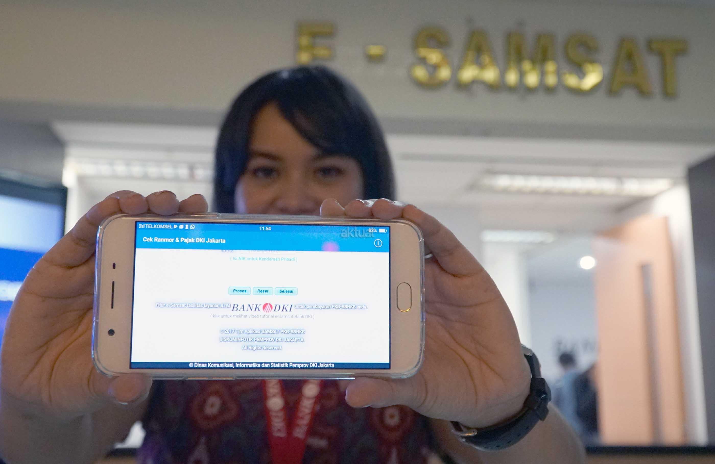 Karyawati Bank DKI memperlihatkan aplikasi informasi data dan pajak kendaraan bermotor DKI Jakarta saat peluncurannnya di Samsat Polda Metro Jaya,Jakarta (21/6). Peluncuran layanan publik di bidang lalu lintas berbasis IT tersebut diharapkan dapat memberikan dan melengkapi serta mendukung E samsat yakni sistem antrian baru di gedung Pelayanan Satu Atap (PSA) serta layanan Less cash dengan menyediakan loket transaksi non tunai yang telah ada sebelumnya. Saat ini, layanan E Samsat juga sudah dapat dilakukan via aplikasi jakmobile Bank DKI. AKTUAL/Eko S Hilman