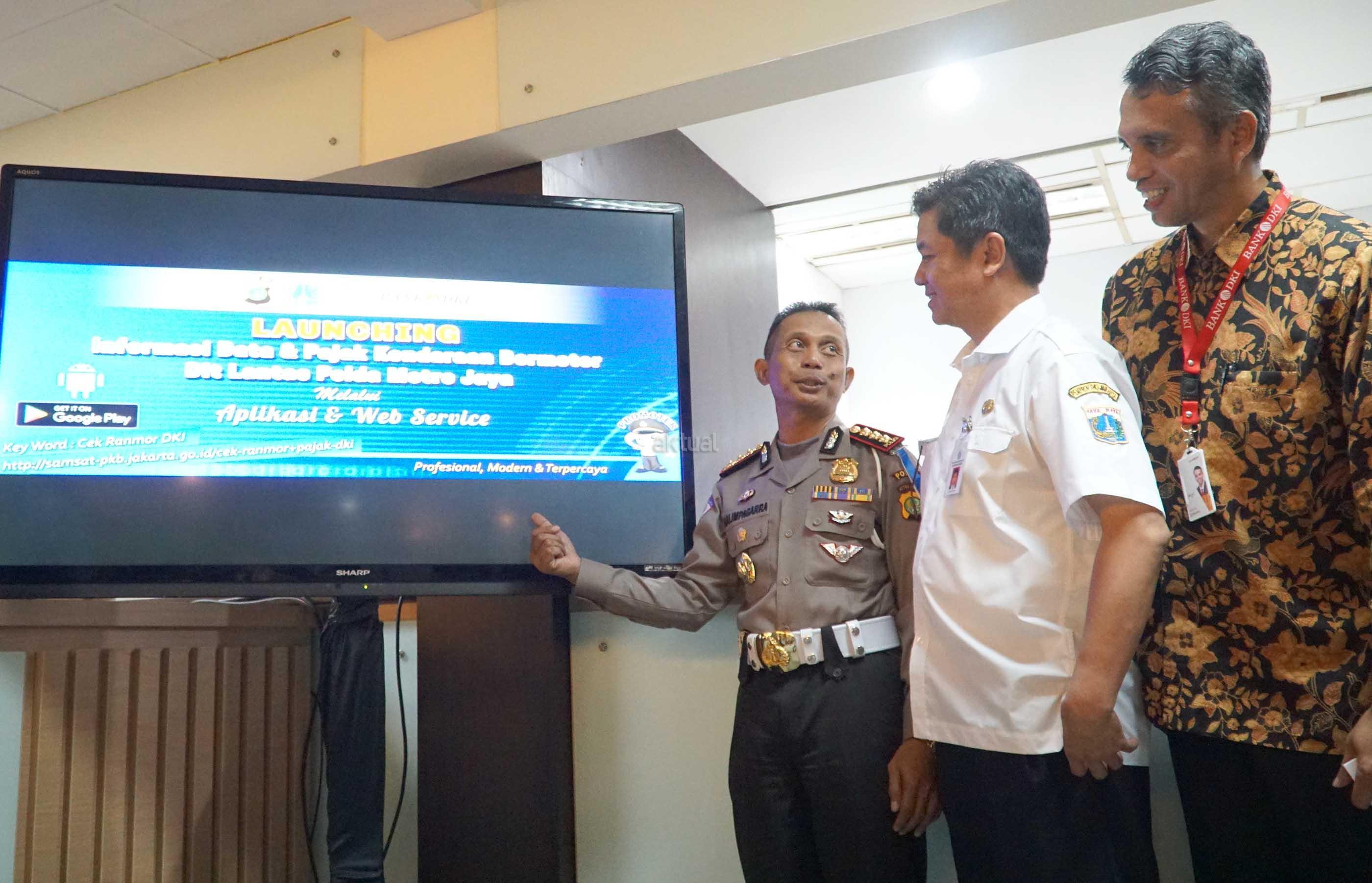 (dari kiri ke kanan) Dirlantas Polda Metro Jaya, Kombes Polisi Drs Halim Pagarra,Kepala Badan pajak dan Restribusi DKI Jakarta, Edi Sumantri serta Corporate Secretary PT Bank DKI, Zulfarshah berbincang disela peluncuran informasi data dan pajak kendaraan bermotor DKI Jakarta di Samsat Polda Metro Jaya,Jakarta (21/6). Peluncuran layanan publik di bidang lalu lintas berbasis IT tersebut diharapkan dapat memberikan dan melengkapi serta mendukung E samsat yakni sistem antrian baru di gedung Pelayanan Satu Atap (PSA) serta layanan Less cash dengan menyediakan loket transaksi non tunai yang telah ada sebelumnya. Saat ini, layanan E Samsat juga sudah dapat dilakukan via aplikasi jakmobile Bank DKI. AKTUAL/Eko S Hilman