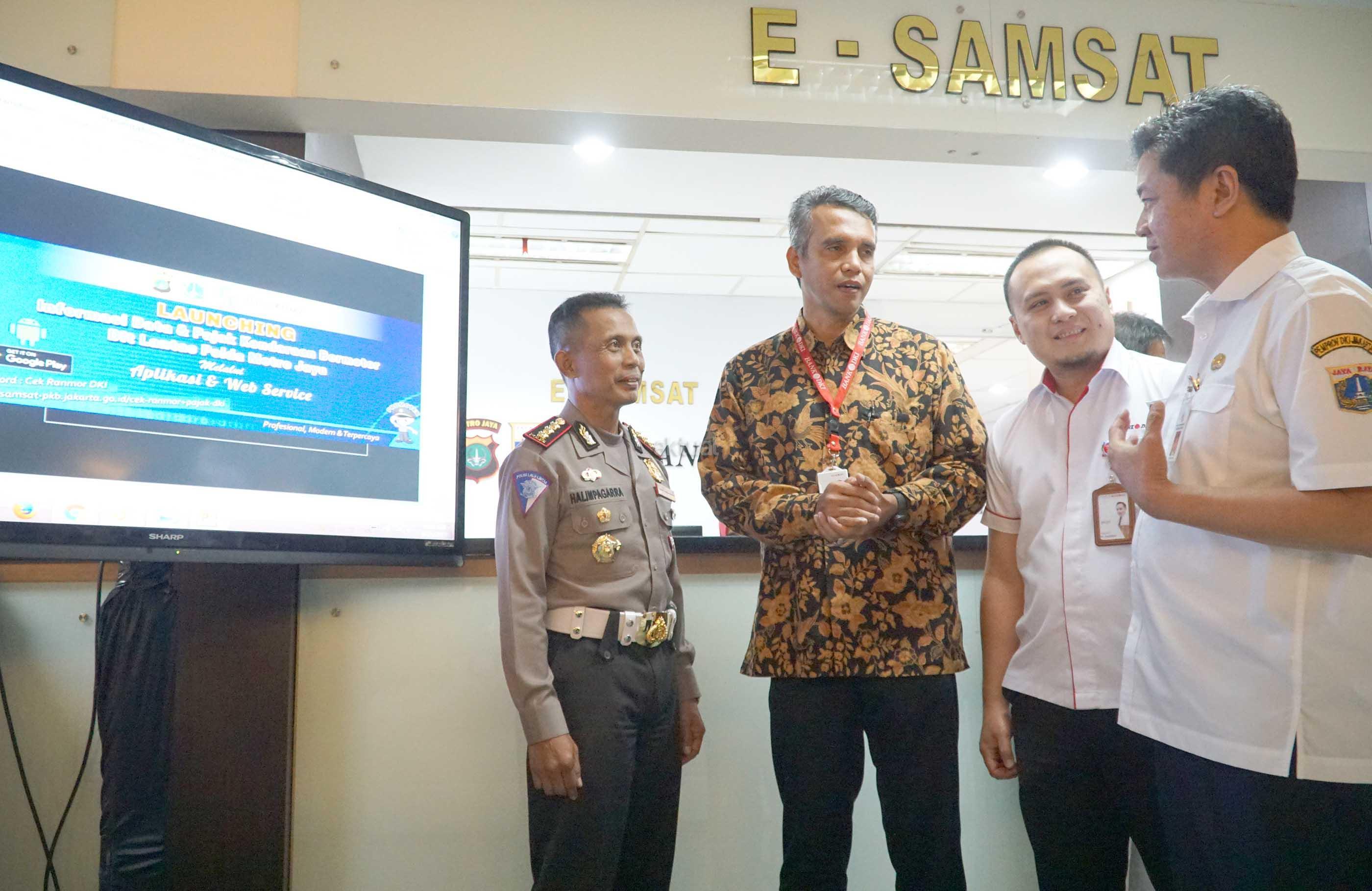 (dari kiri ke kanan) Dirlantas Polda Metro Jaya, Kombes Polisi Drs Halim Pagarra, Corporate Secretary PT Bank DKI, Zulfarshah, Pemimpin Capem Samsat Polda, Muhammad Fatahilah, dan Kepala Badan pajak dan Restribusi DKI Jakarta, Edi Sumantri berbincang disela peluncuran informasi data dan pajak kendaraan bermotor DKI Jakarta di Samsat Polda Metro Jaya,Jakarta (21/6). Peluncuran layanan publik di bidang lalu lintas berbasis IT tersebut diharapkan dapat memberikan dan melengkapi serta mendukung E samsat yakni sistem antrian baru di gedung Pelayanan Satu Atap (PSA) serta layanan Less cash dengan menyediakan loket transaksi non tunai yang telah ada sebelumnya. Saat ini, layanan E Samsat juga sudah dapat dilakukan via aplikasi jakmobile Bank DKI. AKTUAL/Eko S Hilman