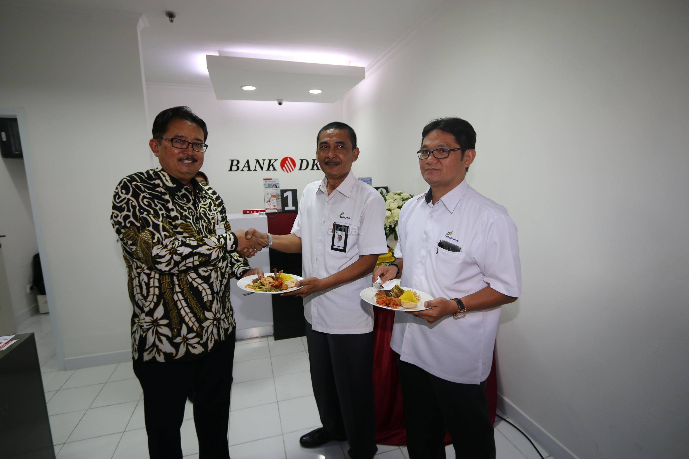 Direktur Bisnis Bank DKI, Antonius Widodo (kiri) berbincang dengan Manager Area Selatan PD.Pasar Jaya, Asrul Rizal (kedua kanan) dan Kepala PD Pasar Jaya Blok M Square, Istiawan Cahyo Adi (kanan) di Jakarta, Selasa (25/07). Sampai dengan Juli 2017, Bank DKI telah mempunyai kantor layanan di pasar kelolaan PD Pasar Jaya sebanyak 24 unit. Pembukaan kantor layanan di sejumlah pasar merupakan upaya Bank DKI untuk meningkatkan kredit pada segmen UMKM dengan menjangkau lebih banyak pelaku dan pedagang UMKM di Jakarta sekaligus sebagai bentuk peningkatan sinergi BUMD. AKTUAL/Eko S Hilman